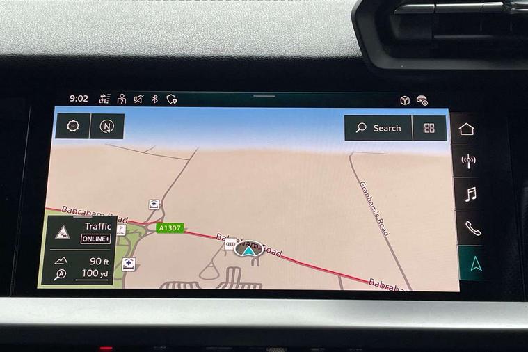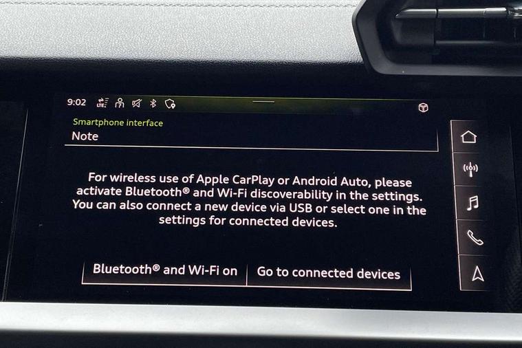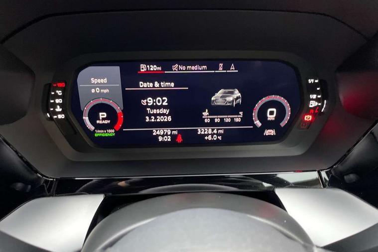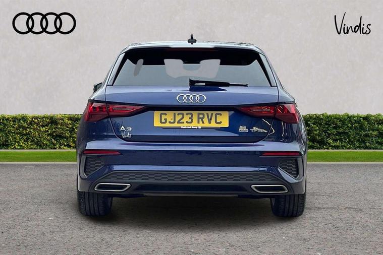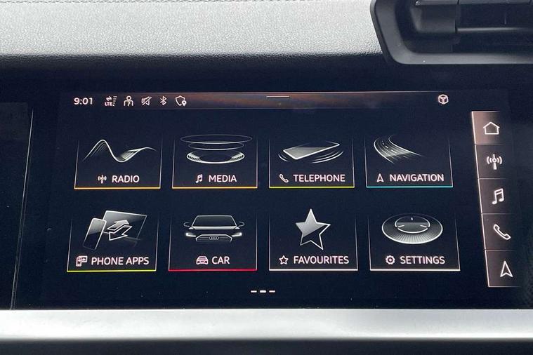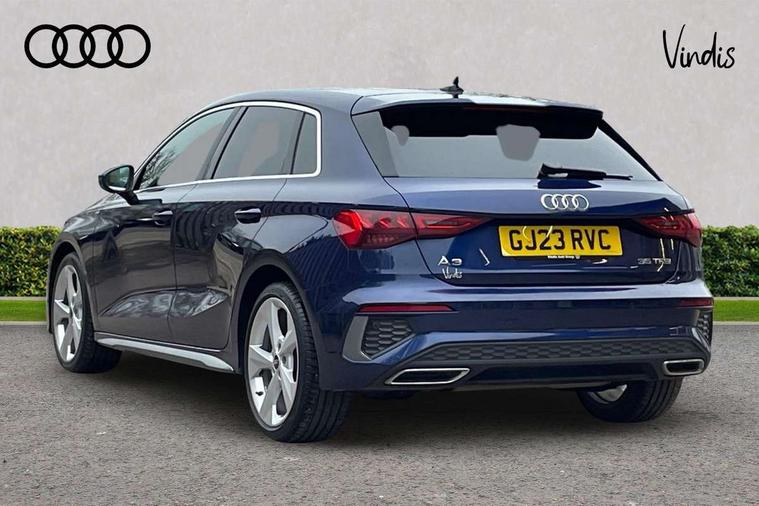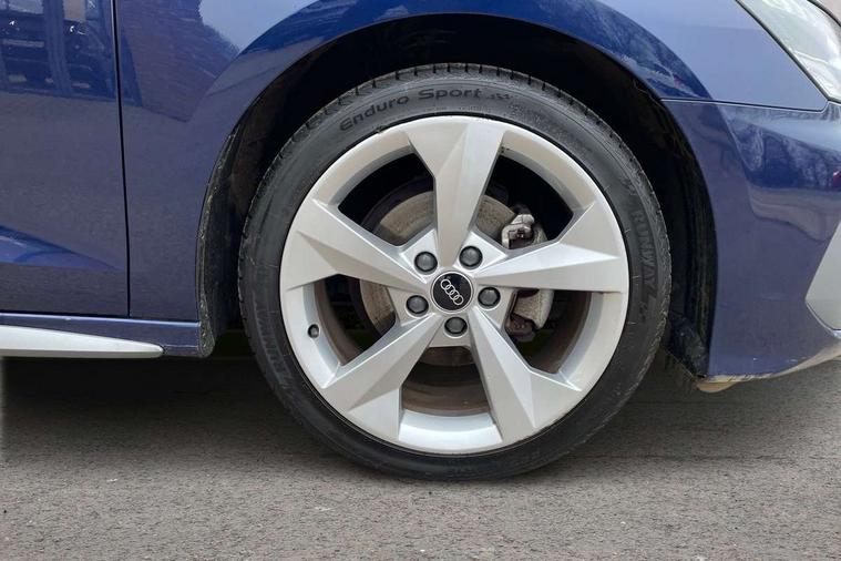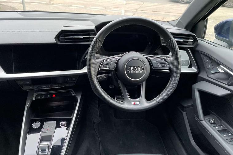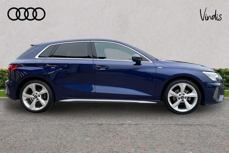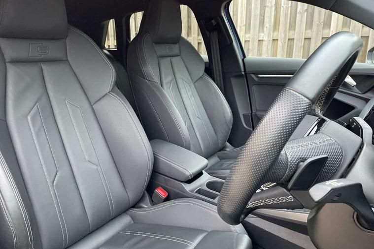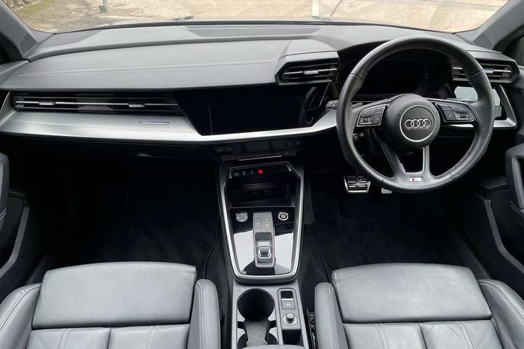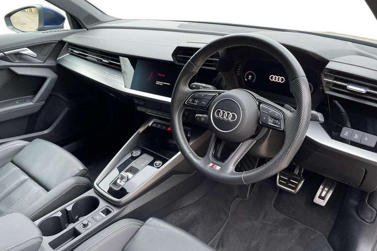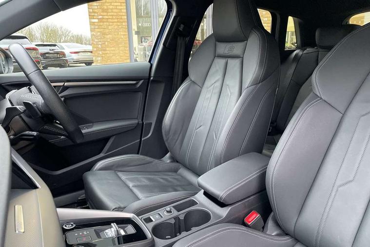 Accent surfaces in the dashboard and centre console in platinum grey silk effect paint finish, Dark spectrum aluminium inlays, Aluminium interior elements pack - A3 Sportback, LED interior lighting pack - A3 Sportback, S line styling pack - A3 Sportback, Anti theft alarm, Anti-theft wheel bolts, Electronically operated child lock, Immobiliser, Remote control central locking, 2xUSB-C connection with data and charging functions, 6 passive loudspeakers, DAB Digital radio, 3x3 point rear seat belts, Audi pre sense front, Driver and front passenger airbag with passenger airbag deactivation, Electronic Stabilisation Control (ESC) including ABS, ASR and EDL, First aid kit with warning triangle and 2 safety vests, Front side airbags with head airbags and interaction airbag, Pre-sense front with pedestrian and cyclist detection, Seatbelt monitoring, Tyre pressure loss indicator, 3rd brake light, Acoustic glass windscreen, Aluminium window trim, Auto dimming frameless rear view mirror, Body colour exterior mirrors, Electrically adjustable/heated/folding/dimming door mirrors with kerb view includes integrated LED indications + kerb view function for passenger side, Front electric windows, Illuminated aluminium inserts front door sills with S logo, LED daytime running lights, LED headlights with LED rear lights and dynamic rear indicators, Light and rain sensors, Privacy glass - dark tinted rear window, rear door and side windows, Rear electric windows, Rear side air outlets in grained matt black, Rear side wing doors, Rear wiper, S line bumpers, S roof spoiler, 12V socket and storage compartment in front centre console, 3 seat bench in 2nd row, 3 spoke leather multifunction steering wheel with paddle shift, 40/20/40 split folding rear seat bench with cupholder, Black cloth headlining, Dual zone electronic climate control, Front and rear centre armrest in leather, Front and rear headrests, Front/rear floor mats, Height and reach adjustable steering wheel, Illuminated vanity mirror, Interior lighting - glove compartment light and right hand side, Luggage compartment floor covering, Manual boot compartment lid, Manually adjustable front seats, Seat side bolsters, Single front passenger seat, Stainless steel pedals and front footrest in black, Twin leather upholstery with front sports seats S embossed logo, Audi drive select (Auto, Comfort, Dynamic, Efficiency and Individual), Audi smartphone interface, Audi Virtual Cockpit - 10.25" digital and colour instrument cluster, Automatic start/stop system with recuperation, Bluetooth interface, Collision avoidance assistant, e-Call (emergency call), Electromechanical power speed sensitive steering, Lane departure warning system, MMI Navigation Plus with high resolution 10.1" colour touch screen display, Service indicator, Trip computer, Voice control system with natural language interaction, Sports suspension,