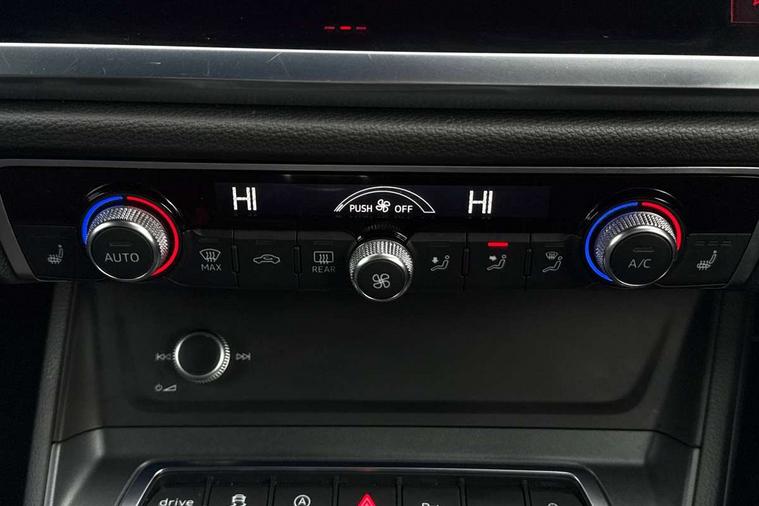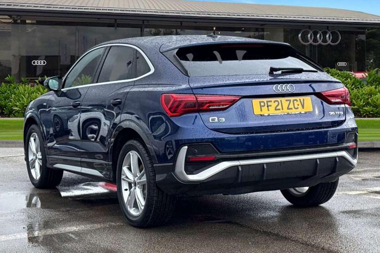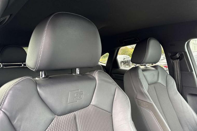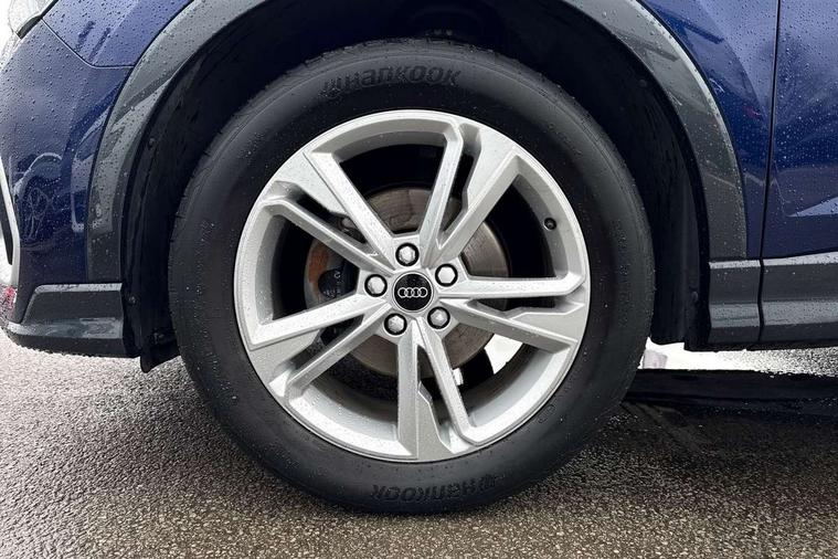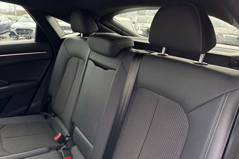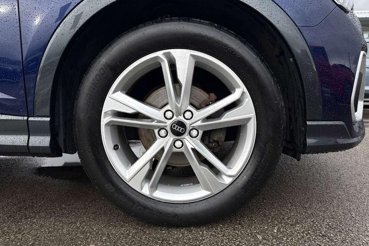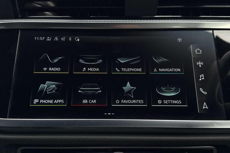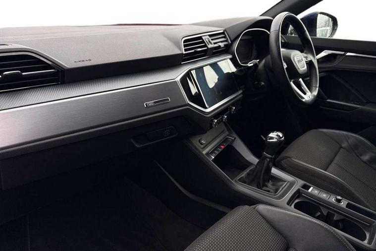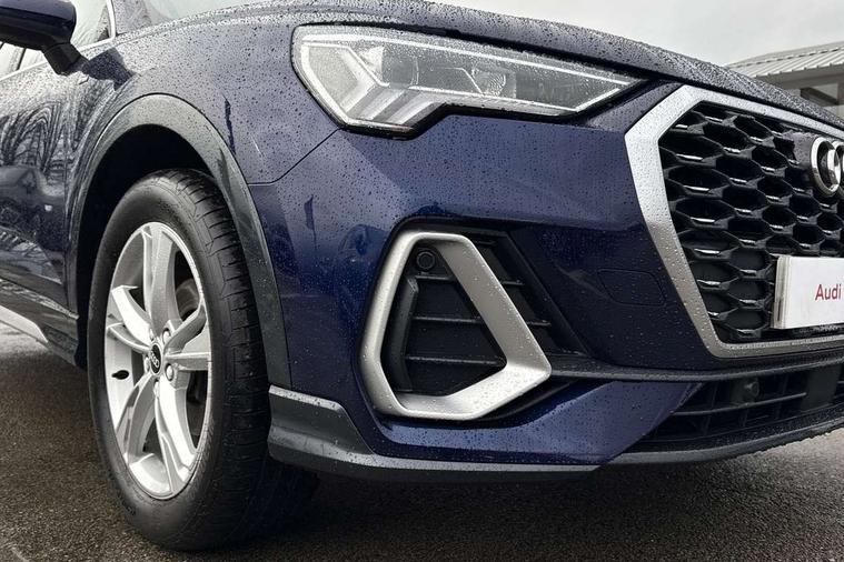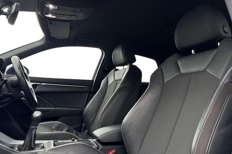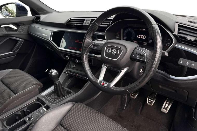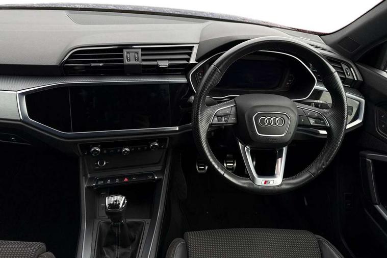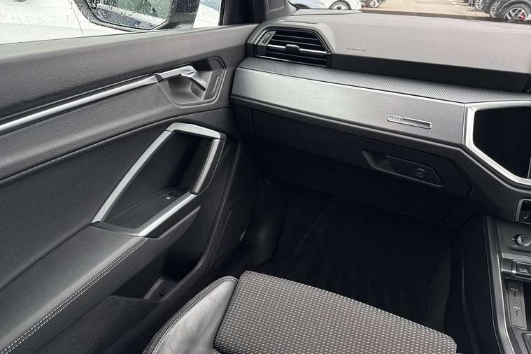 Black dashboard, Dark matt brushed aluminium inlay, Detail dashboard around MMI touch colour display in glass look, black with surround in aluminium look, Leatherette door armrest, Non smoking pack - Q3, Anti theft alarm, Anti theft wheel bolts, Remote central locking, 2 USB-C ports with charge and data functions, 6 passive loudspeakers, DAB digital radio module, 3x3 point rear seatbelts, 6 airbags - Driver, front passenger, curtain and side windows, Audi pre-sense front with pedestrain and cyclist recognition, Electrically operated child locks on rear doors, Electromechanical parking brake, Electronic stabilisation control including ABS, ASR and EDL, Hill descent control, Hill hold assist, Pre sense basic, Seatbelt monitoring, Tyre pressure warning, Warning triangle and first aid kit, Acoustic windscreen, Aluminium window trim, Auto dimming frameless rear view mirror, Diffuser grille in grained matt black, Diffuser trim in selenite silver, Electrically folding, adjustable and heated door mirrors with integrated LED side indicators and kerb view function for passenger side, Front and rear electric windows, Front fog lights, Front side air inlets in selenite silver, Front underbody protection in manhattan grey paint finish, Grille surround in aluminium silver matt, High gloss black finish B and C pillars, LED headlights with LED daytime running lights and dynamic rear indicator, LED rear lights, Privacy glass dark tinted rear and rear-side windows (from B-pillar backwards), Radiator grille in titanium black with inlay in matt aluminium silver, Rain and light sensors, Rear underbody protection in matt black, S line badges on front wings, Side skirt insert in matt Platinium grey, 12V socket in rear centre console, 40:20:40 folding with manual adjustment for 60:40 forwards/backwards position and backrest angle, Adjustable rear seat bench/backrest with centre armrest and cupholder, Black cloth headlining, Dual zone electronic climate control, Front and rear black floor mats with contrast stitching, Front and rear headrests, Front and rear roof module including reading lights, Front centre armrest, Glove compartment lighting, Height and reach adjustable steering wheel, Illuminated door sill trims with S logo, ISOFIX child seat mounting for front passenger with airbag deactivation and outer rear seat including top tether attachment point for outer rear seats, Luggage compartment light, Manual front seats with height adjustment, Perforated leather gearknob, Stainless steel luggage compartment sill finisher, Stainless steel pedals, Audi connect safety and service (e-call), Audi drive select, Audi lane departure warning, Audi smartphone interface includes wireless Apple carplay/Android Auto, Audi Virtual Cockpit - 10.25" display, Bluetooth interface, Camera based traffic sign recognition, Cruise control + speed limiter, MMI Navigation Plus with high resolution 10.1 inch touchscreen colour display, Power operated tailgate, Progressive steering, Rear parking sensors, Service interval indicator, Start stop system with recuperation, Voice control system with natural language interaction, Sports suspension,