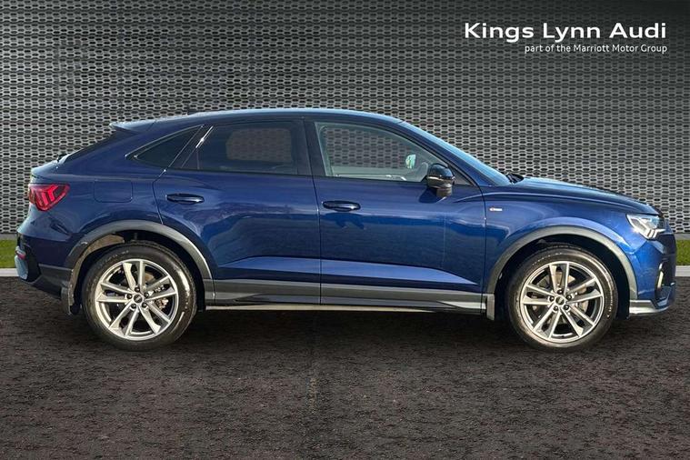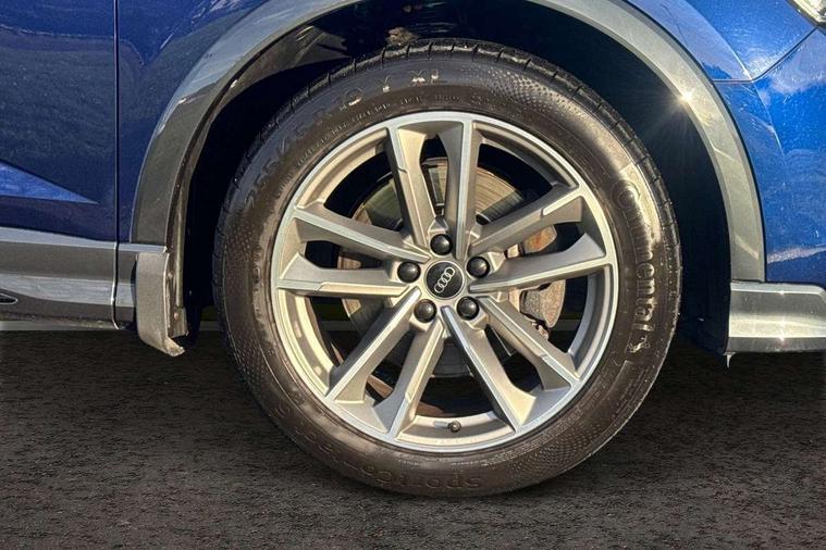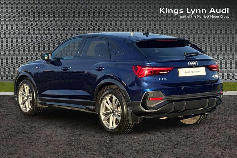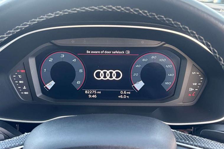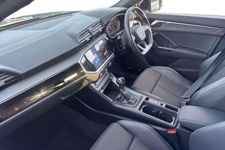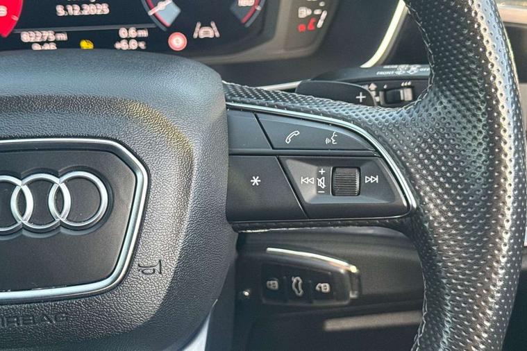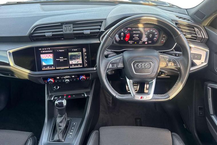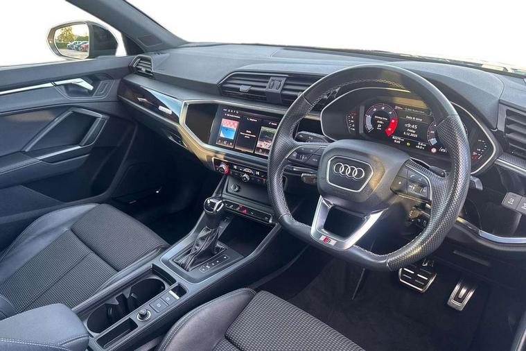Aluminium look interior elements, Black dashboard, Detail dashboard around MMI touch colour display in glass look, black with surround in aluminium look, Leatherette door armrest, Piano black inlay, Ambient lighting pack - Q3, Black styling pack - Q3, Non smoking pack - Q3, 19" 5 twin arm design diamond cut audi sport alloy wheels in matt grey look, Anti theft alarm, Anti theft wheel bolts, Immobiliser, Remote central locking, 2 USB-C ports with charge and data functions, 6 passive loudspeakers, DAB digital radio module, 3x3 point rear seatbelts, 6 airbags - Driver, front passenger, curtain and side windows, Audi pre-sense front with pedestrain and cyclist recognition, Electrically operated child locks on rear doors, Electromechanical parking brake, Electronic stabilisation control including ABS, ASR and EDL, Front seatbelt reminder, Hill descent control, Hill hold assist, Pre sense basic, Seatbelt monitoring, Tyre pressure warning, Warning triangle and first aid kit, Acoustic windscreen, Auto dimming frameless rear view mirror, Diffuser grille in grained matt black, Diffuser trim in selenite silver, Electrically folding, adjustable and heated door mirrors with integrated LED side indicators and kerb view function for passenger side, Front and rear electric windows, Front fog lights, Front underbody protection in manhattan grey paint finish, High gloss black finish B and C pillars, LED Dynamic rear indicators, LED headlights with LED daytime running lights, LED rear lights, LED third brake light, Privacy glass dark tinted rear and rear-side windows (from B-pillar backwards), Rain and light sensors, Rear side wing doors, Rear underbody protection in matt black, Rear wiper, Variable front intermittent wipers, 12V socket in rear centre console, 3 seat bench in 2nd row, 40:20:40 folding with manual adjustment for 60:40 forwards/backwards position and backrest angle, Adjustable rear seat bench/backrest with centre armrest and cupholder, Black cloth headlining, Dual zone electronic climate control, Front and rear black floor mats with contrast stitching, Front and rear headrests, Front and rear roof module including reading lights, Front centre armrest, Glove compartment lighting, Height and reach adjustable steering wheel, Illuminated door sill trims with S logo, ISOFIX child seat mounting for front passenger with airbag deactivation and outer rear seat including top tether attachment point for outer rear seats, Luggage compartment light right in white, Luggage compartment sill protection in stainless steel, Manual front seats with height adjustment, Perforated leather gearknob, Single front passenger seat, Stainless steel pedals, Audi drive select, Audi lane departure warning, Audi smartphone interface includes wireless Apple carplay/Android Auto, Audi Virtual Cockpit - 10.25" display, Bluetooth interface, Camera based traffic sign recognition, Legal emergency call, MMI Navigation Plus with high resolution 10.1 inch touchscreen colour display, Power operated tailgate, Progressive steering, Service interval indicator, Start stop system with recuperation, Voice control system with natural language interaction, Diesel particulate filter, Sports suspension,