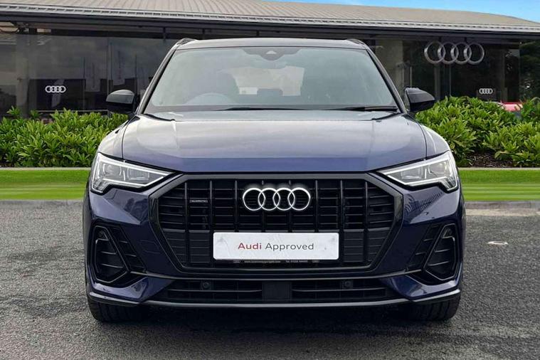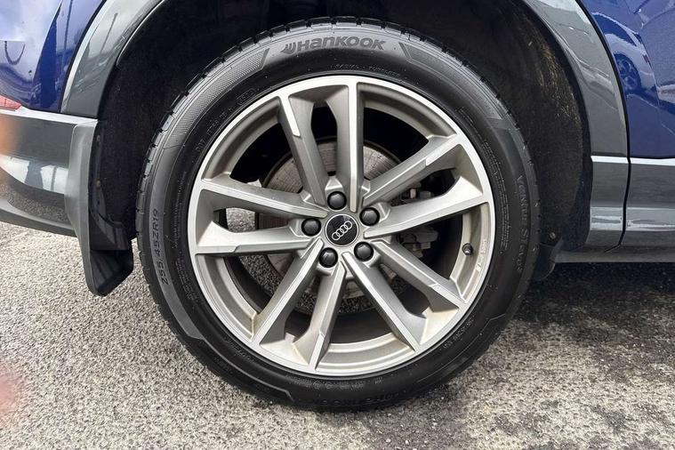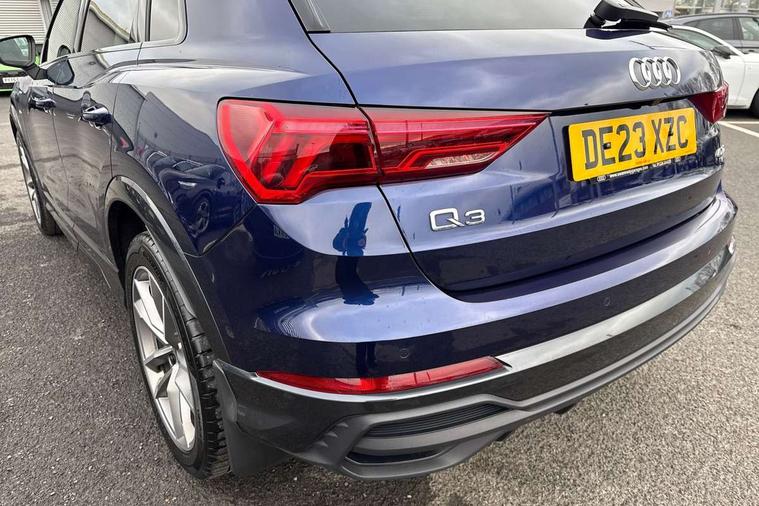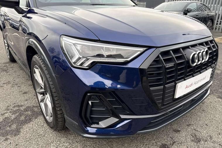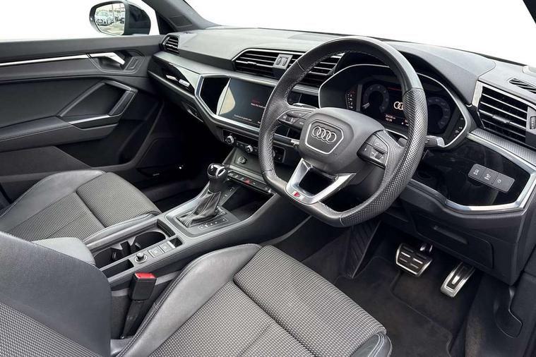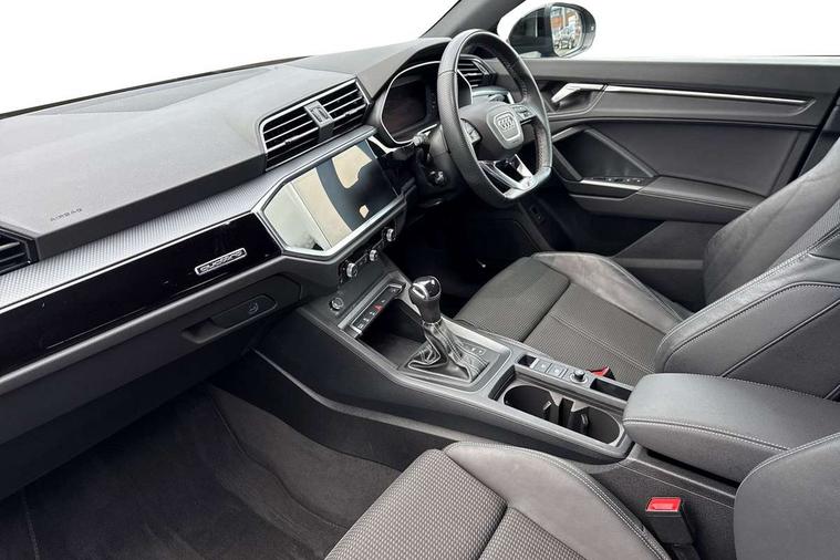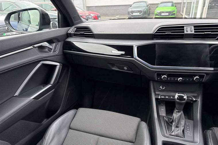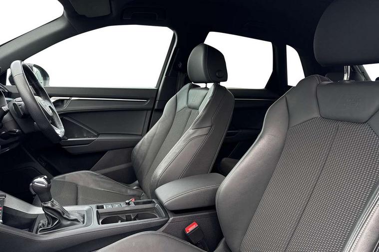 Aluminium look interior elements, Detail dashboard around MMI touch colour display in glass look, black with surround in aluminium look, Leatherette door armrest, Piano black inlay, Ambient lighting pack - Q3, Black styling pack - Q3, Non smoking pack - Q3, 19" 5 twin arm design diamond cut audi sport alloy wheels in matt grey look, Anti theft alarm, Anti theft wheel bolts, Immobiliser, Remote central locking, 2 USB-C ports with charge and data functions, 6 passive loudspeakers, DAB digital radio module, 3x3 point rear seatbelts, 6 airbags - Driver, front passenger, curtain and side windows, Audi pre-sense front with pedestrain and cyclist recognition, Electrically operated child locks on rear doors, Electromechanical parking brake, Electronic stabilisation control including ABS, ASR and EDL, Front seatbelt reminder, Hill descent control, Hill hold assist, Pre sense basic, Seatbelt monitoring, Tyre pressure warning, Warning triangle and first aid kit, Acoustic windscreen, Auto dimming frameless rear view mirror, Black roof rails, Electrically folding, adjustable and heated door mirrors with integrated LED side indicators and kerb view function for passenger side, Front and rear electric windows, Front fog lights, Grille vertical bars in aluminium silver/Matt, High gloss black finish B and C pillars, LED Dynamic rear indicators, LED headlights with LED daytime running lights, LED rear lights, LED third brake light, Privacy glass dark tinted rear and rear-side windows (from B-pillar backwards), Rain and light sensors, Rear diffuser grille in grained matt black, Rear diffuser strip in matt anthracite black, Rear side wing doors, Rear wiper, S line bumpers in contrasting Manhattan grey, Variable front intermittent wipers, 12V socket in rear centre console, 3 seat bench in 2nd row, 40:20:40 folding with manual adjustment for 60:40 forwards/backwards position and backrest angle, Adjustable rear seat bench/backrest with centre armrest and cupholder, Black cloth headlining, Dual zone electronic climate control, Front and rear black floor mats with contrast stitching in rock grey, Front and rear headrests, Front and rear roof module including reading lights, Front centre armrest, Glove compartment lighting, Height and reach adjustable steering wheel, Illuminated door sill trims with S logo, ISOFIX child seat mounting for front passenger with airbag deactivation and outer rear seat including top tether attachment point for outer rear seats, Luggage compartment light, Manual front seats with height adjustment, Perforated leather gearknob, Single front passenger seat, Stainless steel luggage compartment sill finisher, Stainless steel pedals, Amazon alexa Integration, Audi drive select, Audi lane departure warning, Audi smartphone interface includes wireless Apple carplay/Android Auto, Audi Virtual Cockpit - 10.25" display, Bluetooth interface, Camera based traffic sign recognition, Legal emergency call, MMI Navigation Plus with high resolution 10.1 inch touchscreen colour display, Power operated tailgate, Progressive steering, Service interval indicator, Start stop system with recuperation, Voice control system with natural language interaction, Diesel particulate filter, Sports suspension,