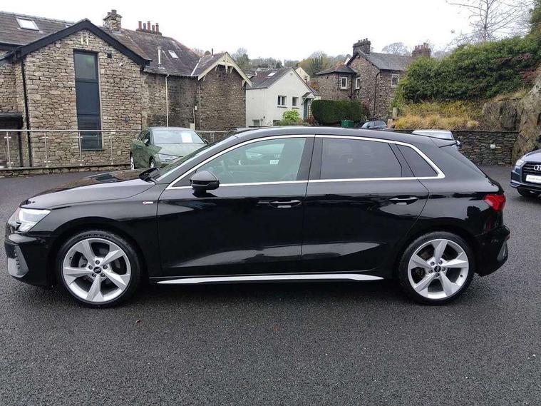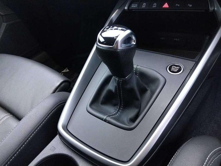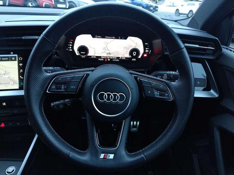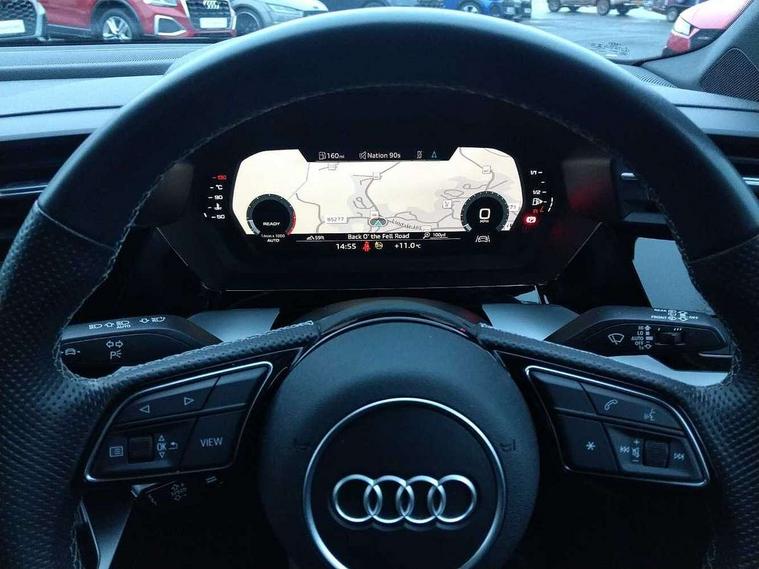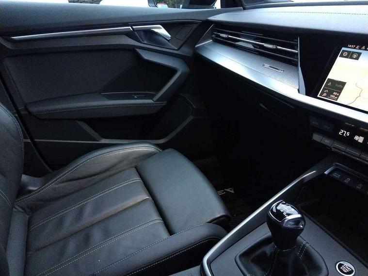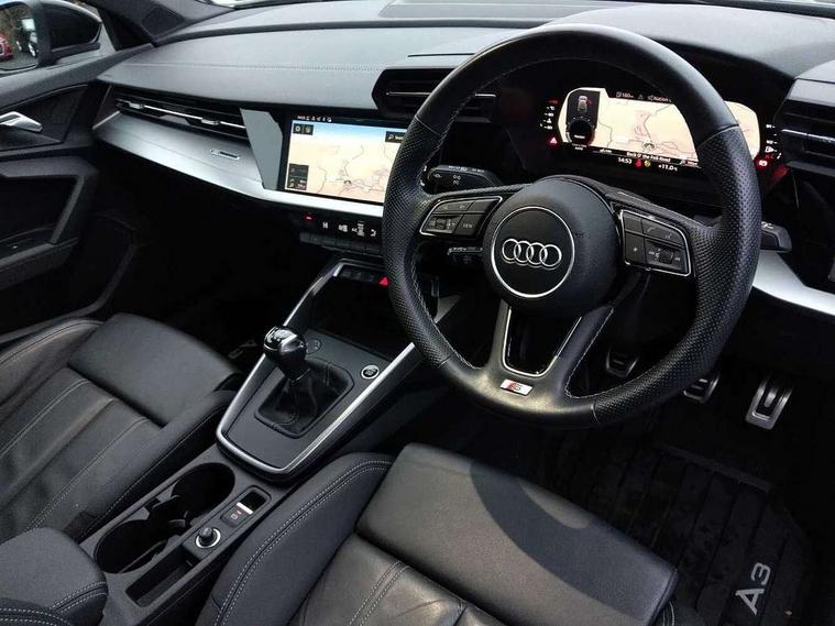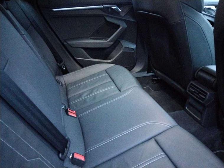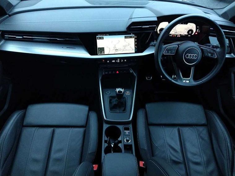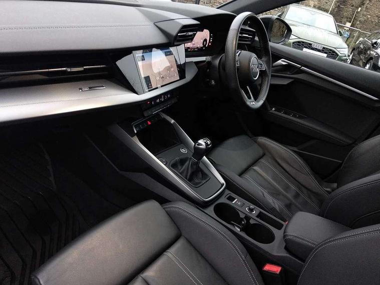 Accent surfaces in the dashboard and centre console in platinum grey silk effect paint finish, Dark spectrum aluminium inlays, Aluminium interior elements pack - A3 Sportback, LED interior lighting pack - A3 Sportback, S line styling pack - A3 Sportback, Anti theft alarm, Anti-theft wheel bolts, Electronically operated child lock, Immobiliser, Remote control central locking, 2xUSB-C connection with data and charging functions, 6 passive loudspeakers, DAB Digital radio, 3x3 point rear seat belts, Audi pre sense front, Driver and front passenger airbag with passenger airbag deactivation, Electronic Stabilisation Control (ESC) including ABS, ASR and EDL, First aid kit with warning triangle and 2 safety vests, Front side airbags with head airbags and interaction airbag, Pre-sense front with pedestrian and cyclist detection, Seatbelt monitoring, Tyre pressure loss indicator, 3rd brake light, Acoustic glass windscreen, Aluminium window trim, Auto dimming frameless rear view mirror, Electrically adjustable/heated/folding/dimming door mirrors with kerb view includes integrated LED indications + kerb view function for passenger side, Front electric windows, Illuminated aluminium inserts front door sills with S logo, LED daytime running lights, LED headlights with LED rear lights and dynamic rear indicators, Light and rain sensors, Privacy glass - dark tinted rear window, rear door and side windows, Rear electric windows, Rear side air outlets in grained matt black, Rear side wing doors, Rear wiper, S line bumpers, S roof spoiler, 12V socket and storage compartment in front centre console, 3 seat bench in 2nd row, 40/20/40 split folding rear seat bench with cupholder, Black cloth headlining, Dual zone electronic climate control, Front and rear centre armrest in leather, Front and rear headrests, Front/rear floor mats, Height and reach adjustable steering wheel, Illuminated vanity mirror, Interior lighting - glove compartment light and right hand side, Luggage compartment floor covering, Manual boot compartment lid, Manually adjustable front seats, Seat side bolsters, Single front passenger seat, Stainless steel pedals and front footrest in black, Twin leather upholstery with front sports seats S embossed logo, Audi drive select (Auto, Comfort, Dynamic, Efficiency and Individual), Audi smartphone interface, Audi Virtual Cockpit - 10.25" digital and colour instrument cluster, Automatic start/stop system with recuperation, Bluetooth interface, Collision avoidance assistant, Cruise control, e-Call (emergency call), Electromechanical power speed sensitive steering, Lane departure warning system, MMI Navigation Plus with high resolution 10.1" colour touch screen display, Rear parking sensors, Service indicator, Trip computer, Voice control system with natural language interaction,