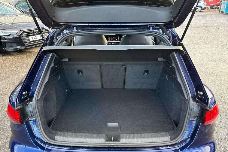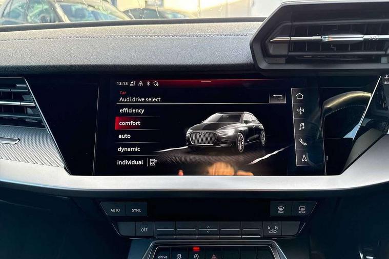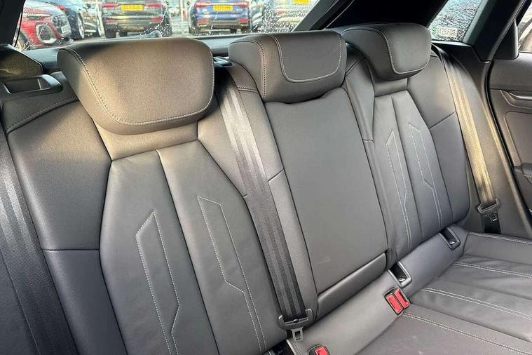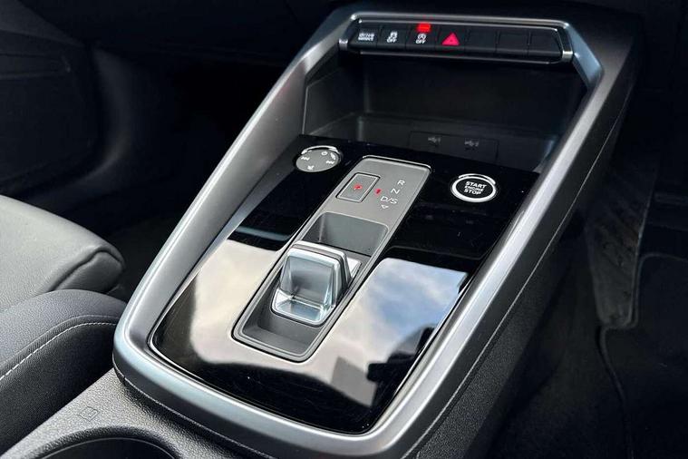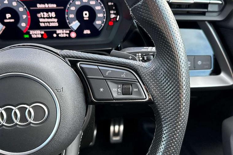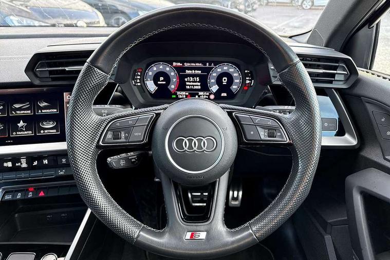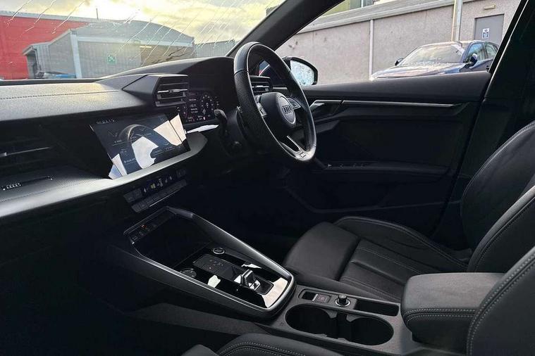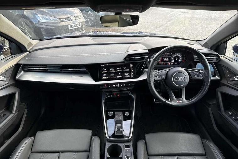 Audi drive select (Auto, Comfort, Dynamic, Efficiency and Individual), Audi smartphone interface, Audi Virtual Cockpit - 10.25" digital and colour instrument cluster, Automatic start/stop system with recuperation, Bluetooth interface, Camera based traffic sign recognition, Collision avoidance assistant, e-Call (emergency call), Electromechanical power speed sensitive steering, Lane departure warning system, MMI Navigation Plus with high resolution 10.1" colour touch screen display, Service indicator, Trip computer, Voice control system with natural language interaction, Sports suspension, 2xUSB-C connection with data and charging functions, 6 passive loudspeakers, DAB Digital radio, 3rd brake light, Acoustic glass windscreen, Aluminium window trim, Auto dimming frameless rear view mirror, Body colour exterior mirrors, Electrically adjustable/heated/folding/dimming door mirrors with kerb view includes integrated LED indications + kerb view function for passenger side, Front electric windows, Illuminated door sills with aluminium inserts at the front with S logo, LED daytime running lights, LED headlights with LED rear lights and dynamic rear indicators, Light and rain sensors, Privacy glass - dark tinted rear window, rear door and side windows, Rear electric windows, Rear side air outlets in grained matt black, Rear side wing doors, Rear wiper, S line bumpers, S roof spoiler, 12V socket and storage compartment in front centre console, 3 seat bench in 2nd row, 3 spoke leather multifunction steering wheel with paddle shift, 4 way electrically adjustable lumbar support for driver and front passenger, 60/40 split folding rear seat bench, Black cloth headlining, Dual zone electronic climate control, Front and rear centre armrest in artificial leather, Front and rear headrests, Front/rear floor mats, Height and reach adjustable steering wheel, Interior lighting - glove compartment light and right hand side, Luggage compartment floor covering, Manual boot compartment lid, Manually adjustable front seats, Seat side bolsters, Single front passenger seat, Stainless steel pedals and front footrest in black, Twin leather upholstery with front sports seats S embossed logo, Aluminium interior elements pack - A3 Sportback, LED interior lighting pack - A3 Sportback, S line styling pack - A3 Sportback, 3x3 point rear seat belts, Driver and front passenger airbag with passenger airbag deactivation, Electronic Stabilisation Control (ESC) including ABS, ASR and EDL, First aid kit with warning triangle and 2 safety vests, Front side airbags with head airbags and interaction airbag, Pre-sense front with pedestrian and cyclist detection, Seatbelt monitoring, Tyre pressure loss indicator, Anti theft alarm, Anti-theft wheel bolts, Electronically operated child locks, Immobiliser, Remote control central locking, Dark spectrum aluminium inlays, accent surfaces in the dashboard and centre console in platinum grey silk effect paint finish,