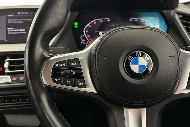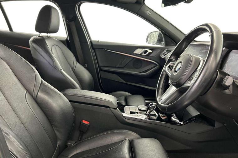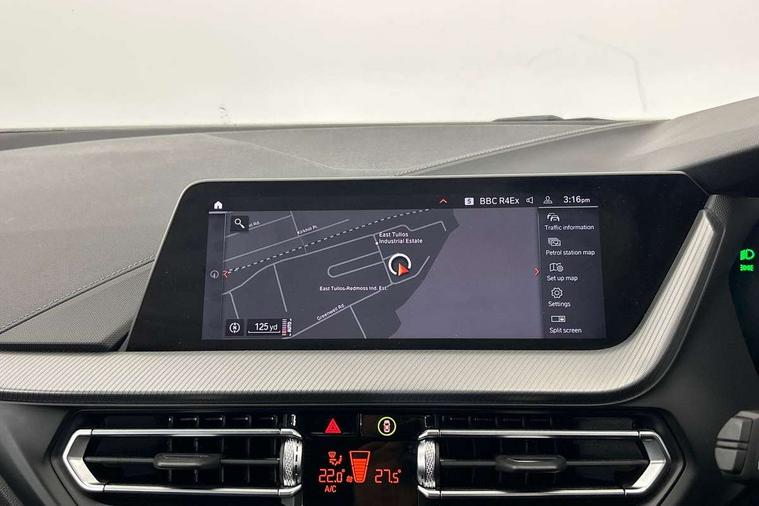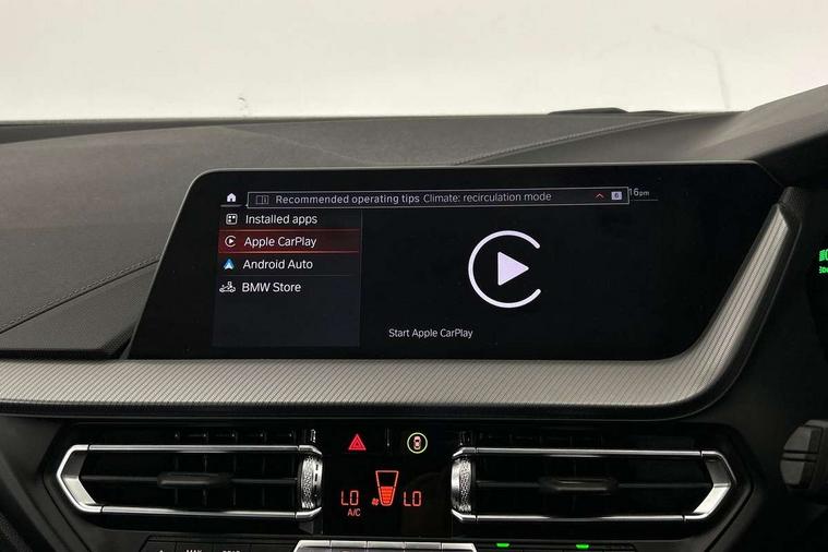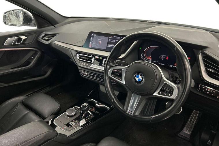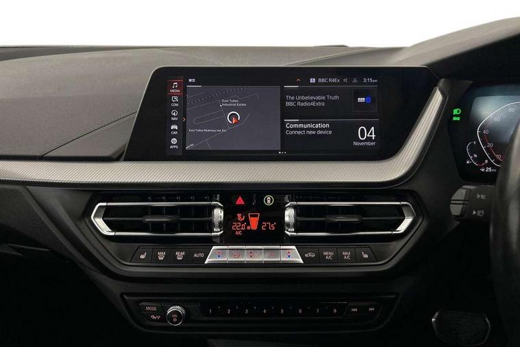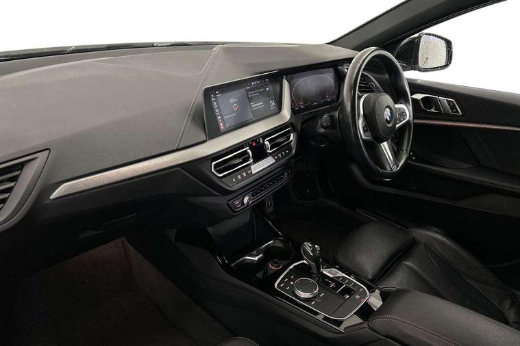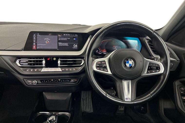 Contrast stitching on instrument panel, Additional interior lighting pack - 1 Series, Connected pack professional - 1 Series, Extended storage pack - 1 Series, Interior lights pack - 1 Series, Luggage compartment pack - 1 Series, M Sport exterior styling aerodynamics pack - 1 Series, Reduced rolling resistance tyres, Automatic drive away locking facility, Central locking switch for all doors, fuel filler cap and luggage compartment, Deadlocking function system to all doors, Locking wheel bolts, Remote control with integrated key with High-gloss Black inlay and M designation and 1 button for open/ close lock, window, open luggage compartment, Start/stop button with comfort go keyless engine start and auto start stop deactivation button, Thatcham Cat.1 alarm and immobiliser, Bluetooth audio streaming, DAB Digital radio, 2 tone horn, 3 point seatbelts on all seats, front pyrotechnic belt tensioners, stopper and belt force limiters, rear coded belt buckles, Airbags - front driver/passenger, front & rear curtain, front side, Anti lock braking system (ABS) with brake assist, BMW emergency call, Brake drying, Braking readiness, Crash sensor activating central locking release, hazard warning lights, fuel cut off, interior lighting + activation of safety battery terminal clamp, Driver and front passenger seat belt security check, Dynamic stability control + (DSC+), Dynamic Traction Control - DTC, Electrically operated hand brake, Front and rear disc brakes, Front passenger manual airbag deactivation, Seatbelt warning, Side impact protection, Tyre pressure monitoring system, Warning triangle and first aid kit, Auto dimming rear view mirror, Automatic headlight beam throw control, Automatic windscreen wipers and automatic headlight, Body colour door handles, Body colour mirror caps, Chrome 'M' logo side designation, Chrome exhaust tailpipe in single, round (Exhaust tailpipe, stainless steel - single, round), Chrome kidney grille frame with Satin Aluminium struts, Direction indicator side lights in exterior mirrors, Electric folding and anti dazzle exterior mirrors, Fading support, Follow me home headlights, Front and rear bumper system with replaceable deformation elements, Front and rear electric windows with open and close fingertip control, anti trap facility and comfort closing, Front door sill finishers in black plastic with M designation in metallic look, Green tinted heat protection glazing, Heated, electrically adjustable exterior mirror aspheric on driver side, convex on passenger side, High gloss shadowline window frame, Recess cover mirror frames and B/C pillar embelisher trim, High level third brake light, LED daytime running lights, LED eyebrow turn indicators, LED front fog lights, Lightweight engineering, Matt black air guide grilles, Model designation on right side of tailgate, Nearside reverse light in rear light cluster, Preparation for high beam assistant, Rain sensor including auto headlights activation, Rear fog lights, Rear window wiper, Shark fin antenna, Visible VIN plate, Welcome lighting, 12V power socket in centre console, 3 rear seat head restraints, 3 spoke M sports design leather steering wheel finished in nappa leather with specific M badge, Anthracite headlining, Anthracite Velour floor mats, Child seat ISOFIX attachment for two outer rear seats and front passenger seat with anchorage points, Conditioned based service, Dakota leather upholstery with perforation and contrast stitching, Driver and front passenger seat heating, Folding rear clothes hook, Four grab handles integrated in roof lining, Front and rear door pockets, Front and rear door pockets with bottle holders, Front and rear side armrest integrated into door trim, Front armrest foldable with integrated storage compartment, Front sports seats with electric side bolster adjustment, Glove compartment, Height adjustable front head restraints, Manual adjust steering wheel, Multi-function controls for steering wheel, Storage compartment in centre console, Sun visors with vanity mirrors and insert tab, Two zone automatic air conditioning, Active guard plus, Attentiveness assist, BMW Online services, BMW Teleservices, Check Control warning system for monitoring of lights and door/luggage compartment open warning, Connected eDrive Services, Eco pro mode, Integrated owners handbook, Oil sensor for level and grade, On board computer, Optimum shift indicator, Personal Profile, Pull away assistant, Speed limiter, Aluminium lightweight construction, Anti roll bar front and rear, Balancer shaft, Double VANOS, Drive Performance Control, Electronic differential lock, High precision injection, M sport suspension, Petrol Particulate Filter, VALVETRONIC engine management,