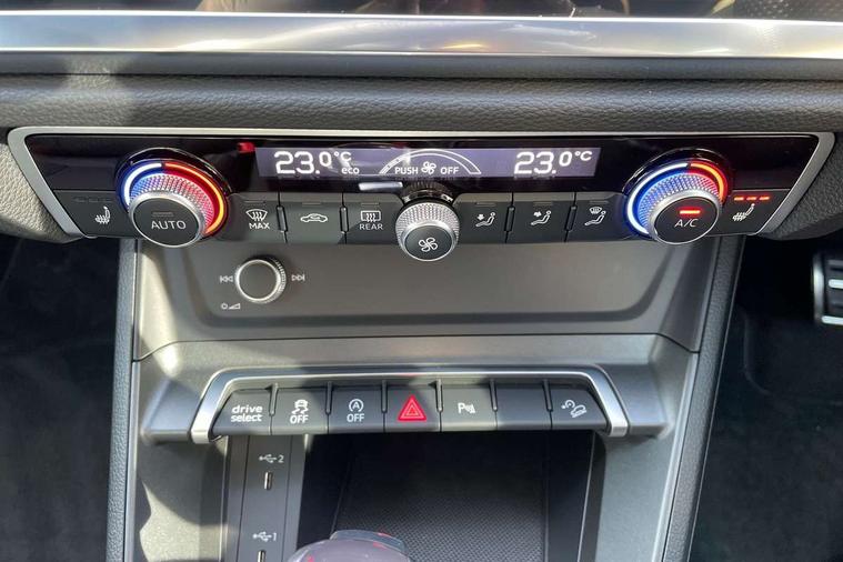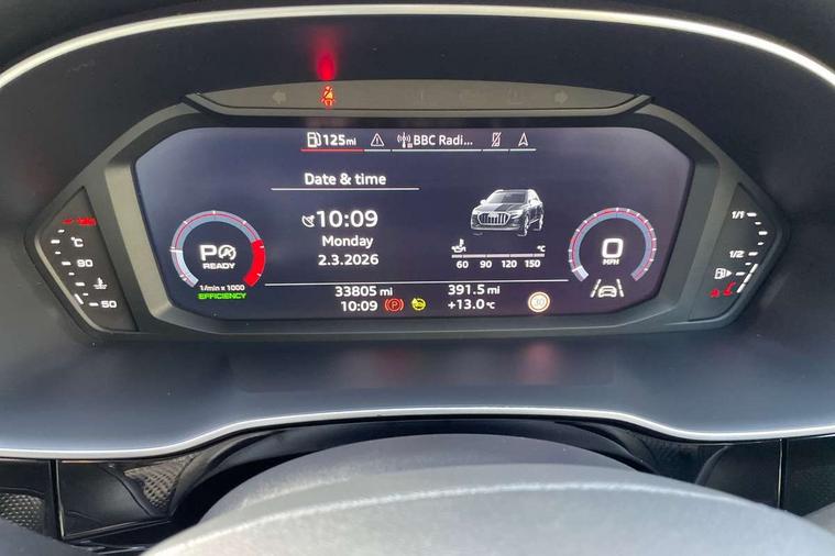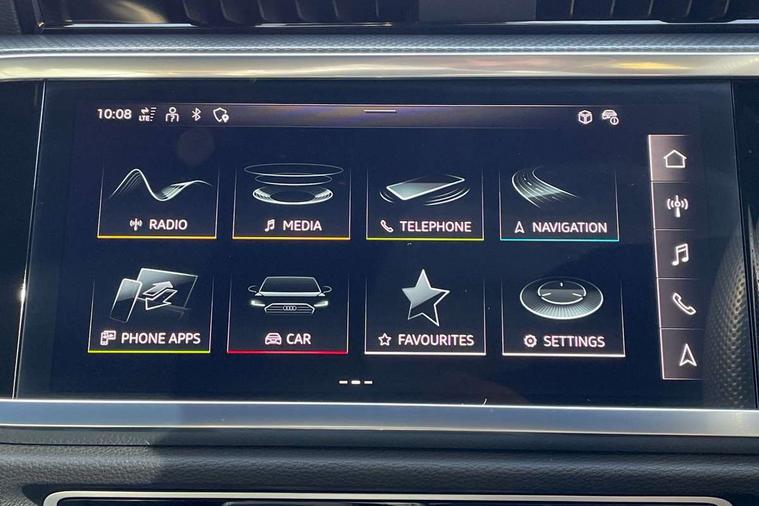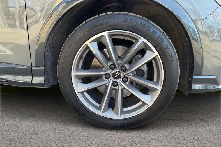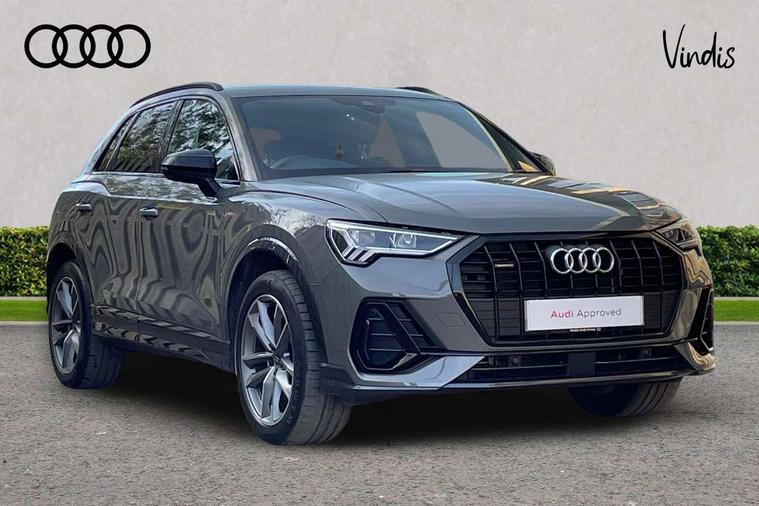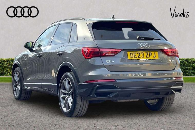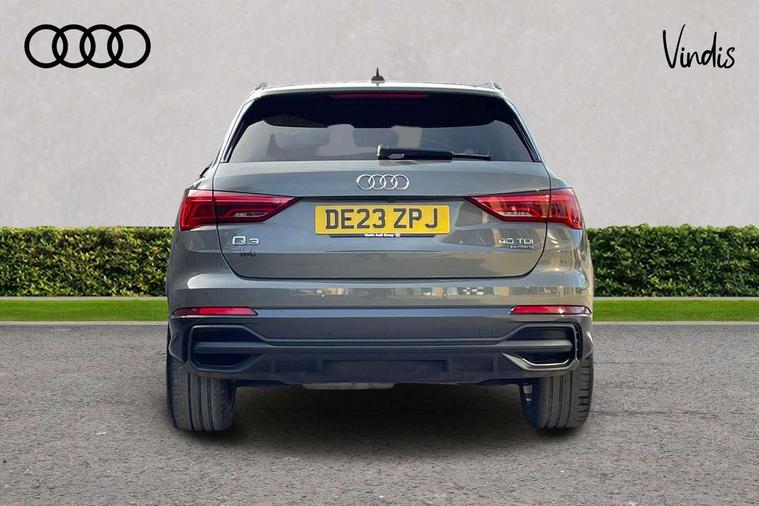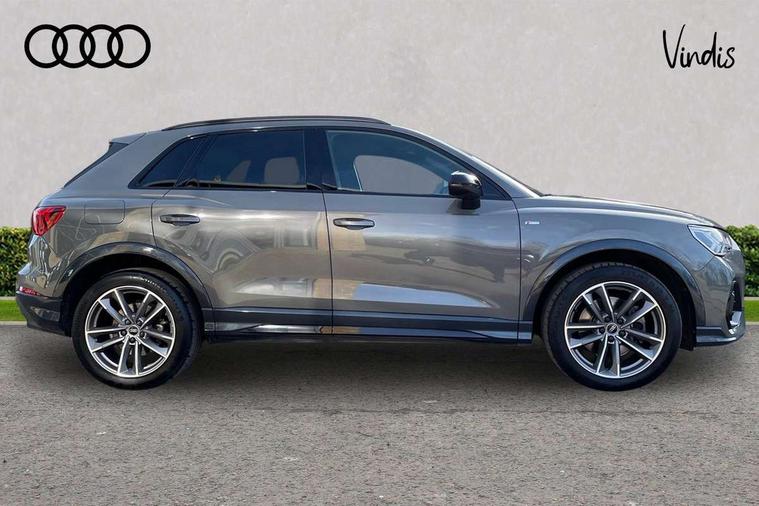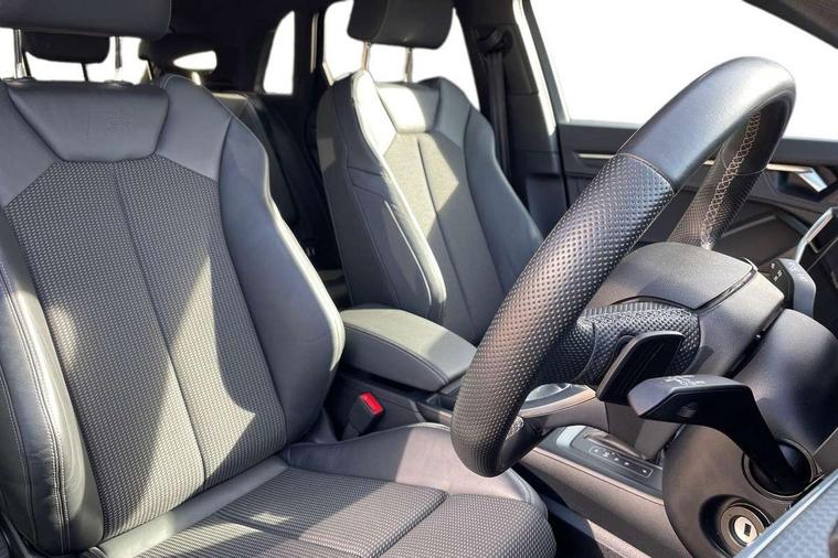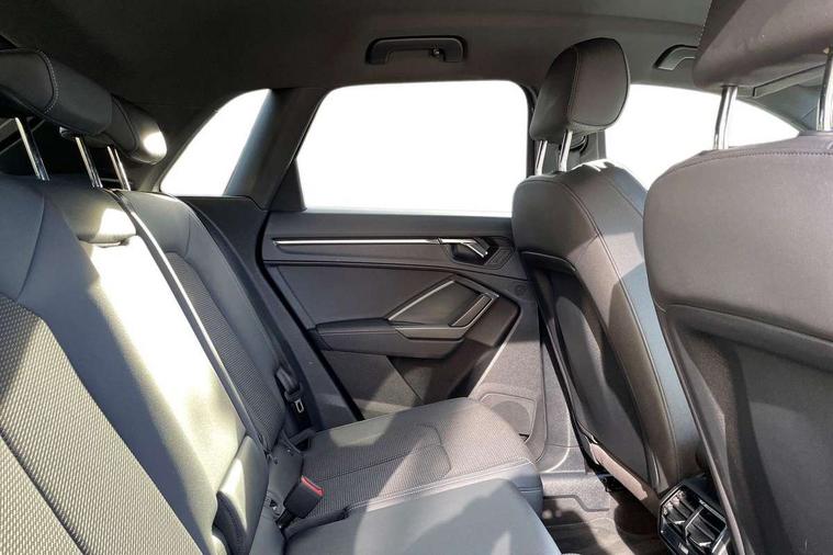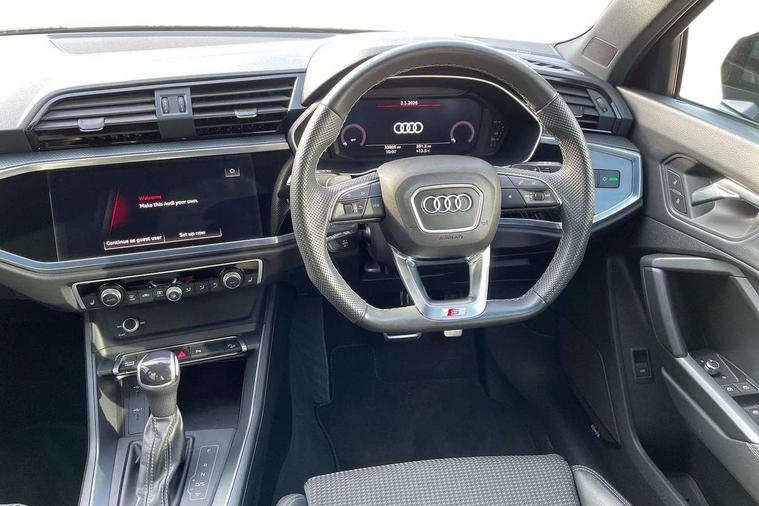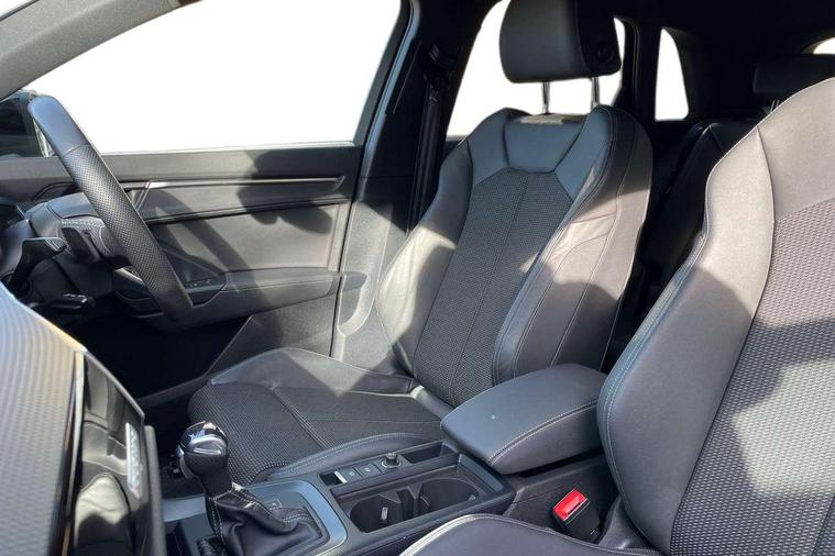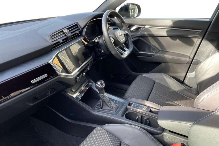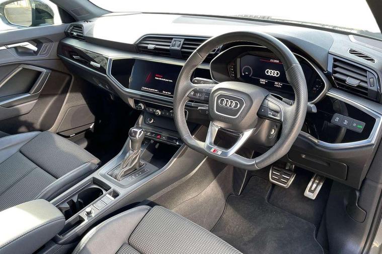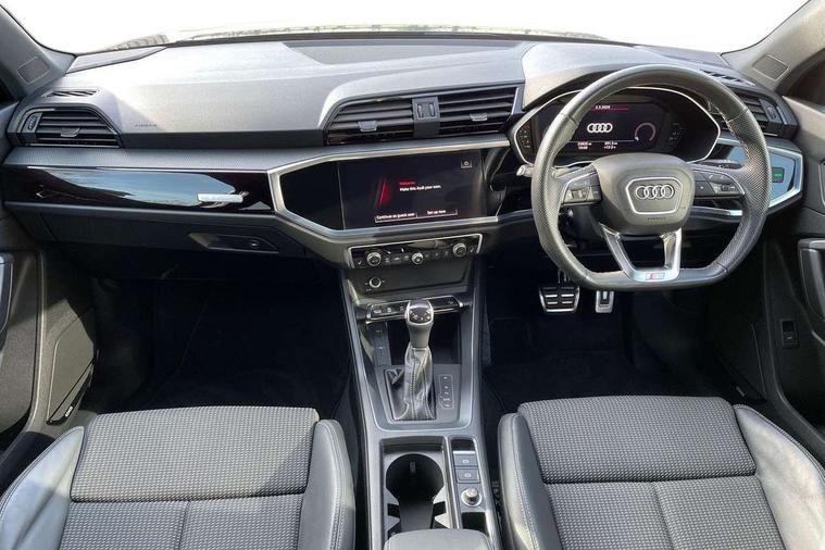 Aluminium look interior elements, Detail dashboard around MMI touch colour display in glass look, black with surround in aluminium look, Leatherette door armrest, Piano black inlay, Ambient lighting pack - Q3, Black styling pack - Q3, Non smoking pack - Q3, 19" 5 twin arm design diamond cut audi sport alloy wheels in matt grey look, Anti theft alarm, Anti theft wheel bolts, Immobiliser, Remote central locking, 2 USB-C ports with charge and data functions, 6 passive loudspeakers, DAB digital radio module, 3x3 point rear seatbelts, 6 airbags - Driver, front passenger, curtain and side windows, Audi pre-sense front with pedestrain and cyclist recognition, Electrically operated child locks on rear doors, Electromechanical parking brake, Electronic stabilisation control including ABS, ASR and EDL, Front seatbelt reminder, Hill descent control, Hill hold assist, Pre sense basic, Seatbelt monitoring, Tyre pressure warning, Warning triangle and first aid kit, Acoustic windscreen, Auto dimming frameless rear view mirror, Black roof rails, Electrically folding, adjustable and heated door mirrors with integrated LED side indicators and kerb view function for passenger side, Front and rear electric windows, Front fog lights, Grille vertical bars in aluminium silver/Matt, High gloss black finish B and C pillars, LED Dynamic rear indicators, LED headlights with LED daytime running lights, LED rear lights, LED third brake light, Privacy glass dark tinted rear and rear-side windows (from B-pillar backwards), Rain and light sensors, Rear diffuser grille in grained matt black, Rear diffuser strip in matt anthracite black, Rear side wing doors, Rear wiper, S line bumpers in contrasting Manhattan grey, Variable front intermittent wipers, 12V socket in rear centre console, 3 seat bench in 2nd row, 40:20:40 folding with manual adjustment for 60:40 forwards/backwards position and backrest angle, Adjustable rear seat bench/backrest with centre armrest and cupholder, Black cloth headlining, Dual zone electronic climate control, Front and rear black floor mats with contrast stitching in rock grey, Front and rear headrests, Front and rear roof module including reading lights, Front centre armrest, Glove compartment lighting, Height and reach adjustable steering wheel, Illuminated door sill trims with S logo, ISOFIX child seat mounting for front passenger with airbag deactivation and outer rear seat including top tether attachment point for outer rear seats, Luggage compartment light, Manual front seats with height adjustment, Perforated leather gearknob, Single front passenger seat, Stainless steel luggage compartment sill finisher, Stainless steel pedals, Amazon alexa Integration, Audi drive select, Audi lane departure warning, Audi smartphone interface includes wireless Apple carplay/Android Auto, Audi Virtual Cockpit - 10.25" display, Bluetooth interface, Camera based traffic sign recognition, Legal emergency call, MMI Navigation Plus with high resolution 10.1 inch touchscreen colour display, Power operated tailgate, Progressive steering, Service interval indicator, Start stop system with recuperation, Voice control system with natural language interaction, Diesel particulate filter, Sports suspension,