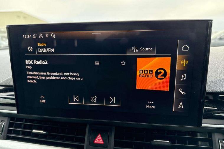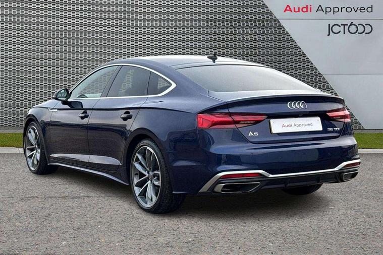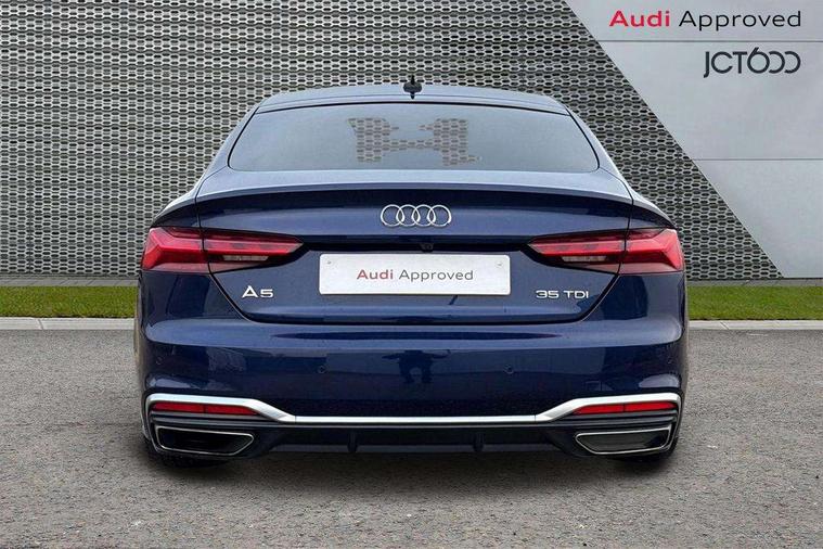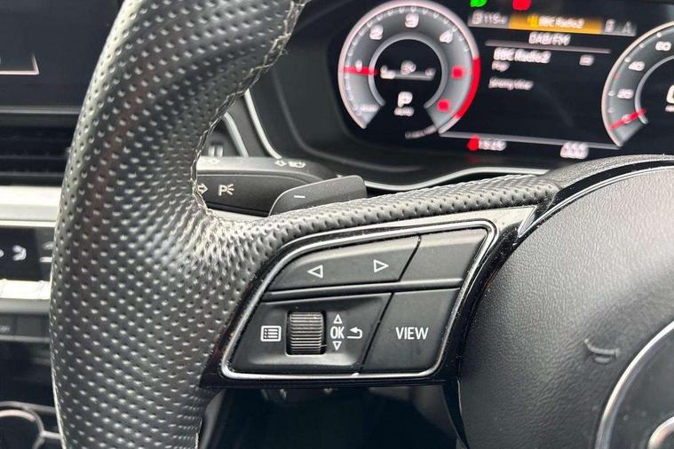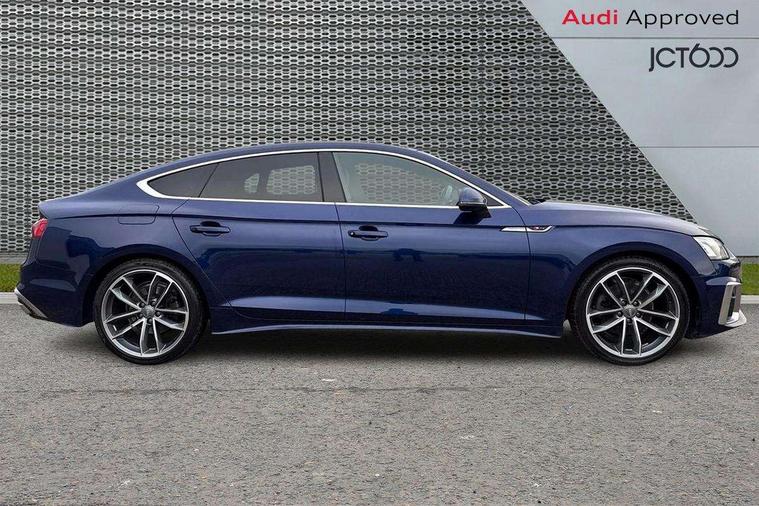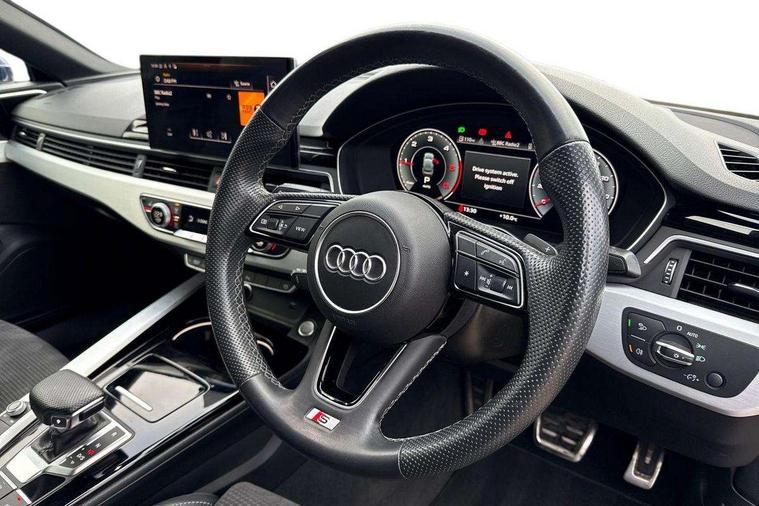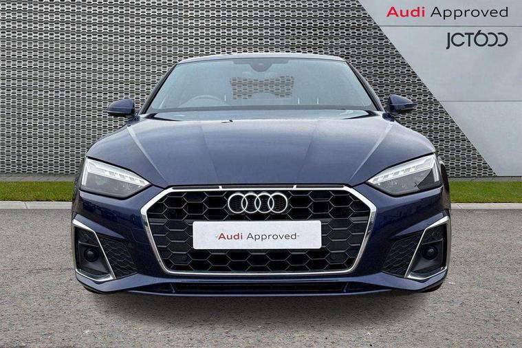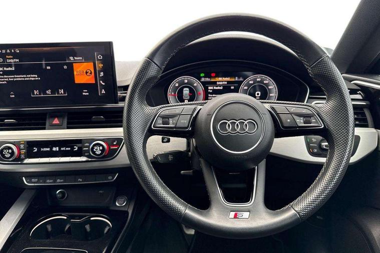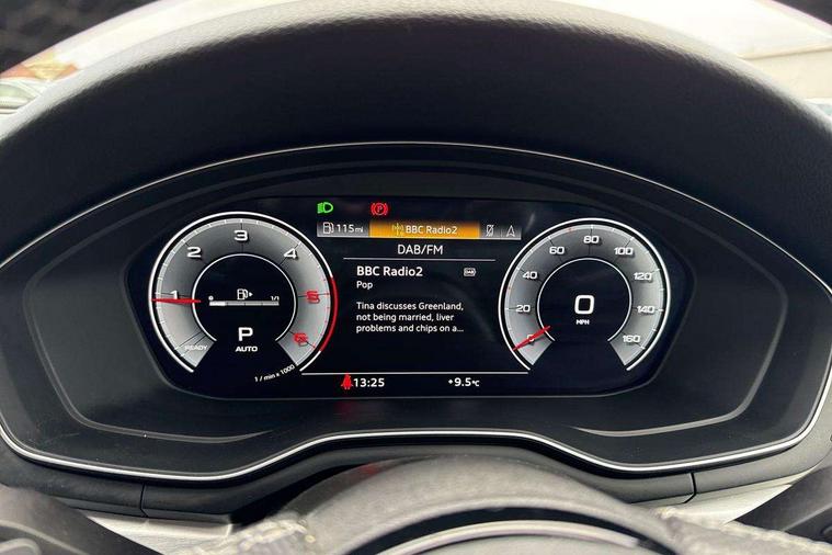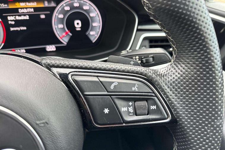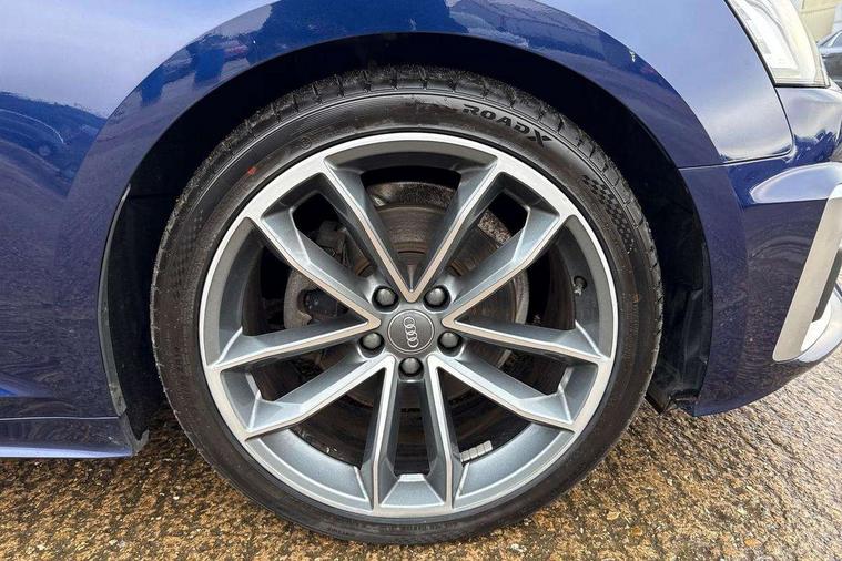 Matt brushed aluminium inlays, LED interior light pack - A5/RS5, Tyre repair kit, Anti theft alarm system, Anti theft wheel bolts, Immobiliser, Keyless Go, Remote central locking, 8 passive loudspeakers, CD player, DAB digital radio reception, Two additional USB ports for rear passenger in rear centre console, Two SDXC card slots, 3x3 point rear seatbelts, 6 airbags - Driver, front passenger, curtain and side airbags, Electromechanical parking brake, Electronic Stabilisation Control (ESC) including ABS, ASR and EDL, Front passenger airbag deactivation, Height adjustable front seatbelts, Hill hold assist, Multi collision brake assist, Pop-up bonnet for pedestrian protection, Seatbelt monitoring, Tyre pressure warning, Variable restraint system, Warning triangle and first aid kit, Audi matrix LED headlights with LED rear lights + dynamic front and rear indicators, Auto dimming rear view mirror, Body colour bumpers, Body colour door handles, Body colour front spoiler lip, Body colour side sill trim, Body coloured door mirrors, Electric adjustable heated door mirrors, Electric folding door mirrors, Electric front windows, Front fog lights, Honeycomb structure radiator grille in grained matt black, Matt aluminium silver tailpipe trim, Privacy glass, Rain and light sensors, S line badges on front wings, S line front and rear bumpers with side skirts, S Line rear diffuser in matt titanium black with trim strip in matt aluminium silver, Side air inlets in grained matt black with matt aluminium silver inlay, Towbar preparation, Windscreen with acoustic glazing, 4 way electric lumbar support for driver and front passenger, 40/20/40 split folding 3 seater rear bench seat, Adjustable steering column, Black cloth headlining, Black perforated leather gearknob, Contrast stitching on seats, steering wheel and gear lever gaiter, Deluxe 3 zone electronic climate control, Front centre armrest, Front head restraints, Front/rear floor mats, Heated front seats, Illuminated door sill trim with S logo, ISOFIX child seat mounting and top tether, Luggage compartment mat, Manual seat adjustment, Rear headrests, Stainless steel pedals, Sunvisors with vanity mirrors, Tool kit, Audi connect safety and service (e-call), Audi drive select (Auto, Comfort, Dynamic, Efficiency and Individual), Audi parking system plus with front and rear sensors, Audi phone box with wireless charging, Audi smartphone interface, Audi virtual cockpit - 12.3" full colour digital instrument cluster, vehicle/engine speed, Radio/media information+Driver assistance systems, Automatic start-stop system with coasting functionality and efficiency programme, Bluetooth interface, Electro-mechanical power steering, Email, calendar and text messages displayed via MMI, MMI nav+ with MMI touch - 10.1" high resolution MMI display, touch sensitive, 3D map, route/country info, dynamic route guide, personal route assist, Power operated tailgate, Rear view camera, Service interval indicator, Voice control system, Diesel particulate filter, Sports suspension lowered by 23mm,