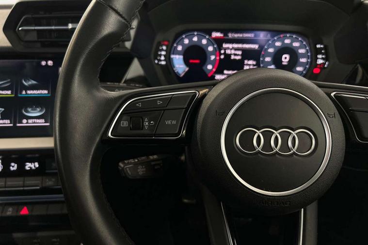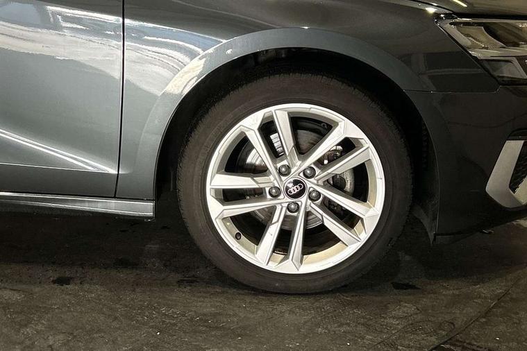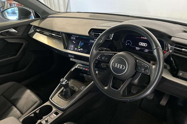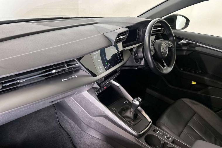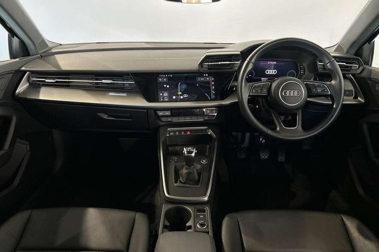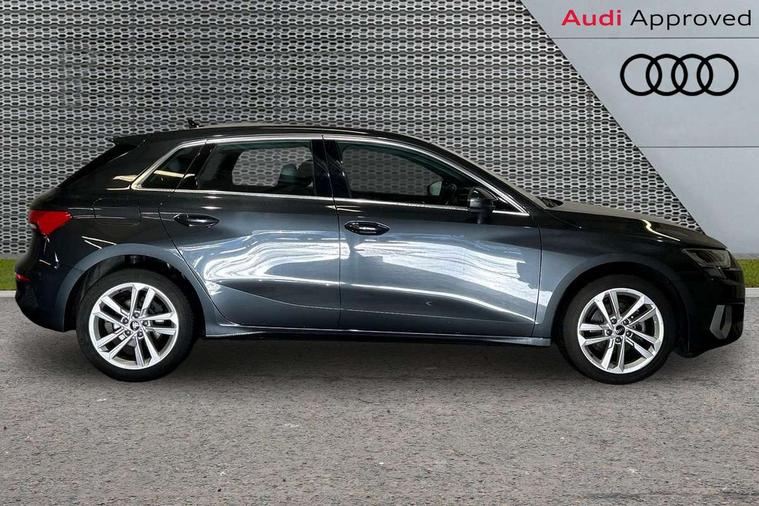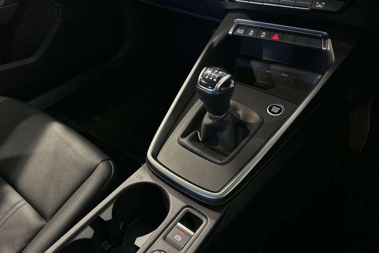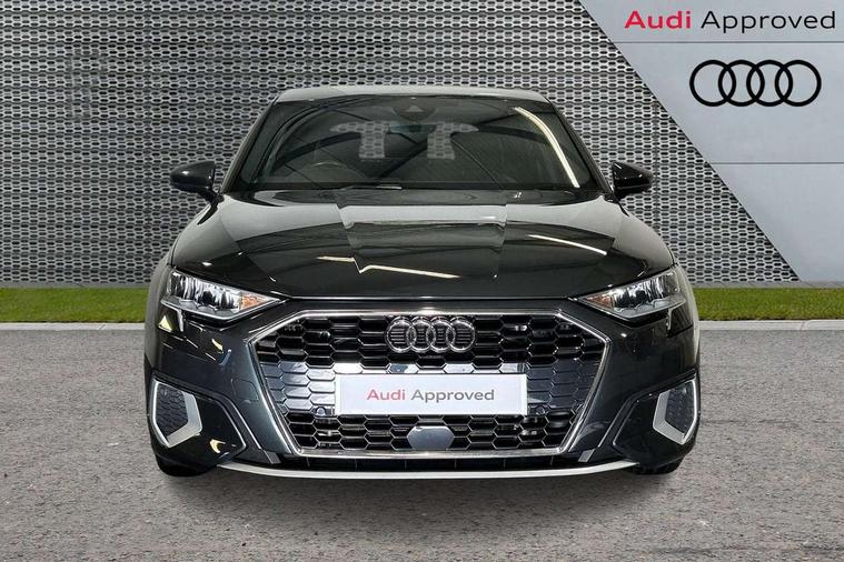 Inlays with silk effect paint in platinum grey, Aluminium interior elements pack - A3 Sportback, Sport styling pack - A3 Sportback, Anti theft alarm, Anti-theft wheel bolts, Electronically operated child lock, Immobiliser, Remote control central locking, 2xUSB-C connection with data and charging functions, 6 passive loudspeakers, DAB Digital radio, 3x3 point rear seat belts, Audi pre sense front, Driver and front passenger airbag with passenger airbag deactivation, Electronic Stabilisation Control (ESC) including ABS, ASR and EDL, First aid kit with warning triangle and 2 safety vests, Front side airbags with head airbags and interaction airbag, Pre-sense front with pedestrian and cyclist detection, Seatbelt monitoring, Tyre pressure loss indicator, 3rd brake light, Acoustic glass windscreen, Aluminium window trim, Auto dimming frameless rear view mirror, Body colour exterior mirrors, Body colour roof spoiler, Electrically adjustable/heated/folding/dimming door mirrors with kerb view includes integrated LED indications + kerb view function for passenger side, Front electric windows, LED daytime running lights, LED headlights and halogen rear lights, Light and rain sensors, Rear electric windows, Rear side wing doors, Rear window, rear door windows and rear side windows in clear glass, Rear wiper, 12V socket and storage compartment in front centre console, 3 seat bench in 2nd row, 40/20/40 split folding rear seat bench with cupholder, Dual zone electronic climate control, Front and rear centre armrest, Front and rear headrests, Front door sill trims with aluminium inlay, Front/rear floor mats, Height and reach adjustable steering wheel, Interior lighting - Front and rear roof module including reading lights, glove compartment light and right hand side, Luggage compartment floor covering, Manual boot compartment lid, Manually adjustable front seats, Seat side bolsters, Single front passenger seat, Steel grey cloth headlining, Twin leather upholstery, Audi drive select (Auto, Comfort, Dynamic and Individual), Audi smartphone interface, Audi Virtual Cockpit - 10.25" digital and colour instrument cluster, Automatic start/stop system with recuperation, Bluetooth interface, Collision avoidance assistant, Cruise control, e-Call (emergency call), Electromechanical power speed sensitive steering, Lane departure warning system, MMI Navigation Plus with high resolution 10.1" colour touch screen display, Rear parking sensors, Service indicator, Trip computer, Voice control system with natural language interaction, Standard suspension,
