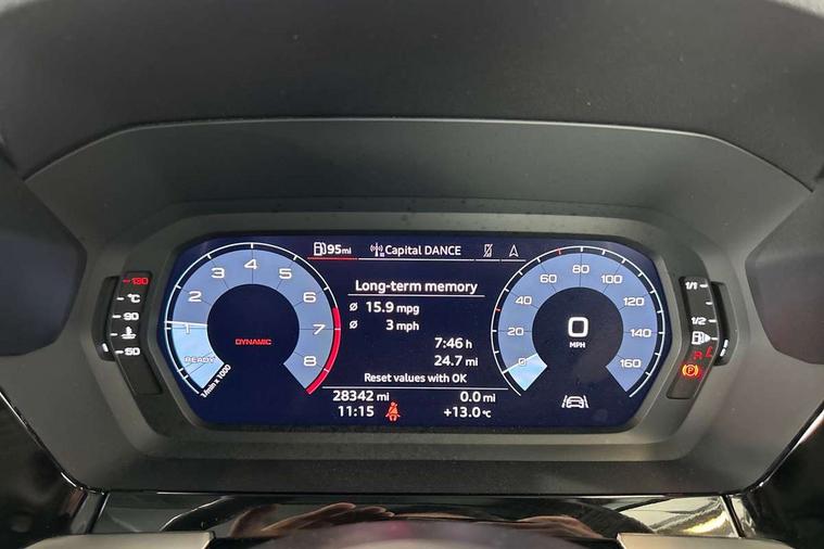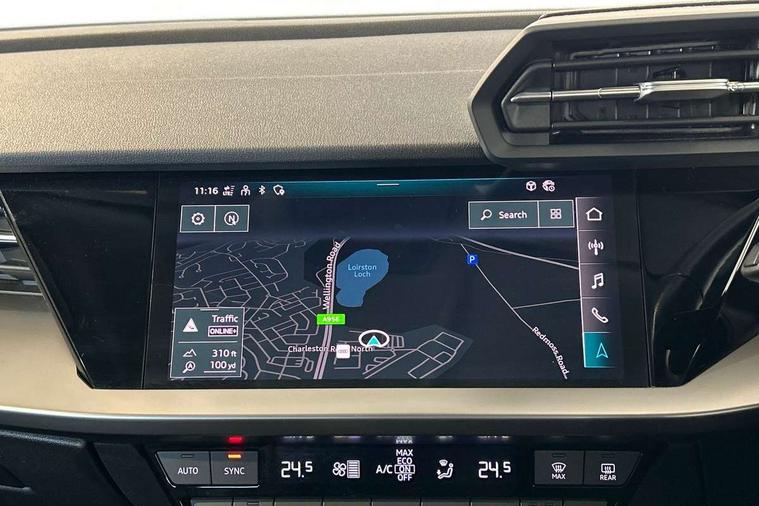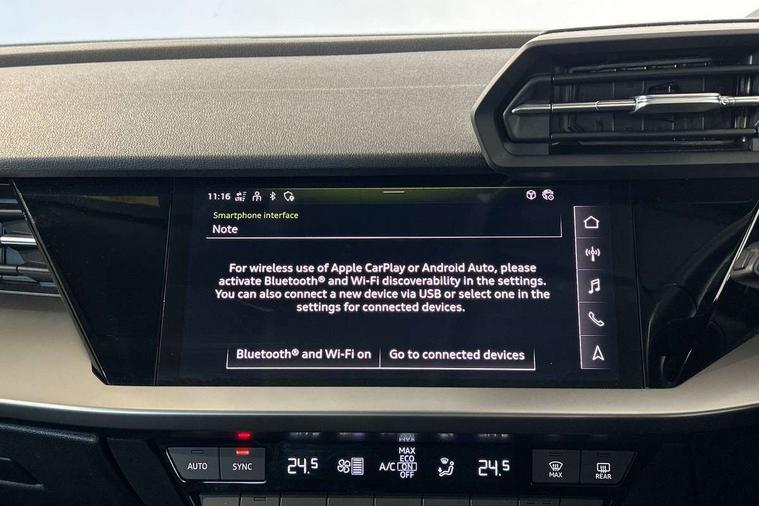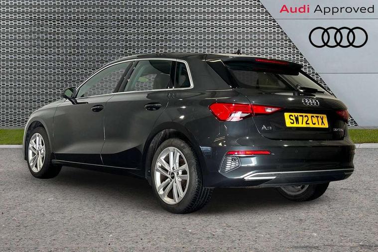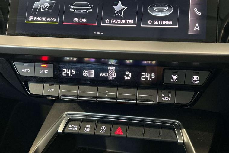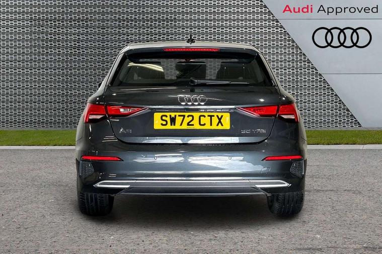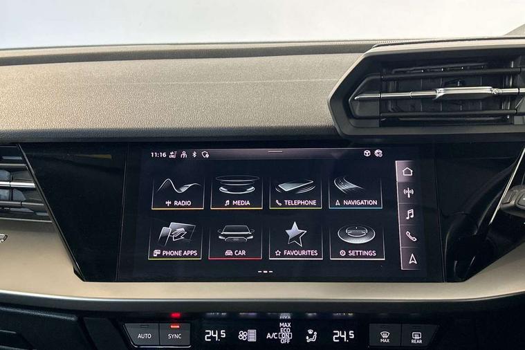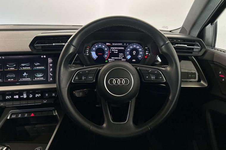 Inlays with silk effect paint in platinum grey, Aluminium interior elements pack - A3 Sportback, Sport styling pack - A3 Sportback, Anti theft alarm, Anti-theft wheel bolts, Electronically operated child lock, Immobiliser, Remote control central locking, 2xUSB-C connection with data and charging functions, 6 passive loudspeakers, DAB Digital radio, 3x3 point rear seat belts, Audi pre sense front, Driver and front passenger airbag with passenger airbag deactivation, Electronic Stabilisation Control (ESC) including ABS, ASR and EDL, First aid kit with warning triangle and 2 safety vests, Front side airbags with head airbags and interaction airbag, Pre-sense front with pedestrian and cyclist detection, Seatbelt monitoring, Tyre pressure loss indicator, 3rd brake light, Acoustic glass windscreen, Aluminium window trim, Auto dimming frameless rear view mirror, Body colour exterior mirrors, Body colour roof spoiler, Electrically adjustable/heated/folding/dimming door mirrors with kerb view includes integrated LED indications + kerb view function for passenger side, Front electric windows, LED daytime running lights, LED headlights and halogen rear lights, Light and rain sensors, Rear electric windows, Rear side wing doors, Rear window, rear door windows and rear side windows in clear glass, Rear wiper, 12V socket and storage compartment in front centre console, 3 seat bench in 2nd row, 40/20/40 split folding rear seat bench with cupholder, Dual zone electronic climate control, Front and rear centre armrest, Front and rear headrests, Front door sill trims with aluminium inlay, Front/rear floor mats, Height and reach adjustable steering wheel, Interior lighting - Front and rear roof module including reading lights, glove compartment light and right hand side, Luggage compartment floor covering, Manual boot compartment lid, Manually adjustable front seats, Seat side bolsters, Single front passenger seat, Steel grey cloth headlining, Twin leather upholstery, Audi drive select (Auto, Comfort, Dynamic and Individual), Audi smartphone interface, Audi Virtual Cockpit - 10.25" digital and colour instrument cluster, Automatic start/stop system with recuperation, Bluetooth interface, Collision avoidance assistant, Cruise control, e-Call (emergency call), Electromechanical power speed sensitive steering, Lane departure warning system, MMI Navigation Plus with high resolution 10.1" colour touch screen display, Rear parking sensors, Service indicator, Trip computer, Voice control system with natural language interaction, Standard suspension,