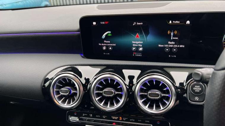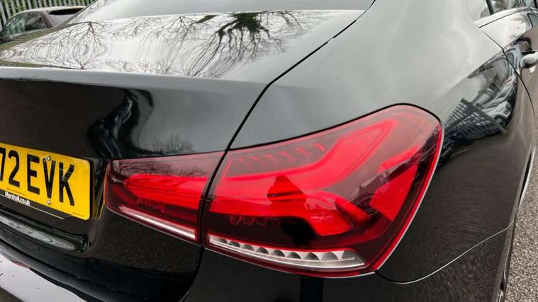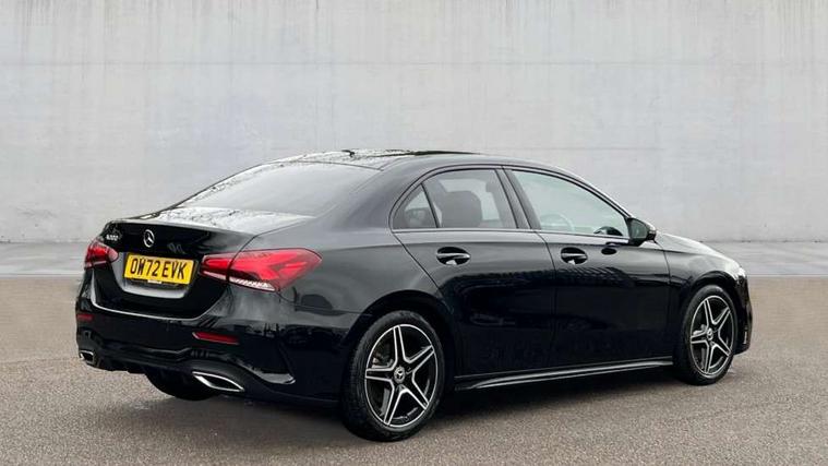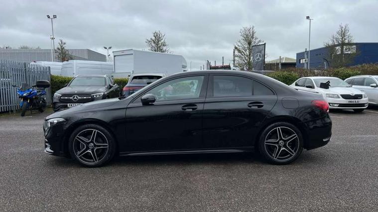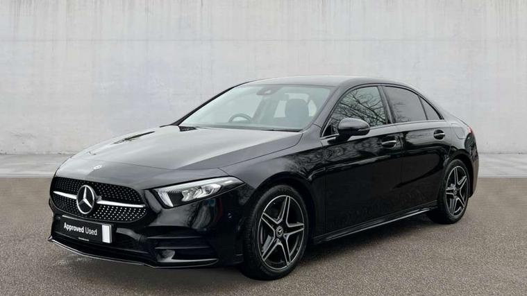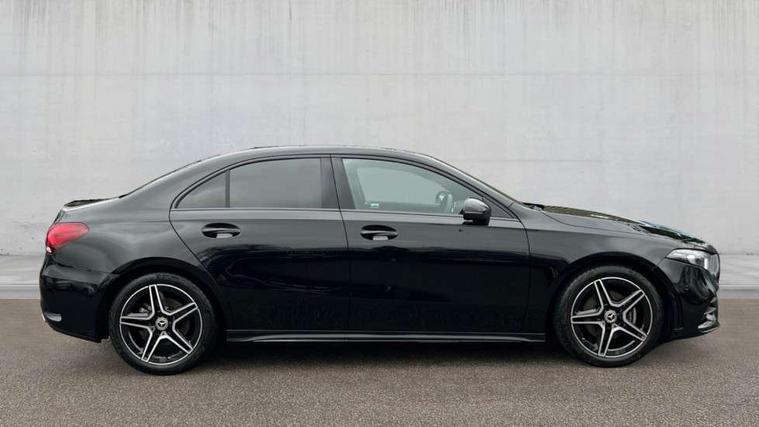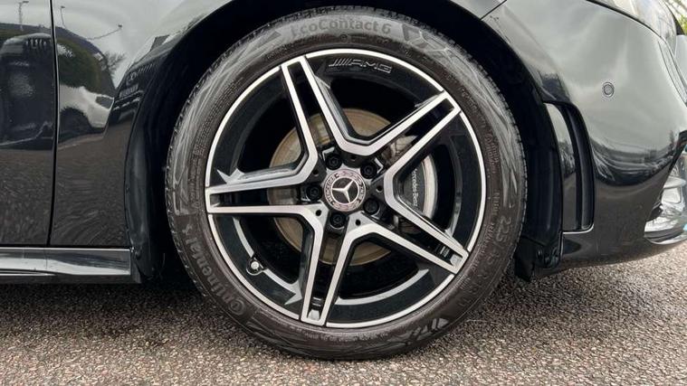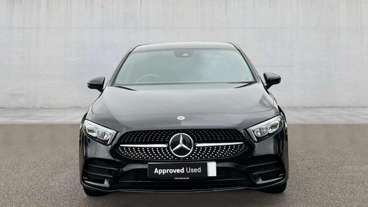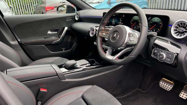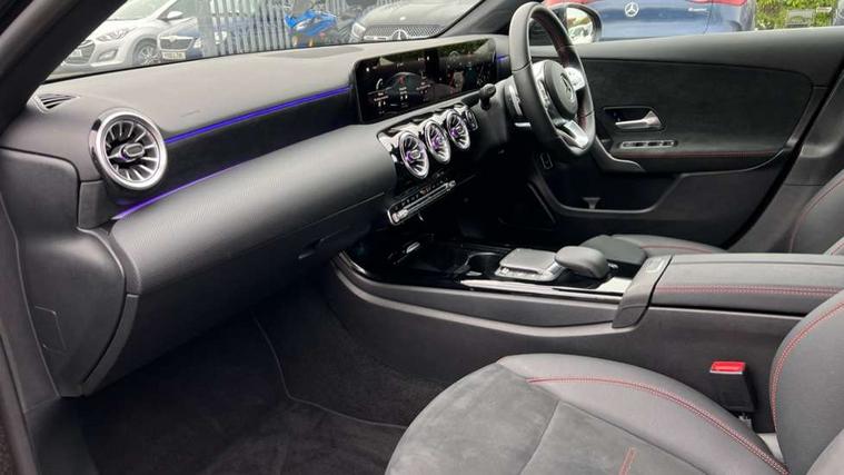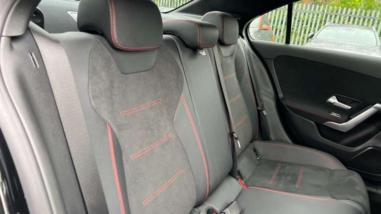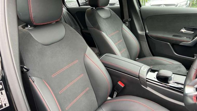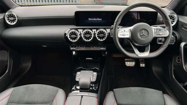 Matrix look light longitudinal grain aluminium trim element, Light and sight pack - A Class, Mirror package - A Class, Night pack - A Class Saloon/Hatchback, Seat comfort pack - A Class, 18" AMG 5 twin spoke light alloy wheels aerodynamically optimised painted in black with highsheen finish, Summer tyres, Tirefit sealant kit, Alarm system/interior protection/immobiliser, Keyless Go, Remote central locking and crash sensor with emergency opening function, Urban guard vehicle protection system with immobiliser and interior protection, 2 USB ports (type C) in rear stowage compartment and one in front of center console, 6 speakers, DAB Digital radio, MBUX multimedia system with DAB digital radio and touchpad including satellite navigation, Mercedes-Benz sound system - 100W, 3 rear 3 point seatbelts, ABS with Brake Assist, Active bonnet, Active brake assist includes forward collision warning system with autonomous braking, Adaptive brake assist with hold function and hill start assist, Black seatbelts, Childproof locks manually operated for rear doors and electrically operated for rear power windows, Crash responsive emergency lighting, Driver and passenger head and side airbags, Drivers knee airbag, Dual stage driver/passenger airbags, Electronic parking brake, ESP curve dynamic assist, ESP with ASR, Front and rear seatbelt reminder, Front brake callipers with Mercedes Benz lettering, Tyre pressure monitoring system, Warning triangle and first aid kit, Window airbags, 4 Electric Front and Rear windows, Adaptive brake lights, AMG bodystyling - Front apron with splitter in chrome, rear apron with chrome trim and chrome visible trim elements in tailpipe, Automatic headlights, Black weather strip, Body colour bumpers, Body colour door handles with chrome inserts, Body colour side skirt, Electric adjustable and heated door mirrors with integrated LED side indicators, Exclusive diamond radiator grille, Exhaust system - Twin visible tailpipes in polished stainless steel, Headlamp assist automatic headlamp activation, Heated glass rear windscreen + timer control, LED high performance headlamps with integrated LED daytime running lights, LED tail lamp, Privacy glass, Radio aerial, Rain sensing windscreen wipers with two sensitivity settings, Rear boot, Rear fog lights, Rear side wing doors, Third brake light featuring LED technology, 3 seat bench in 2nd row, 3 Spoke flat bottom leather multi function steering wheel with perforated leather in grip area, 40:20:40 split folding rear seats, Artico man-made leather/Microfibre Dinamica upholstery with red contrast stitching, Auto Mercedes-Benz child seat recognition sensor, Black air vents with surround in silver chrome, Black roof lining, Brushed stainless steel sports pedals with rubber studs, Controller on centre console with chrome surround, Floor mats with AMG lettering, Front centre armrest with storage compartment, Front seat backs luggage nets, Galvanished gear shift paddles on steering wheel, Heated front seats, Height/reach adjustable steering column, Illuminated Mercedes Benz lettering front door sills with changeable cover, Interior lighting - 64 colour Ambient lighting, Interior mirror with reading lamps in black and frameless, ISOFIX and top tether child seat fixing points in two outer rear seats, Manual height adjustable front seats, Rear head restraints, Seat occupancy sensor for front passenger seat, Single front passenger seat, Sports seats with adjustable head restraints, Stowage compartment in centre console with retractable cover, Sunvisors with illuminated vanity mirrors, Touchpad on center console, Twin front cupholders, Two zone thermotronic luxury automatic climate control, 10.25" Digital instrument cluster display screen, 10.25" media display, 180 degree rear view camera with parking guidelines, Active parking assist with visual and audible warning of detected obstacles, Attention assist, Brake pad wear indicator warning light, Car wash mode, Cruise control + speed limiter, Direct steering, Dual bluetooth interfaces, DYNAMIC SELECT with a choice of driving modes (ECO, Comfort, Sport and Individual), ECO start/stop function, Fluid level warning indicator for fuel, oil, coolant and washer fluid, Hard-disk navigation, Hey Mercedes Voice activation, Lamp failure indicator, Lane keeping system, Mercedes me connect including emergency call system, accident recovery, breakdown management and maintenance, Mercedes me remote services, Outside temperature gauge, Owners manual in English, Pre-installation for car sharing, Preinstallation for Mercedes Benz link, Service indicator (ASSYST), Smartphone integration with Apple CarPlay and Android auto, Speed limit assist, Speed sensitive power steering, Trip computer, Ultrasonic sensors positioned in the front and rear bumpers, Lowered comfort suspension, Rear axle torsion beam,