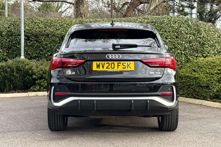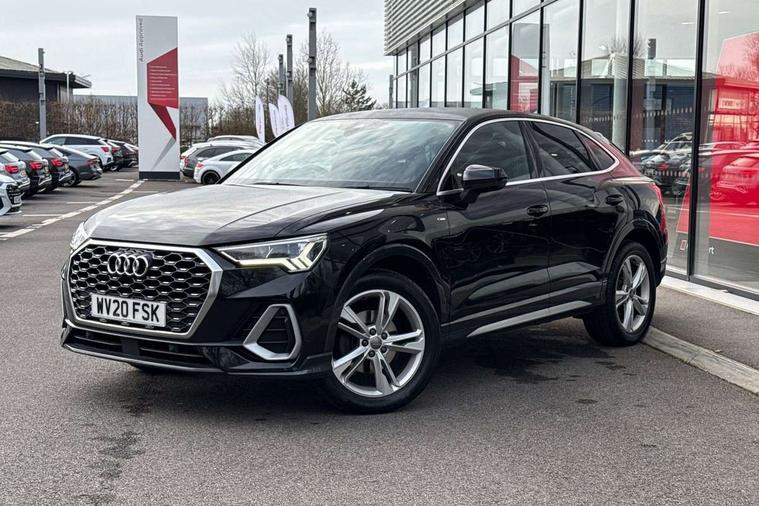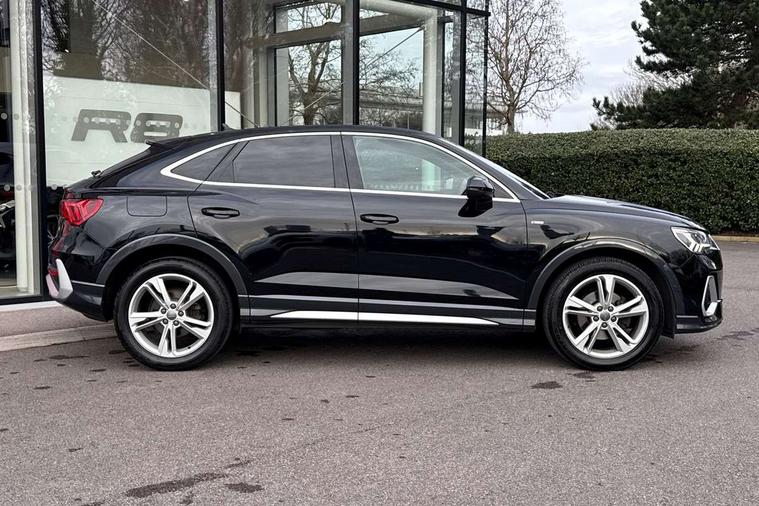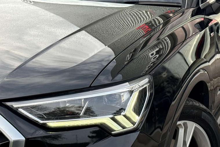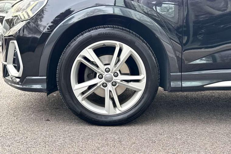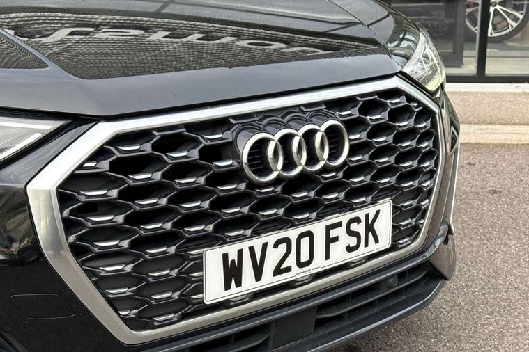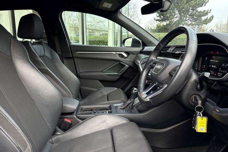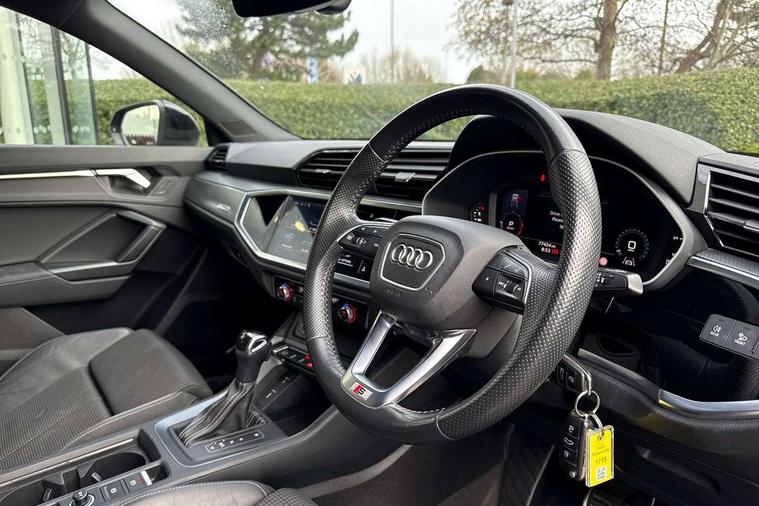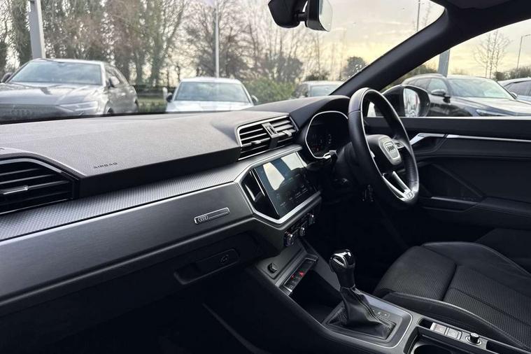 Dark matt brushed aluminium inlay, Detail dashboard around MMI touch colour display in glass look, black with surround in aluminium look, Leatherette door armrest, Non smoking pack - Q3, Anti theft alarm, Anti theft wheel bolts, Remote central locking, 1 x USB type C and 1 USB type A charging points, 6 passive loudspeakers, DAB digital radio module, 3x3 point rear seatbelts, 6 airbags - Driver, front passenger, curtain and side windows, Audi pre-sense front with pedestrain and cyclist recognition, Electrically operated child locks on rear doors, Electromechanical parking brake, Electronic stabilisation control including ABS, ASR and EDL, Hill descent control, Hill hold assist, Pre sense basic, Seatbelt monitoring, Tyre pressure warning, Warning triangle and first aid kit, Acoustic windscreen, Aluminium window trim, Auto dimming frameless rear view mirror, Diffuser grille in grained matt black, Diffuser trim in selenite silver, Electrically folding, adjustable and heated door mirrors with integrated LED side indicators and kerb view function for passenger side, Front and rear electric windows, Front fog lights, Front side air inlets in selenite silver, Front underbody protection in manhattan grey paint finish, Grille surround in aluminium silver matt, High gloss black finish B and C pillars, LED headlights with LED daytime running lights and dynamic rear indicator, LED rear lights, Privacy glass dark tinted rear and rear-side windows (from B-pillar backwards), Radiator grille in titanium black with inlay in matt aluminium silver, Rain and light sensors, Rear underbody protection in matt black, S line badges on front wings, Side skirt insert in matt Platinium grey, 12V socket in rear centre console, 40:20:40 folding with manual adjustment for 60:40 forwards/backwards position and backrest angle, Adjustable rear seat bench/backrest with centre armrest and cupholder, Black cloth headlining, Dual zone climate control, Front and rear black floor mats with contrast stitching, Front and rear headrests, Front and rear roof module including reading lights, Front centre armrest, Glove compartment lighting, Illuminated door sill trims with S logo, ISOFIX child seat mounting and Top Tether with front passenger airbag deactivation, Luggage compartment light, Manual front seats with height adjustment, Perforated leather gearknob, Stainless steel luggage compartment sill finisher, Stainless steel pedals, Audi connect safety and service (e-call), Audi drive select, Audi lane departure warning, Audi side assist, Audi smartphone interface, Audi Virtual Cockpit - 10.25" display, Bluetooth interface, Camera based traffic sign recognition, MMI Navigation Plus with high resolution 10.1 inch touchscreen colour display, Power operated tailgate, Progressive steering, Service interval indicator, Start stop system with recuperation, Voice control system with natural language interaction, Diesel particulate filter, Sports suspension,