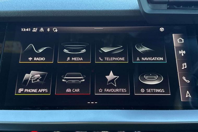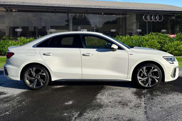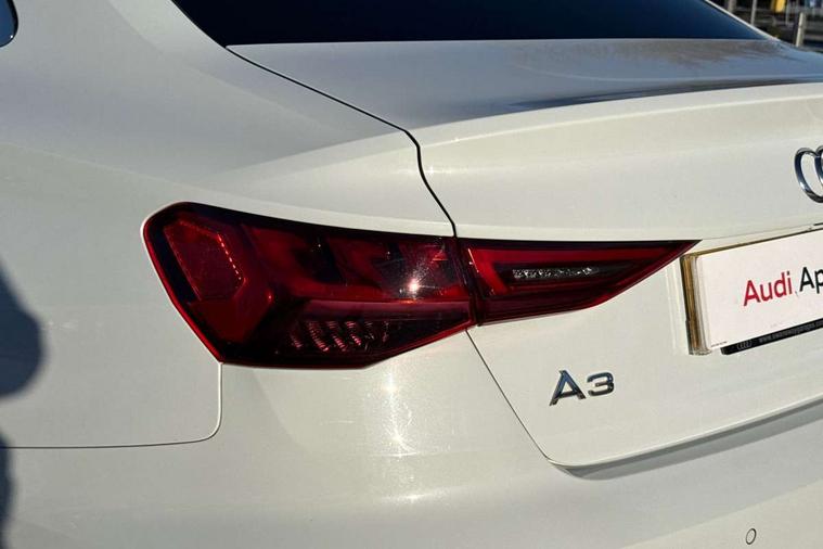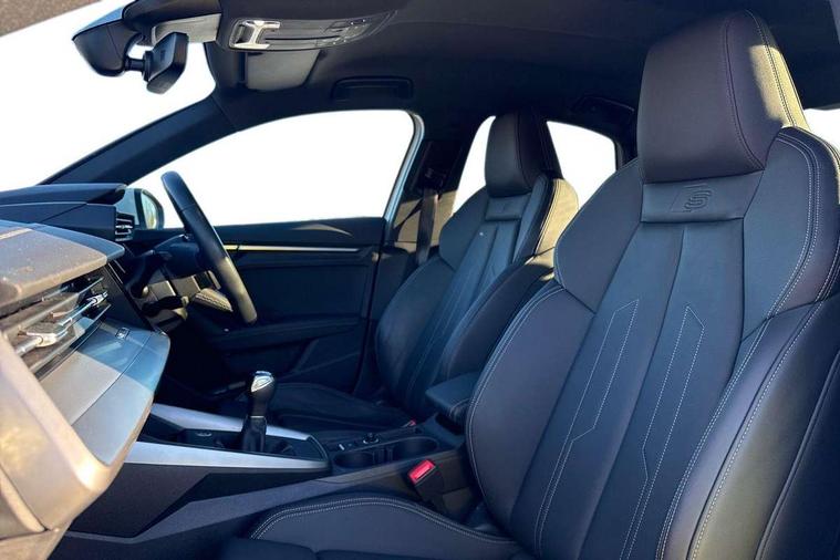 Aluminium air vent surrounds, Dark spectrum aluminium inlays, accent surfaces in the dashboard and centre console in platinum grey silk effect paint finish, Aluminium interior elements pack - A3 Saloon, LED interior lighting pack - A3 Saloon, S line styling pack - A3 Saloon, Anti theft alarm, Anti-theft wheel bolts, Electronically operated child locks, Immobiliser, Remote control central locking, 2xUSB-C connection with data and charging functions, 6 passive loudspeakers, CD player, DAB Digital radio, 3x3 point rear seat belts, Driver and front passenger airbag with passenger airbag deactivation, Electronic Stabilisation Control (ESC) including ABS, ASR and EDL, First aid kit with warning triangle and 2 safety vests, Front side airbags with head airbags and interaction airbag, Pre-sense front with pedestrian and cyclist detection, Seatbelt monitoring, Tyre pressure loss indicator, 3rd brake light, Acoustic glass windscreen, Aluminium window trim, Auto dimming frameless rear view mirror, Body colour exterior mirrors, Electrically adjustable/heated/folding/dimming door mirrors with kerb view includes integrated LED indications + kerb view function for passenger side, Front electric windows, Illuminated door sills with aluminium inserts at the front with S logo, LED daytime running lights, LED headlights with LED rear lights and dynamic rear indicators, Light and rain sensors, Model and engine designation badges at rear, Privacy glass - dark tinted rear window, rear door and side windows, Rear boot, Rear electric windows, Rear side wing doors, S line bumpers, S roof spoiler, 12V socket and storage compartment in front centre console, 3 seat bench in 2nd row, 3 spoke leather multifunction steering wheel, 4 way electrically adjustable lumbar support for driver and front passenger, 60/40 split folding rear seat bench, Black cloth headlining, Dual zone electronic climate control, Front and rear centre armrest in artificial leather, Front and rear headrests, Front/rear floor mats, Height and reach adjustable steering wheel, Interior lighting - glove compartment light and right hand side, Luggage compartment floor covering, Manual boot compartment lid, Manually adjustable front seats, Seat side bolsters, Single front passenger seat, Stainless steel pedals and front footrest in black, Twin leather upholstery with front sports seats S embossed logo, Audi drive select (Auto, Comfort, Dynamic and Individual), Audi smartphone interface, Audi Virtual Cockpit - 10.25" digital and colour instrument cluster, Automatic start/stop system with recuperation, Bluetooth interface, Camera based traffic sign recognition, Collision avoidance assistant, Cruise control + speed limiter, e-Call (emergency call), Electromechanical power speed sensitive steering, Lane departure warning system, MMI Navigation Plus with high resolution 10.1" colour touch screen display, Rear parking sensors, Service indicator, Trip computer, Voice control system with natural language interaction, Sports suspension,