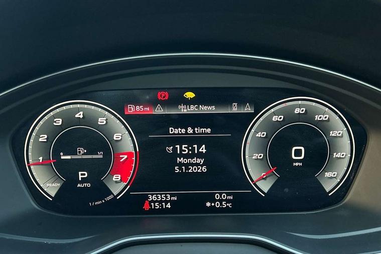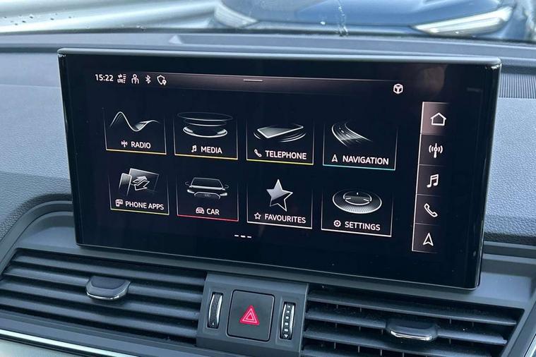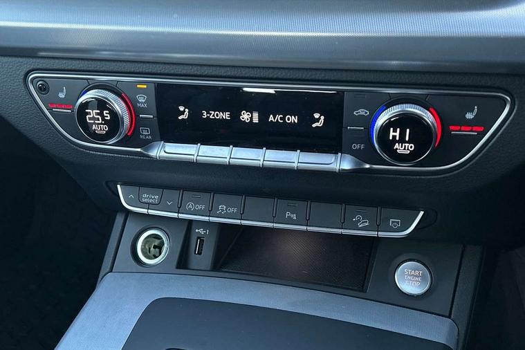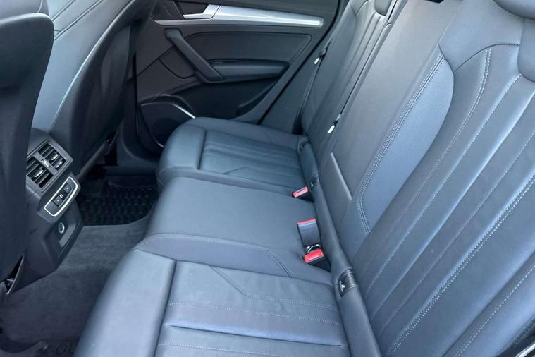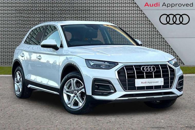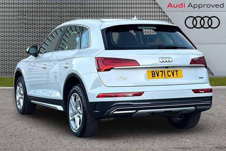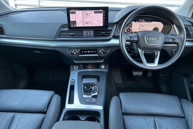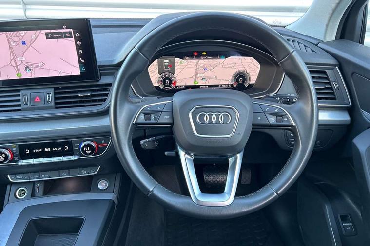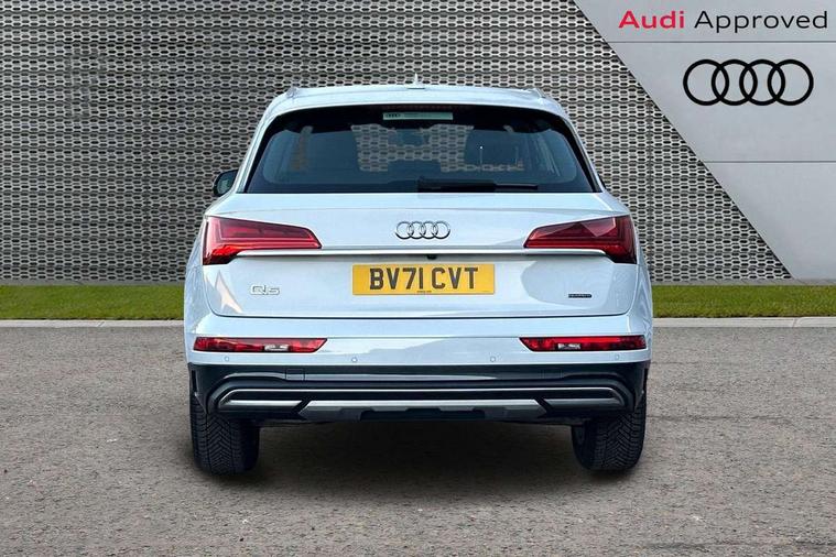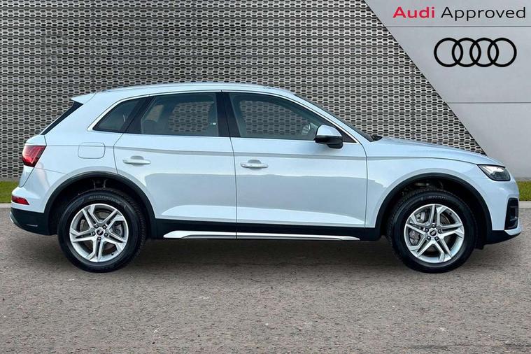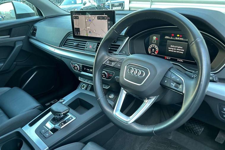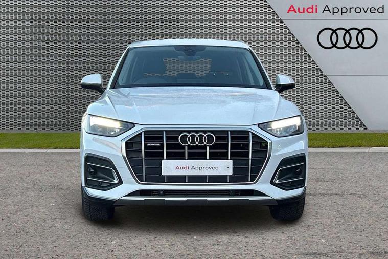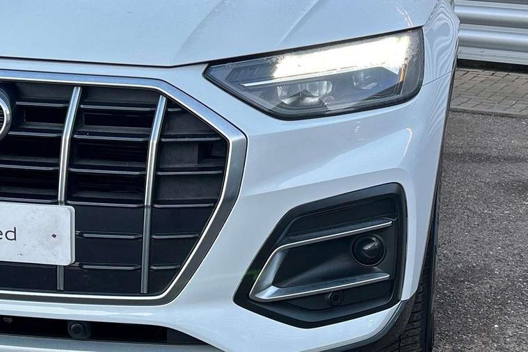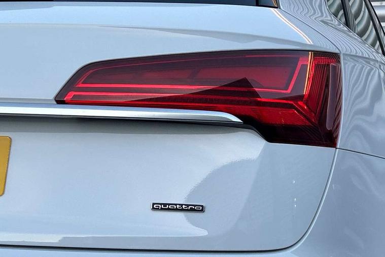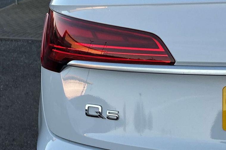 Aluminium rhombus inlay, High gloss pack - Q5, LED interior light pack - Q5, Anti theft alarm, Anti-theft wheel bolts, Keyless Go access/ignition system, DAB Digital radio, 3 point seatbelts on all seats, 6 airbags - Driver, front passenger, curtain and side airbags, Electrically operated child locks on rear doors, Electromechanical parking brake, Electronic stabilisation control including ABS, ASR and EDL, Front passenger airbag deactivation, Hill descent control, Hill hold assist, Multi collision brake assist, Pop-up bonnet for pedestrian protection, Pre sense city, Seat belt force limiter, Seatbelt monitoring, Tyre pressure warning, Warning triangle and first aid kit, Acoustic windscreen, Air inlets in matt titanium black with blades in matt aluminium silver, Aluminium roof rails, Auto dimming rear view mirror, Automatic headlights and windscreen wipers, Body colour bumpers, Body colour door mirrors, Chrome plated exhaust trims, Door sills in Selenite silver, Electric adjustable/heated/folding door mirrors, Front and rear electric windows, LED headlights and LED tail lights, Lower bumpers painted in contrast Manhattan grey, Matt selenite silver underbody protection, Matt twilight grey radiator grille with chrome vertical struts, Rear chrome trim strip below lights, Rear diffuser strip in selenite silver, Rear spoiler, Rear wiper, Roof bars, 2 x USB charging port with aux input socket, 3 rear headrests, 3 spoke multifunction leather steering wheel with shift paddles, 40:20:40 split folding rear seat with rear centre armrest, Comfort front centre armrest, Deluxe 3 zone electronic climate control, Door sills trims with aluminium inlays, Front/rear floor mats, Heated front seats, Height adjustable front head restraints, Height/reach adjustable steering column, ISOFIX child seat mounting and top tether, Luggage compartment cover, Manual seat adjustment with 4-way electric lumbar support, Removable luggage compartment floor, Silver cloth headlining, Sunvisors with vanity mirrors, Twin leather upholstery + front sports seats, Audi connect safety and service (e-call), Audi connect with Amazon Alexa Integration, Audi drive select, Audi virtual cockpit plus with 12.3" screen and three different layout designs, Audi wireless smartphone interface, Automatic start-stop system with coasting functionality and efficiency programme, Bluetooth interface, Cruise control + speed limiter, Electro - mechanical power assisted steering, MMI navigation plus with 10.1" touch screen, Power tailgate, Reversing camera, Service interval indicator, Voice control system with Audi hotword activation "Hey Audi", Dynamic suspension, Quattro on demand,