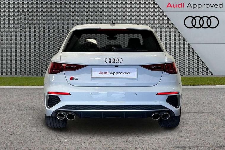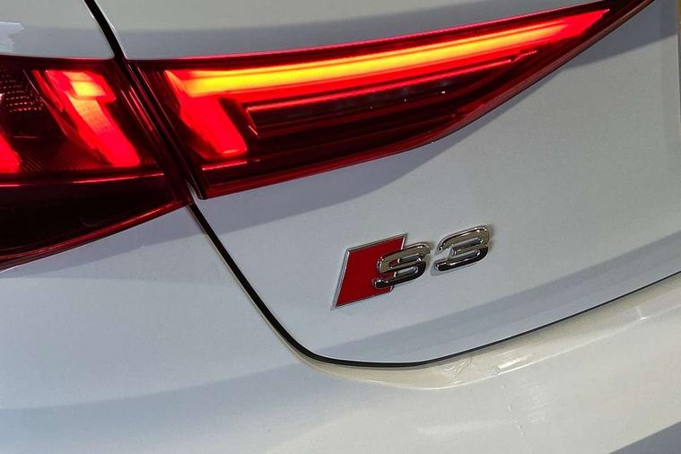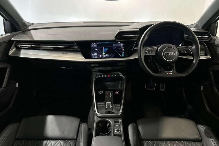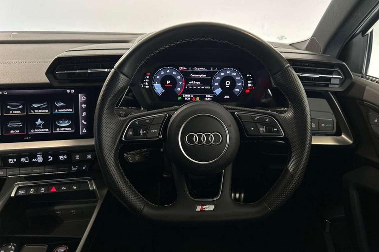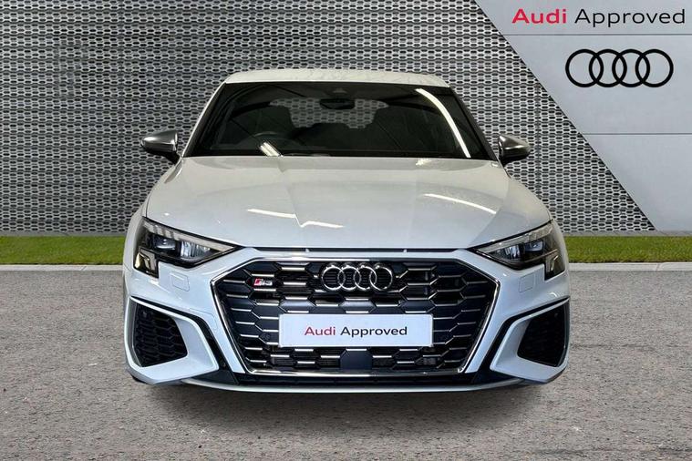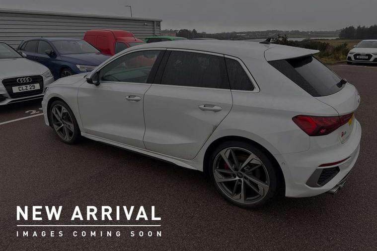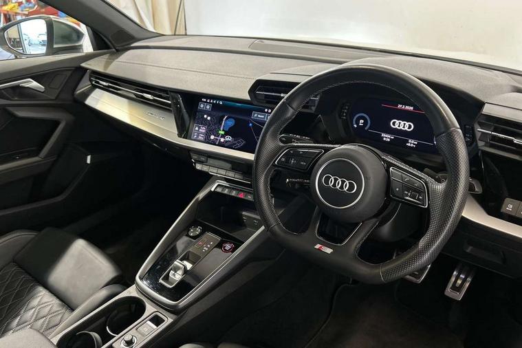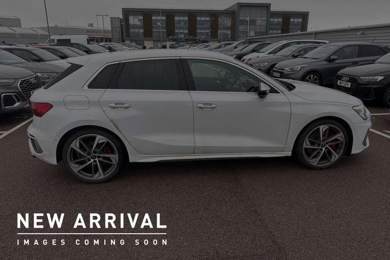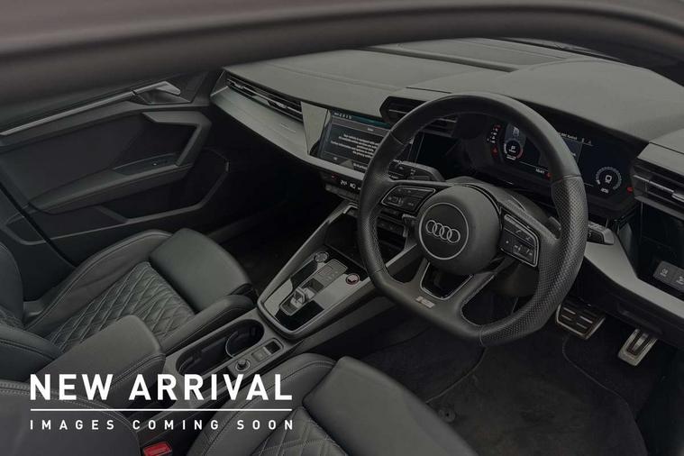 Accent surfaces in the dashboard and centre console in platinum grey silk effect paint finish, Dark spectrum aluminium inlays, Aluminium interior elements pack - A3 Sportback, Design body styling - A3 Sportback, LED interior lighting pack - A3 Sportback, Storage pack - A3 Sportback, Anti theft alarm, Anti-theft wheel bolts, Electronically operated child lock, Immobiliser, Remote control central locking, 2xUSB-C connection with data and charging functions, 6 passive loudspeakers, DAB Digital radio, 3x3 point rear seat belts, Audi pre sense front, Driver and front passenger airbag with passenger airbag deactivation, Electronic Stabilisation Control (ESC) including ABS, ASR and EDL, First aid kit with warning triangle and 2 safety vests, Front side airbags with head airbags and interaction airbag, Pre-sense front with pedestrian and cyclist detection, Seatbelt monitoring, Tyre pressure loss indicator, 3rd brake light, Acoustic glass windscreen, Aluminium window trim, Audi Beam uses LEDs to project the Audi S3 logo, Auto dimming frameless rear view mirror, Dual branch oval twin tailpipes in chrome plated finish, Electrically adjustable/heated/folding/dimming door mirrors with kerb view includes integrated LED indications + kerb view function for passenger side, Exterior mirror with aluminium look housing, Front electric windows, Headlight washers, Illuminated aluminium inserts front door sills with S logo, LED daytime running lights, LED headlights with LED rear lights and dynamic rear indicators, Light and rain sensors, Privacy glass - dark tinted rear window, rear door and side windows, Rear electric windows, Rear side air outlets in grained matt black, Rear side wing doors, Rear wiper, 12V socket and storage compartment in front centre console, 3 seat bench in 2nd row, 40/20/40 split folding rear seat bench with cupholder, Black cloth headlining, Dual zone electronic climate control, Fine Nappa leather upholstery with front sports seats S embossed logo, Front and rear centre armrest in leather, Front and rear headrests, Front/rear floor mats, Heated front seats, Height and reach adjustable steering wheel, Illuminated vanity mirror, Interior lighting - glove compartment light and right hand side, Luggage compartment floor covering, Manual boot compartment lid, Manually adjustable front seats, Seat side bolsters, Single front passenger seat, Stainless steel pedals and front footrest in black, Audi drive select (Auto, Comfort, Dynamic, Efficiency and Individual), Audi smartphone interface, Audi Virtual Cockpit - 10.25" digital and colour instrument cluster, Automatic start/stop system with recuperation, Bluetooth interface, Collision avoidance assistant, e-Call (emergency call), Lane departure warning system, MMI Navigation Plus with high resolution 10.1" colour touch screen display, Progressive steering, Service indicator, Trip computer, Voice control system with natural language interaction, Quattro permanent all wheel drive, S sports suspension,