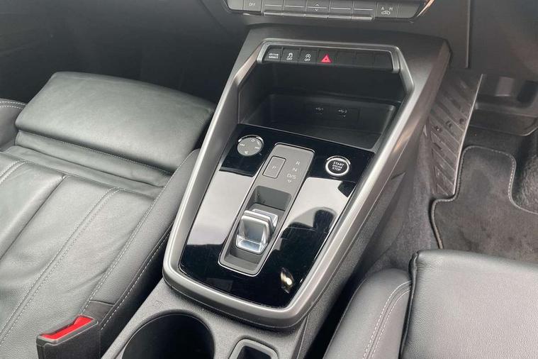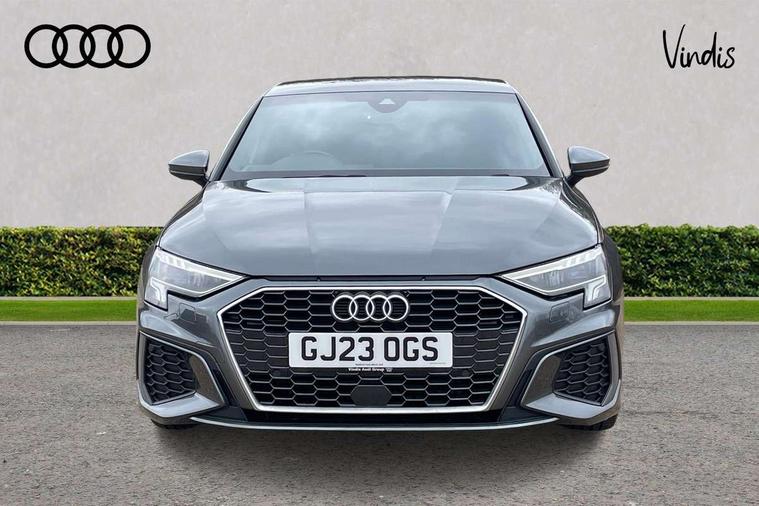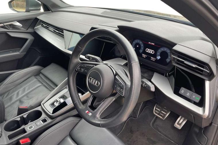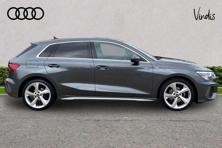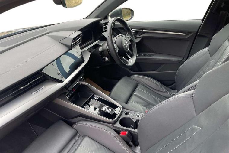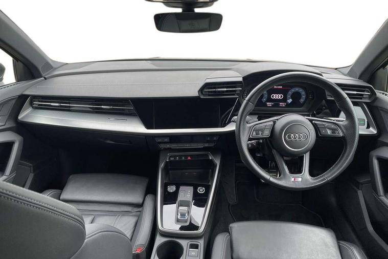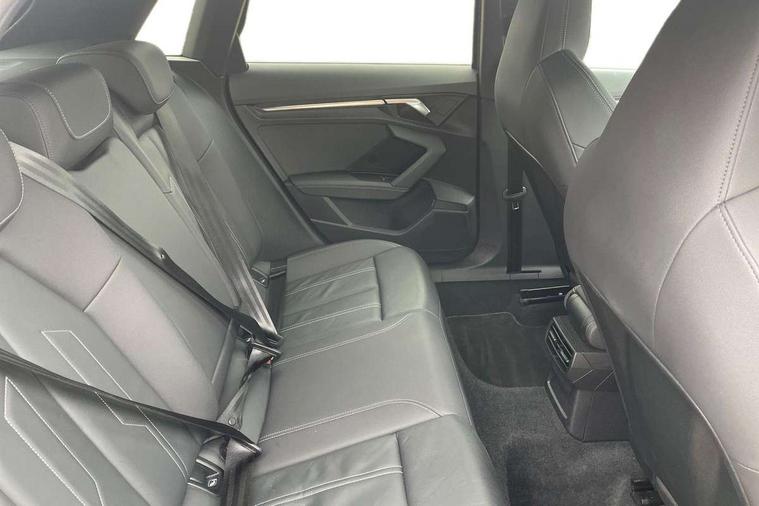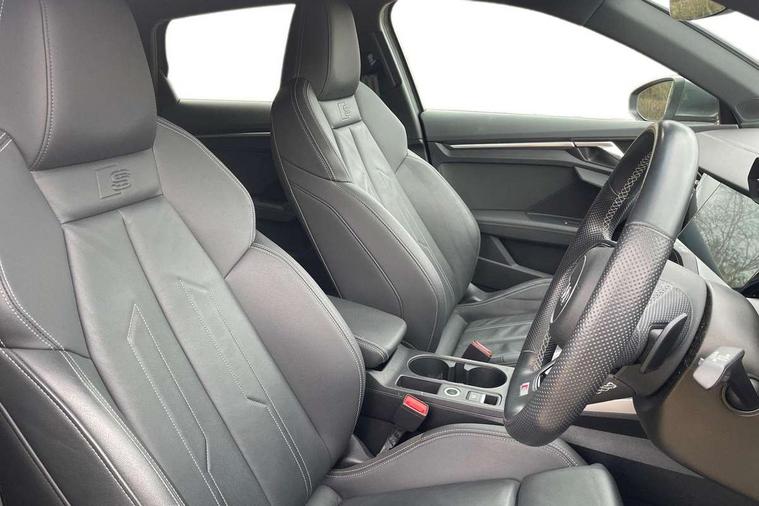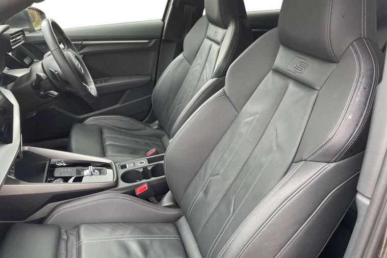Accent surfaces in the dashboard and centre console in platinum grey silk effect paint finish, Dark spectrum aluminium inlays, Aluminium interior elements pack - A3 Sportback, LED interior lighting pack - A3 Sportback, S line styling pack - A3 Sportback, Anti theft alarm, Anti-theft wheel bolts, Electronically operated child lock, Immobiliser, Remote control central locking, 2xUSB-C connection with data and charging functions, 6 passive loudspeakers, DAB Digital radio, 3x3 point rear seat belts, Audi pre sense front, Driver and front passenger airbag with passenger airbag deactivation, Electronic Stabilisation Control (ESC) including ABS, ASR and EDL, First aid kit with warning triangle and 2 safety vests, Front side airbags with head airbags and interaction airbag, Pre-sense front with pedestrian and cyclist detection, Seatbelt monitoring, Tyre pressure loss indicator, 3rd brake light, Acoustic glass windscreen, Aluminium window trim, Auto dimming frameless rear view mirror, Body colour exterior mirrors, Electrically adjustable/heated/folding/dimming door mirrors with kerb view includes integrated LED indications + kerb view function for passenger side, Front electric windows, Illuminated aluminium inserts front door sills with S logo, LED daytime running lights, LED headlights with LED rear lights and dynamic rear indicators, Light and rain sensors, Privacy glass - dark tinted rear window, rear door and side windows, Rear electric windows, Rear side air outlets in grained matt black, Rear side wing doors, Rear wiper, S line bumpers, S roof spoiler, 12V socket and storage compartment in front centre console, 3 seat bench in 2nd row, 3 spoke leather multifunction steering wheel with paddle shift, 40/20/40 split folding rear seat bench with cupholder, Black cloth headlining, Dual zone electronic climate control, Front and rear centre armrest in leather, Front and rear headrests, Front/rear floor mats, Height and reach adjustable steering wheel, Illuminated vanity mirror, Interior lighting - glove compartment light and right hand side, Luggage compartment floor covering, Manual boot compartment lid, Manually adjustable front seats, Seat side bolsters, Single front passenger seat, Stainless steel pedals and front footrest in black, Twin leather upholstery with front sports seats S embossed logo, Audi drive select (Auto, Comfort, Dynamic, Efficiency and Individual), Audi smartphone interface, Audi Virtual Cockpit - 10.25" digital and colour instrument cluster, Automatic start/stop system with recuperation, Bluetooth interface, Collision avoidance assistant, e-Call (emergency call), Electromechanical power speed sensitive steering, Lane departure warning system, MMI Navigation Plus with high resolution 10.1" colour touch screen display, Service indicator, Trip computer, Voice control system with natural language interaction, Sports suspension,