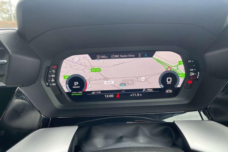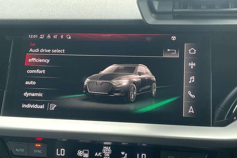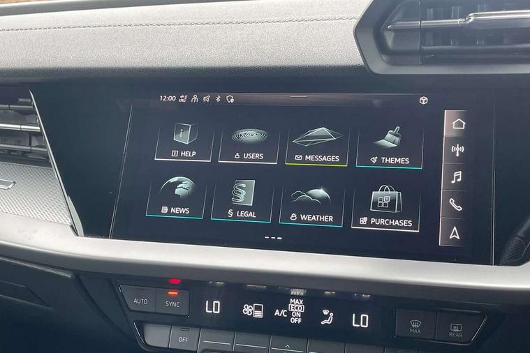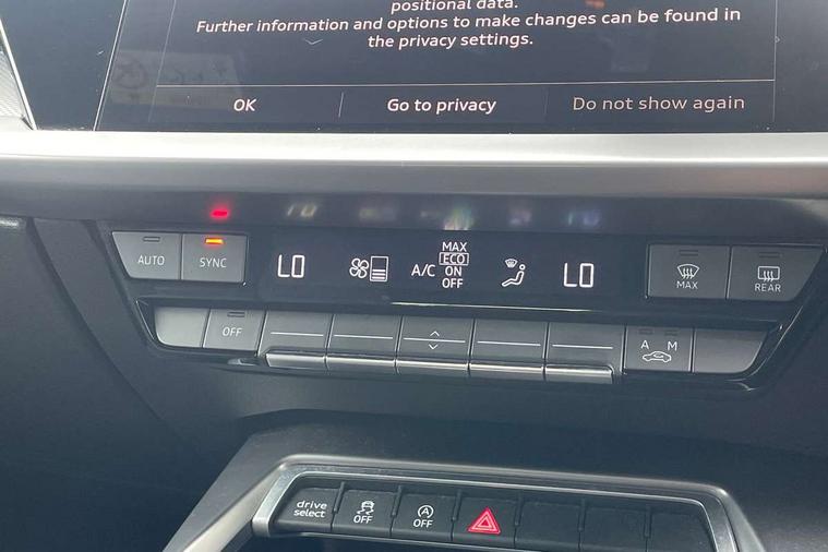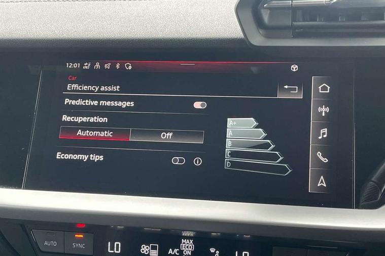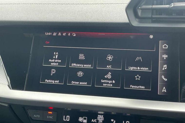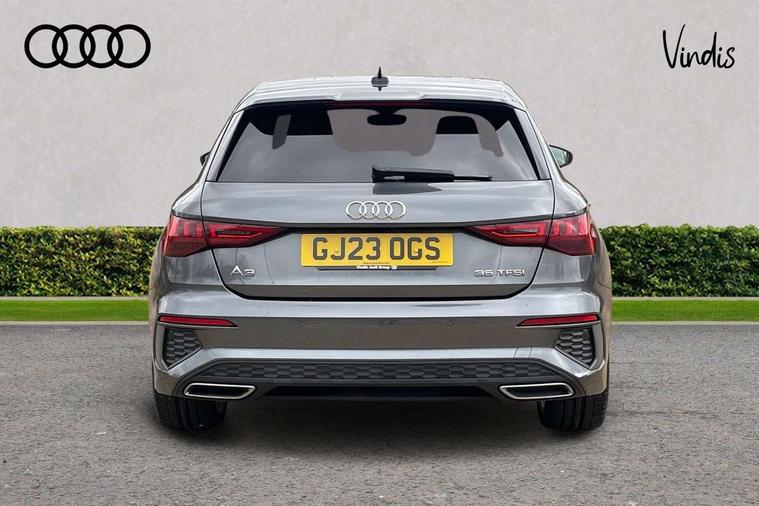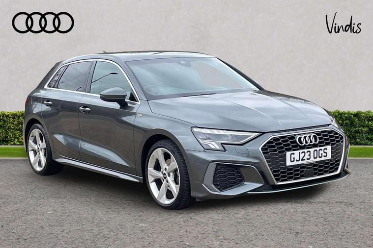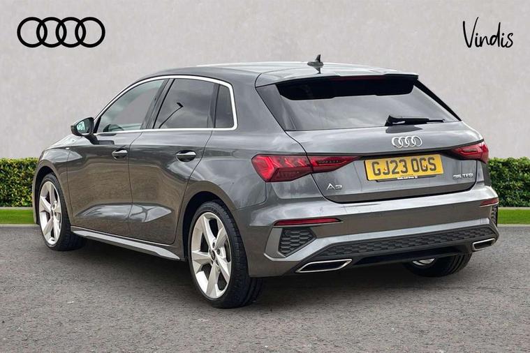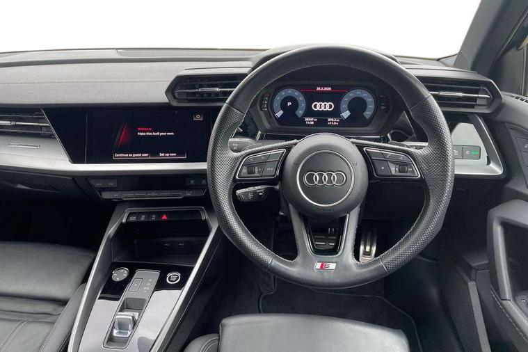 Accent surfaces in the dashboard and centre console in platinum grey silk effect paint finish, Dark spectrum aluminium inlays, Aluminium interior elements pack - A3 Sportback, LED interior lighting pack - A3 Sportback, S line styling pack - A3 Sportback, Anti theft alarm, Anti-theft wheel bolts, Electronically operated child lock, Immobiliser, Remote control central locking, 2xUSB-C connection with data and charging functions, 6 passive loudspeakers, DAB Digital radio, 3x3 point rear seat belts, Audi pre sense front, Driver and front passenger airbag with passenger airbag deactivation, Electronic Stabilisation Control (ESC) including ABS, ASR and EDL, First aid kit with warning triangle and 2 safety vests, Front side airbags with head airbags and interaction airbag, Pre-sense front with pedestrian and cyclist detection, Seatbelt monitoring, Tyre pressure loss indicator, 3rd brake light, Acoustic glass windscreen, Aluminium window trim, Auto dimming frameless rear view mirror, Body colour exterior mirrors, Electrically adjustable/heated/folding/dimming door mirrors with kerb view includes integrated LED indications + kerb view function for passenger side, Front electric windows, Illuminated aluminium inserts front door sills with S logo, LED daytime running lights, LED headlights with LED rear lights and dynamic rear indicators, Light and rain sensors, Privacy glass - dark tinted rear window, rear door and side windows, Rear electric windows, Rear side air outlets in grained matt black, Rear side wing doors, Rear wiper, S line bumpers, S roof spoiler, 12V socket and storage compartment in front centre console, 3 seat bench in 2nd row, 3 spoke leather multifunction steering wheel with paddle shift, 40/20/40 split folding rear seat bench with cupholder, Black cloth headlining, Dual zone electronic climate control, Front and rear centre armrest in leather, Front and rear headrests, Front/rear floor mats, Height and reach adjustable steering wheel, Illuminated vanity mirror, Interior lighting - glove compartment light and right hand side, Luggage compartment floor covering, Manual boot compartment lid, Manually adjustable front seats, Seat side bolsters, Single front passenger seat, Stainless steel pedals and front footrest in black, Twin leather upholstery with front sports seats S embossed logo, Audi drive select (Auto, Comfort, Dynamic, Efficiency and Individual), Audi smartphone interface, Audi Virtual Cockpit - 10.25" digital and colour instrument cluster, Automatic start/stop system with recuperation, Bluetooth interface, Collision avoidance assistant, e-Call (emergency call), Electromechanical power speed sensitive steering, Lane departure warning system, MMI Navigation Plus with high resolution 10.1" colour touch screen display, Service indicator, Trip computer, Voice control system with natural language interaction, Sports suspension,