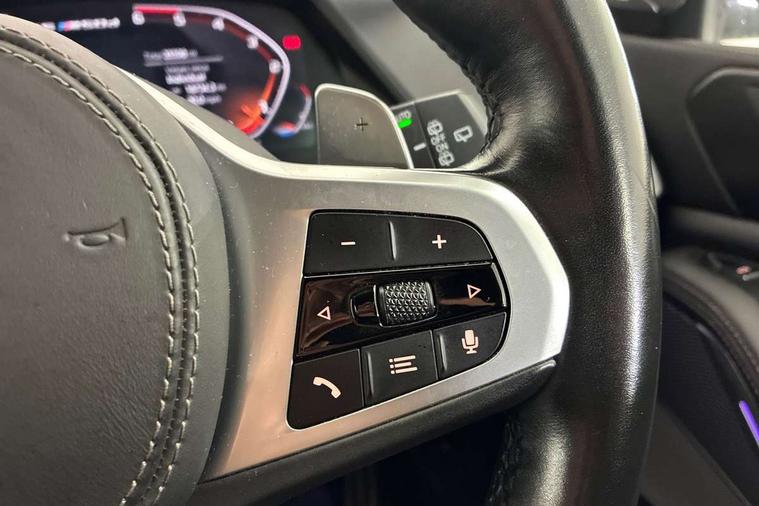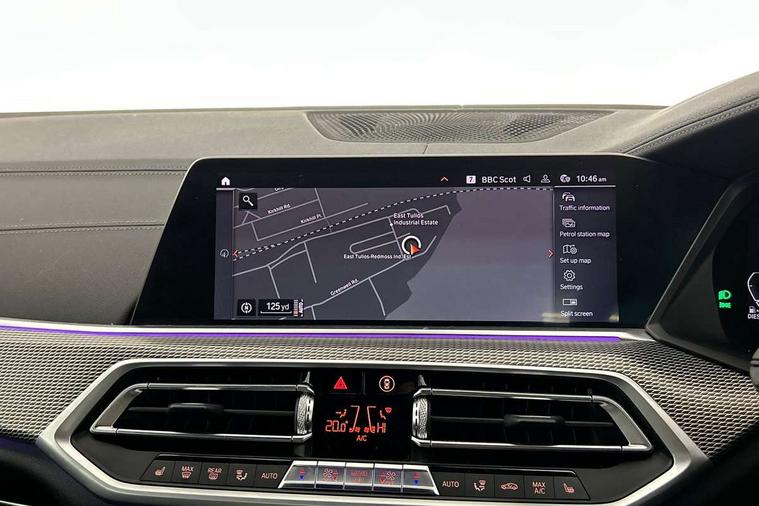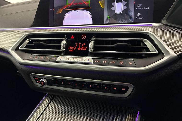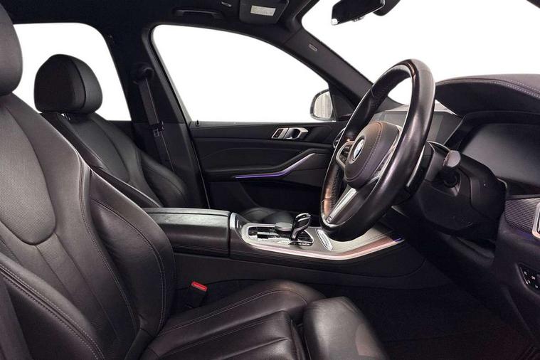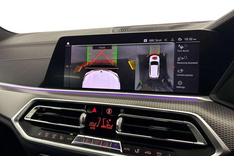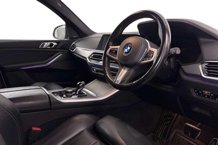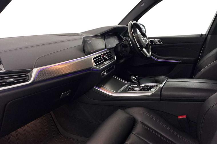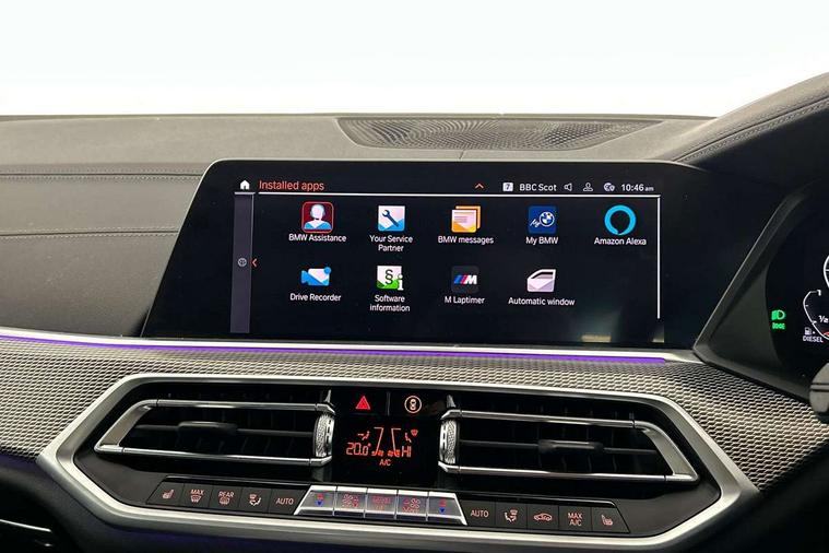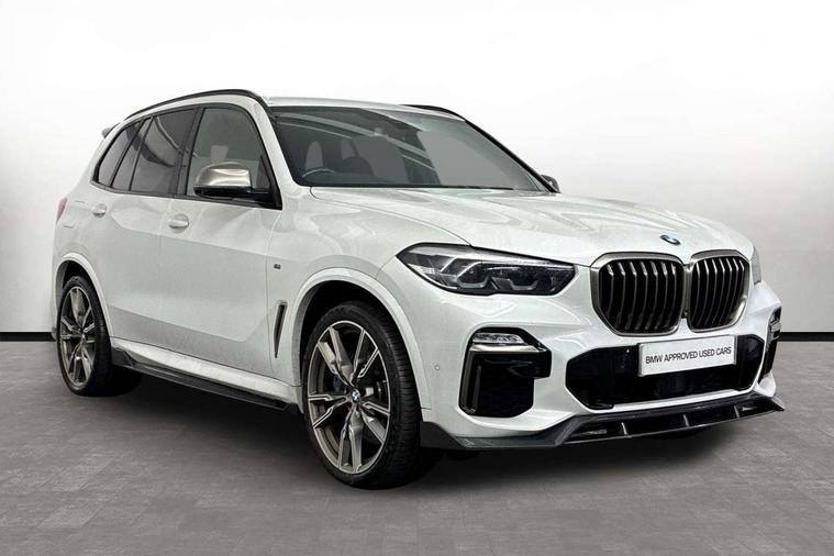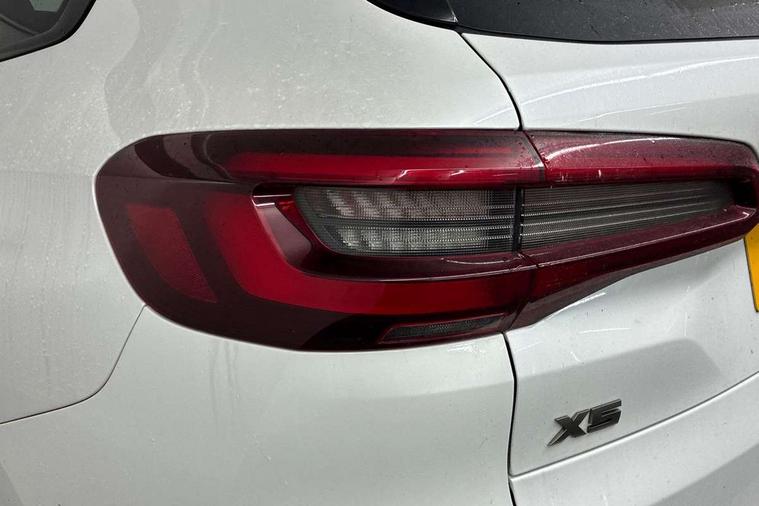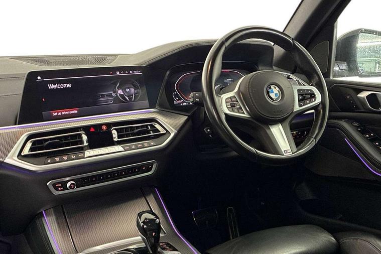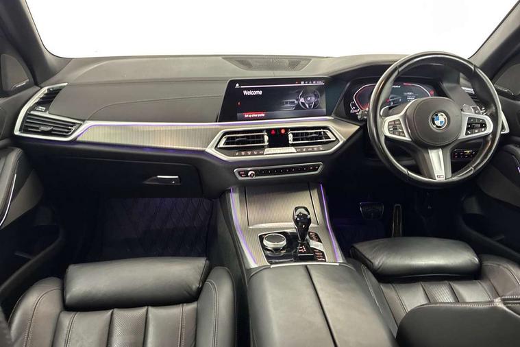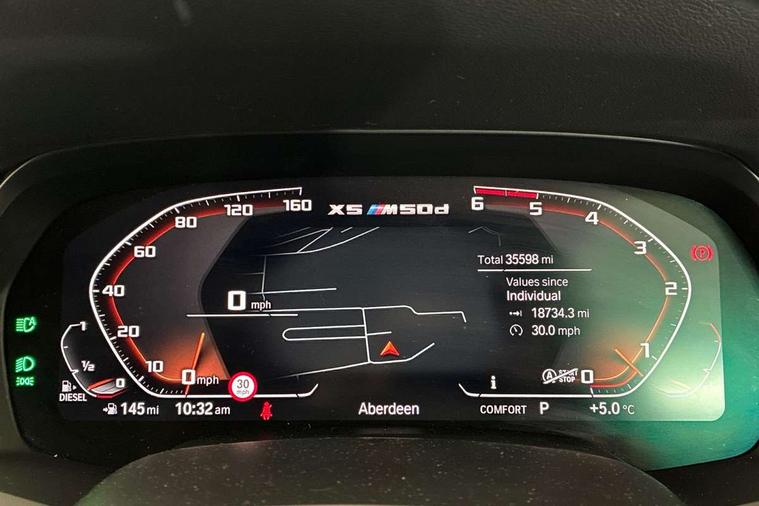 Start/stop toggle diamond shaped trim finisher in pearl chrome, Connected Package Professional - X5, Expanded exterior mirror pack - X5/X5 M, Non-smokers pack - X5, Tyre repair kit, Closing system with central locking, Driver and front passenger door centre lock switch, Locking wheel bolts, Thatcham 1 alarm system with remote control and engine immobiliser, DAB Tuner enables digital radio reception, Favourite buttons, USB connection, USB type A 1.5A in cupholder, USB Type C 3A in centre armrest, Active protection, Airbags - driver/front passenger, rear and side, first and second row seats head airbags, front passenger seat airbag deactivation + knee airbag, Anti-lock braking system (ABS), Automatic Stability Control (ASC), Brake drying, Brake energy regeneration, Brake fade compensation, Braking pre-tensioning, Cornering brake control (CBC), Crash sensor activating central locking release, hazard warning lights, fuel cut off, interior lighting + activation of safety battery terminal clamp, Deformation zones - front and rear with door reinforcements and bumpers up to 2.5 mph, DSC - Dynamic Stability Control, Dynamic brake control, Dynamic Traction Control - DTC, Electromechanical parking brake with automatic drive away release and auto hold function, Electronic brake force distribution, Front and rear seatbelts with seatbelt stopper, seatbelt tensioner for front and outer rear seats and belt force limiter, Front head restraints with anti-whiplash, Height adjustable front seatbelts, Hill start assistant, Integrated brake system, M Sport braking system in blue high gloss + blue painted brake calipers with M designation, M sport seatbelt, Mechanical child proof lock on rear doors, Passive protection for pedestrians, Seat occupancy detection for driver and passenger side, Side impact protection, Three 3 point inertia reel seatbelts, Two tone horn, Tyre pressure monitoring system, Ventilated front and rear disc brakes, Warning triangle and first aid kit, Adaptive air flap control bar in high-gloss black, Automatically dimming rear view mirror, Body colour bumpers, Body colour door handles, Cerium grey kidney grille, Cerium grey M badge on left and right side panels, Cerium grey M50d badge on right tailgate, Cerium grey side gill, Dynamic brake lights with LED technology, Exhaust tailpipes - single, left and right in Cerium Grey, Follow me home headlight function, Front and rear electric windows with open and close fingertip control, anti trap facility and comfort closing, Heated windscreen washer jets, High gloss black outer and central air intakes on front bumper with pearlescent chrome finish, High gloss black Side elements, LED daytime running lights, LED fog lights, LED rear lights, M aerodynamic body styling, M Sport exhaust system, Rain sensor with automatic headlight activation and windscreen wiper control, Satin aluminium side window graphic, Third brake light in rear spoiler, Variable intermittent rear wash/wipe, Welcome light carpet, X5 on left tailgate, xDrive designation on right tailgate, 12V - Power sockets with 2x centre console and 1x luggage compartment, 40:20:40 split folding rear seats, Ambient interior lighting with 6 pre-designed selectable lights including dynamic function, Centre and rear interior light, Child seat ISOFIX attachment with rear outer seats includes top tether, Electric front seat adjustment with driver and front passenger memory function, Electrical steering column with adjustable height and length with activation and control on the steering column, Foldable rear centre armrest with 2 cupholders and storage compartment, Front and rear cupholders x 2, Front and rear door pockets, Front and rear door sill finishers with illuminated M50i designation, Front and rear side armrest integrated into door trim, Front footwell lights, Front reading lights, Light inside glove compartment, Lockable glove compartment, Luggage compartment floor panel with integral storage tray, Luggage compartment lighting, M leather steering wheel, M specific key, M specific pedals, M specific steering wheel, M specific velour floor mats, Make-up mirror lights, Multifunction controls for leather steering wheel, Multifunctional hooks, Rear head restraints, Seat back with flap pocket, Securing rings in luggage compartment, Storage bins on all doors, Storage tray and compartment with cover in centre console, Sunvisors with illuminated vanity mirrors, Toolkit located in luggage compartment, 20GB hard disc drive (HDD) memory, Active guard plus, Attentiveness assist, Automatic tailgate with top hinged section open and manual bottom hinged section, BMW ConnectedDrive online services, BMW digital live cockpit professional - 12.3" digital instrument panel and 12.3" CID, with touch/voice command, BMW legal emergency call, BMW Teleservices, Brake force display, Brake pad wear indicator warning light, Enhanced bluetooth hands free facility with Telephony wireless charging, Front/rear park distance control, Galvanised plastic keyfob, iDrive touch controller with shortcut buttons, Infinity symbol with line graphic on reset of average consumption, Lights on warning, Oil sensor for level and grade, On board computer inc. average speed, fuel consumption, liquid crystal Info display, journey computer, outside temperature display, personal profile, Service interval indicator, Speed limit info display, Wi-Fi hotspot, Diesel particulate filter, Double wishbone front axle, Drive performance control with ECO PRO comfort + sport mode, Eight speed steptronic sport automatic transmission and gearshift paddles on the steering wheel, M Sport differential, Safety battery terminal clamp, Variable vane geometry,