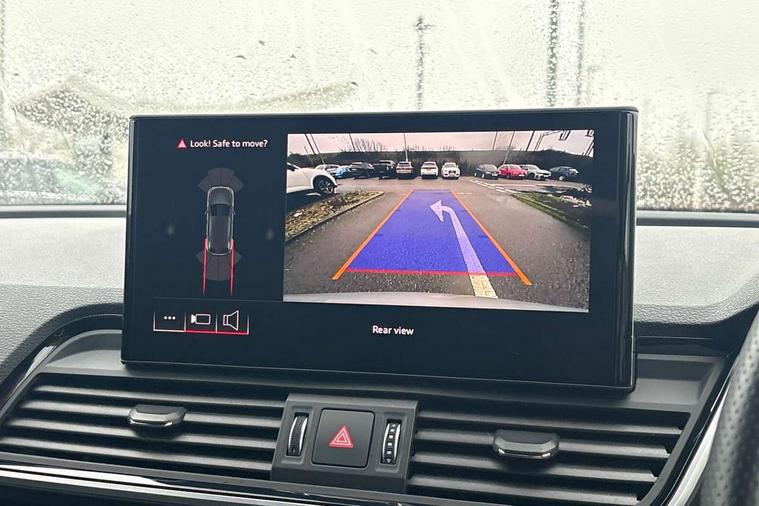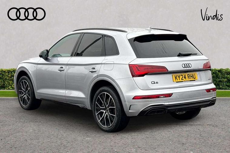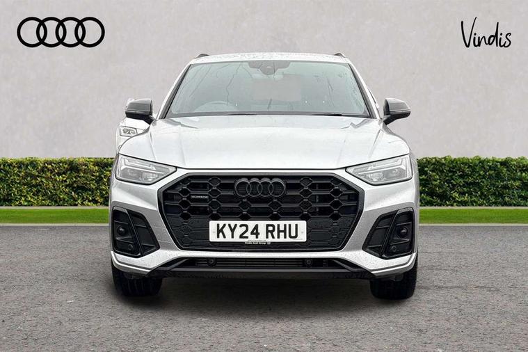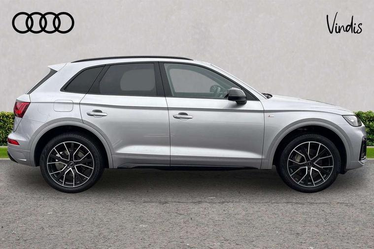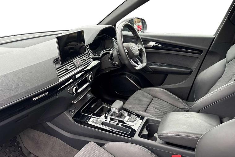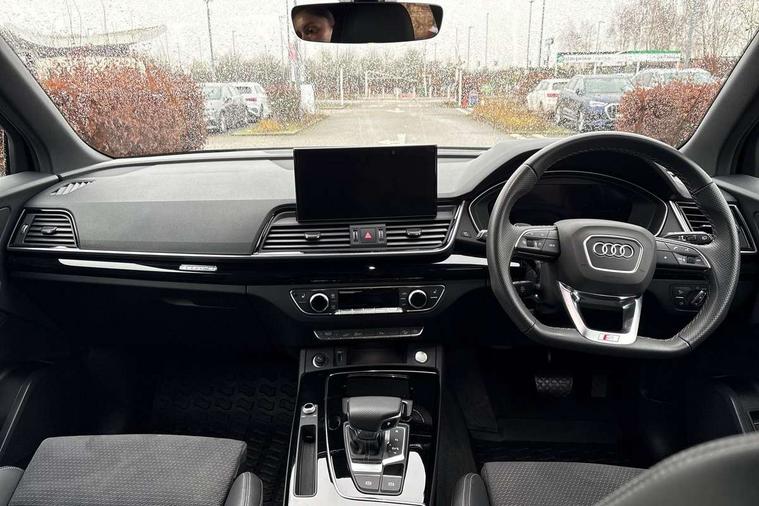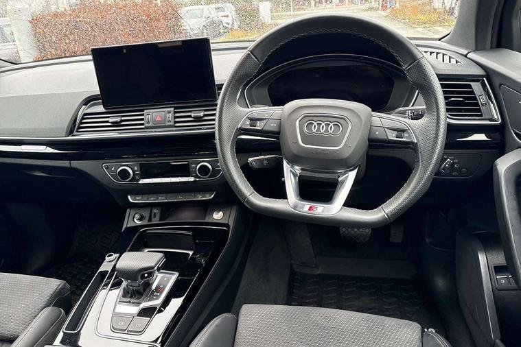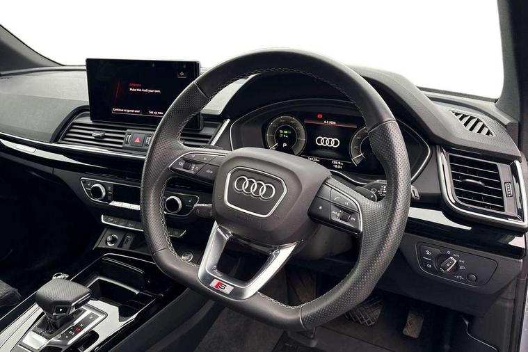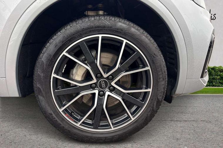 Air vents inserts and centre console in gloss black, High gloss pack - Q5, LED interior light pack - Q5, Tyre repair kit, Anti theft alarm, Anti-theft wheel bolts, Remote central locking, Remote control key with SAFELOCK and keyless go, 8 loudspeakers, DAB Digital radio, 3 point seatbelts on all seats, 6 airbags - Driver, front passenger, curtain and side airbags, Attention and drowsiness assist, Electrically operated child locks on rear doors, Electromechanical parking brake, Electronic stabilisation control including ABS, ASR and EDL, First aid kit with warning triangle and vests, Front passenger airbag deactivation, Hill descent control, Hill hold assist, ISOFIX child seat mounting for front passenger seat and ISOFIX child seat mounting with Top Tether for outer rear seats, Multi collision brake assist, Pop-up bonnet for pedestrian protection, Pre sense city, Seatbelt monitoring, Tyre pressure warning, Acoustic windscreen, Auto dimming door mirrors, Auto dimming frameless rear view mirror, Automatic headlight adjustment, Automatic headlights and windscreen wipers, Black roof rails, Black styling with black rings, Body colour bumpers, Body colour rear diffuser with matt aluminium silver surrounds, Body colour underbody protection, Chrome plated exhaust trims, Daytime running lights, Door sills in Selenite silver, Electric adjustable/heated/folding door mirrors, Front air inlet surrounds in aluminium, Front and rear electric windows, Front radiator grille in honeycomb design, LED 3rd brake light, LED headlights and LED tail lights, Lower bumpers painted in contrast Manhattan grey, Rear chrome trim strip below lights, Rear privacy glass and rear side windows, Rear side wing doors, Rear wiper, Roof bars, S Line badges on the front wing panels, S Line front and rear bumpers, S Line rear spoiler, S Line side skirts, 2 x USB charging port with aux input socket, 3 rear headrests, 3 seater rear seat bench, Black cloth headlining, Comfort front centre armrest, Contrast stitching on seats, steering wheel and gear lever gaiter, Deluxe 3 zone electronic climate control, Front head restraints, Front sport seats with S embossed logo, Front/rear floor mats, Gear lever in black leather, Heated front seats, Height/reach adjustable steering column, Illuminated door sill trims with S logo, Loading edge protection in stainless steel, Luggage compartment cover, Manual seat adjustment with 4-way electric lumbar support, Rear seat bench plus-adjust for forwards/backwards position/backrest angle, load through hatch and remote backrest release, Single front passenger seat, Sunvisors with vanity mirrors, Tool kit, Top surface of the rear centre armrest in artificial leather, Acoustic front and rear parking sensor, Audi connect safety and service (e-call), Audi drive select, Audi virtual cockpit with 12.3" screen with specific display, Audi wireless smartphone interface, Automatic start-stop system with coasting functionality and efficiency programme, Bluetooth interface, Camera based traffic sign recognition, Electro - mechanical power assisted steering, Lane departure warning, MMI navigation plus with 10.1" touch screen, Power tailgate, Reversing camera, Service interval indicator, Voice control system with Audi hotword activation "Hey Audi", 3 pin 10 amp domestic charging cable, 7.4 kW onboard charger, Dynamic suspension, Industrial connector CEE 32A, 230V, Quattro on demand, Type 2 mode 3 22kW 32 amp charging cable, Type 2 socket for AC charging,