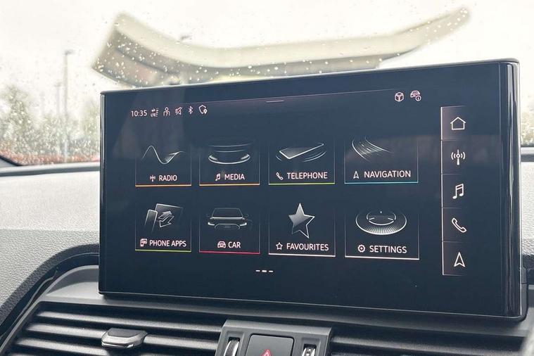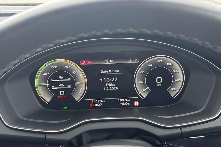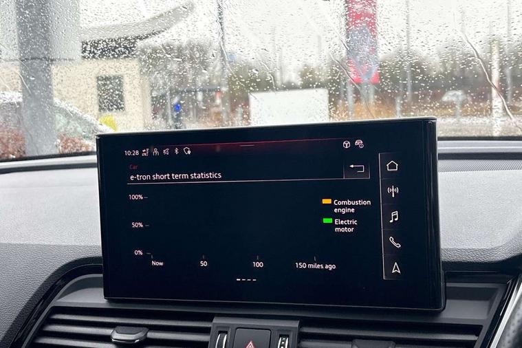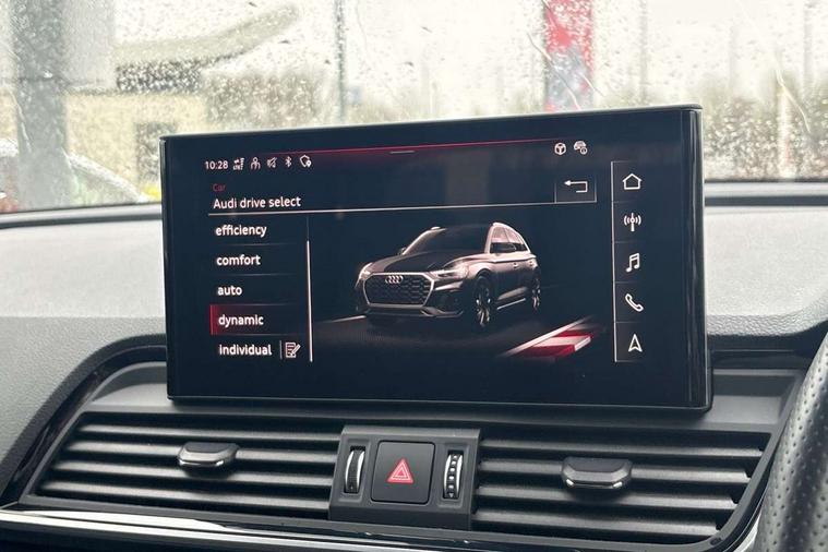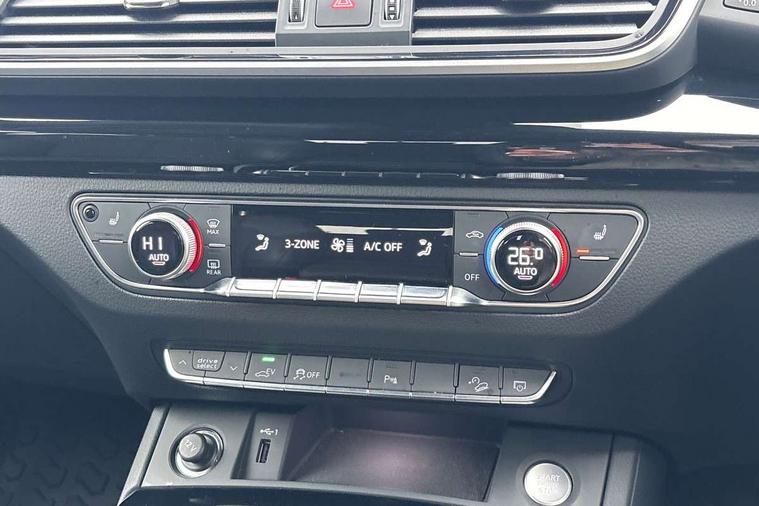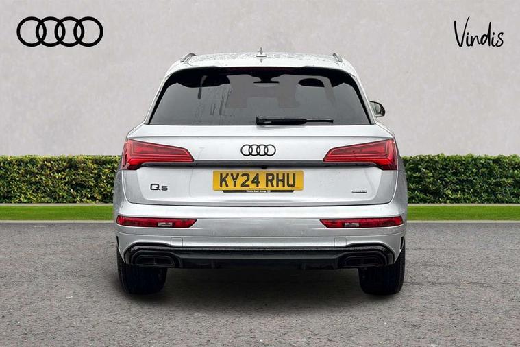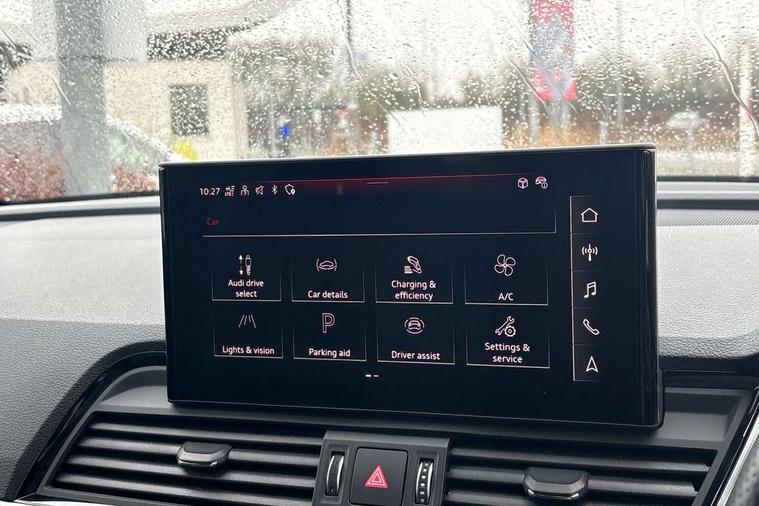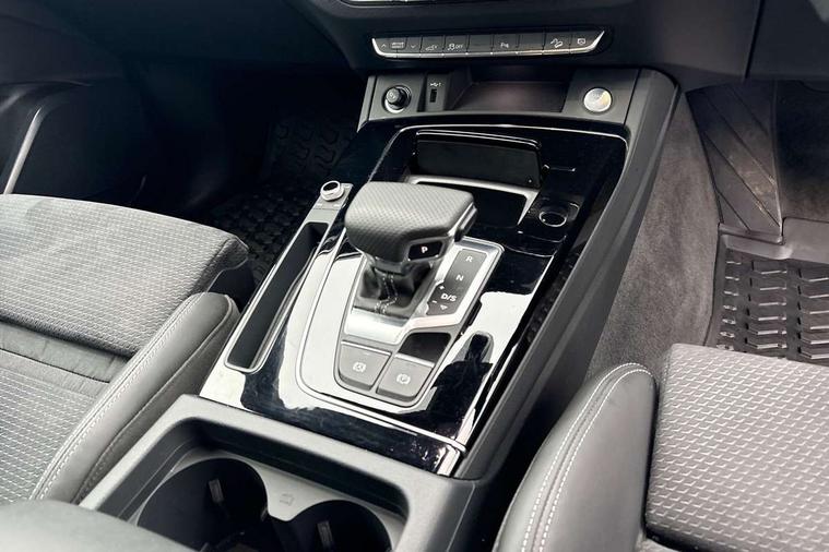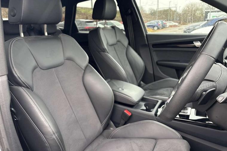 Air vents inserts and centre console in gloss black, High gloss pack - Q5, LED interior light pack - Q5, Tyre repair kit, Anti theft alarm, Anti-theft wheel bolts, Remote central locking, Remote control key with SAFELOCK and keyless go, 8 loudspeakers, DAB Digital radio, 3 point seatbelts on all seats, 6 airbags - Driver, front passenger, curtain and side airbags, Attention and drowsiness assist, Electrically operated child locks on rear doors, Electromechanical parking brake, Electronic stabilisation control including ABS, ASR and EDL, First aid kit with warning triangle and vests, Front passenger airbag deactivation, Hill descent control, Hill hold assist, ISOFIX child seat mounting for front passenger seat and ISOFIX child seat mounting with Top Tether for outer rear seats, Multi collision brake assist, Pop-up bonnet for pedestrian protection, Pre sense city, Seatbelt monitoring, Tyre pressure warning, Acoustic windscreen, Auto dimming door mirrors, Auto dimming frameless rear view mirror, Automatic headlight adjustment, Automatic headlights and windscreen wipers, Black roof rails, Black styling with black rings, Body colour bumpers, Body colour rear diffuser with matt aluminium silver surrounds, Body colour underbody protection, Chrome plated exhaust trims, Daytime running lights, Door sills in Selenite silver, Electric adjustable/heated/folding door mirrors, Front air inlet surrounds in aluminium, Front and rear electric windows, Front radiator grille in honeycomb design, LED 3rd brake light, LED headlights and LED tail lights, Lower bumpers painted in contrast Manhattan grey, Rear chrome trim strip below lights, Rear privacy glass and rear side windows, Rear side wing doors, Rear wiper, Roof bars, S Line badges on the front wing panels, S Line front and rear bumpers, S Line rear spoiler, S Line side skirts, 2 x USB charging port with aux input socket, 3 rear headrests, 3 seater rear seat bench, Black cloth headlining, Comfort front centre armrest, Contrast stitching on seats, steering wheel and gear lever gaiter, Deluxe 3 zone electronic climate control, Front head restraints, Front sport seats with S embossed logo, Front/rear floor mats, Gear lever in black leather, Heated front seats, Height/reach adjustable steering column, Illuminated door sill trims with S logo, Loading edge protection in stainless steel, Luggage compartment cover, Manual seat adjustment with 4-way electric lumbar support, Rear seat bench plus-adjust for forwards/backwards position/backrest angle, load through hatch and remote backrest release, Single front passenger seat, Sunvisors with vanity mirrors, Tool kit, Top surface of the rear centre armrest in artificial leather, Acoustic front and rear parking sensor, Audi connect safety and service (e-call), Audi drive select, Audi virtual cockpit with 12.3" screen with specific display, Audi wireless smartphone interface, Automatic start-stop system with coasting functionality and efficiency programme, Bluetooth interface, Camera based traffic sign recognition, Electro - mechanical power assisted steering, Lane departure warning, MMI navigation plus with 10.1" touch screen, Power tailgate, Reversing camera, Service interval indicator, Voice control system with Audi hotword activation "Hey Audi", 3 pin 10 amp domestic charging cable, 7.4 kW onboard charger, Dynamic suspension, Industrial connector CEE 32A, 230V, Quattro on demand, Type 2 mode 3 22kW 32 amp charging cable, Type 2 socket for AC charging,