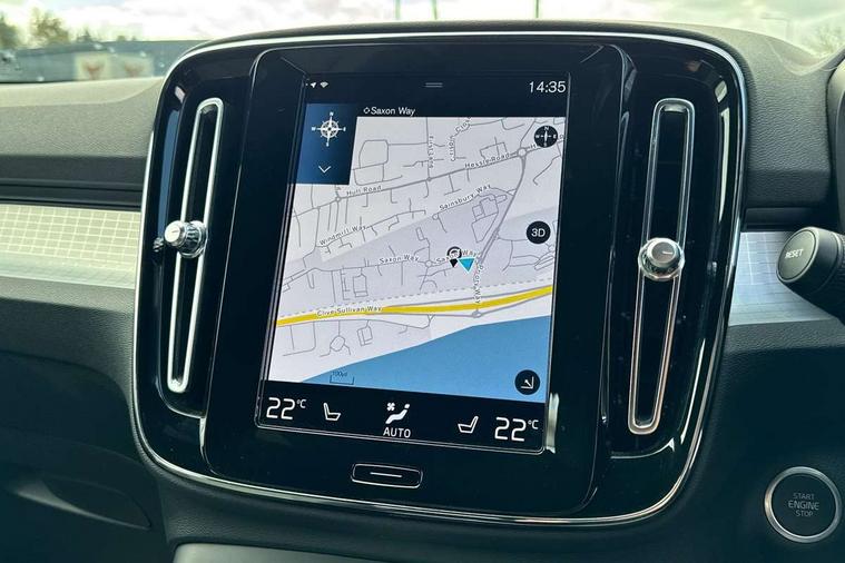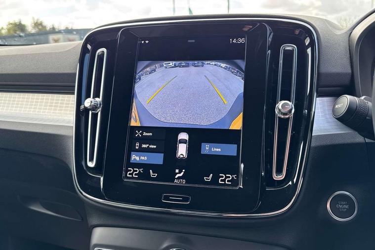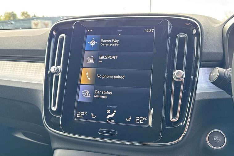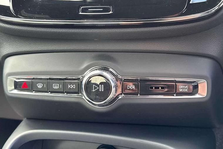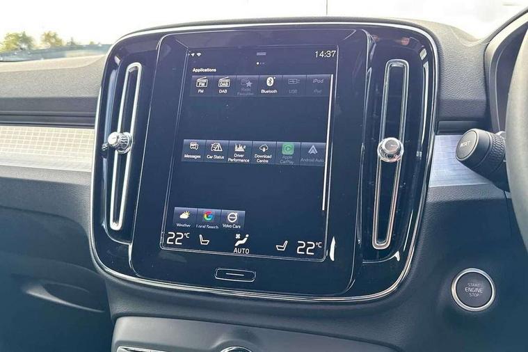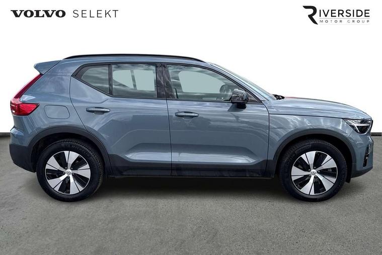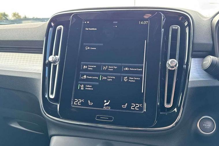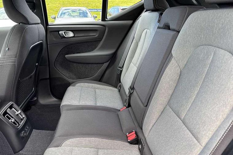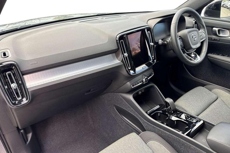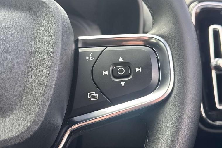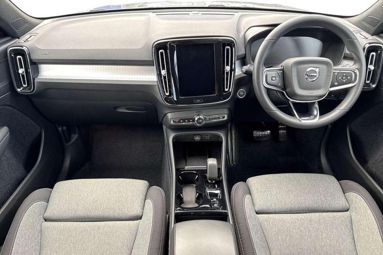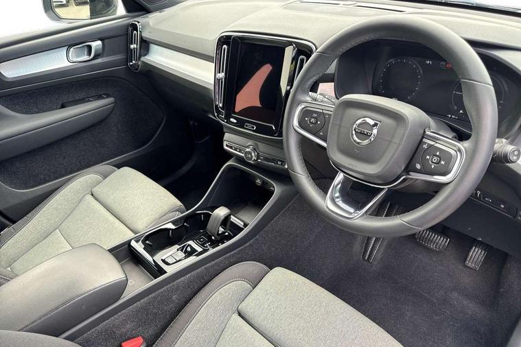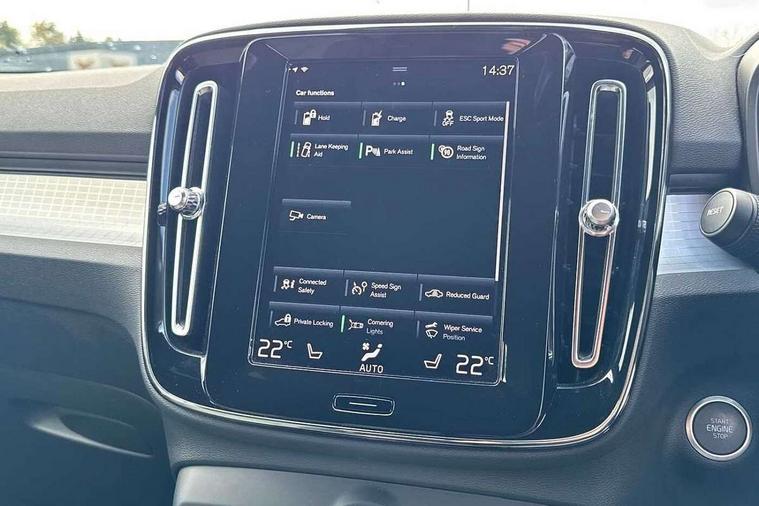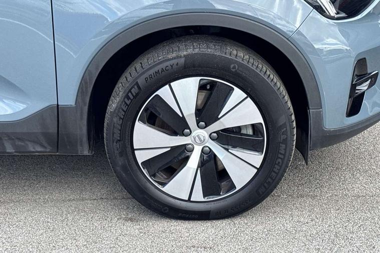 Climate pack without heated front seats - XC40, Anti-theft alarm including immobiliser/volume sensor + level sensor, Care key with user defined top speed, Key integrated remote control central locking + fuel flap with deadlocking system and auto open/close power windows, Keyless drive includes keyless entry and keyless start, Locking wheel nuts, Private locking for tailgate, DAB Digital radio, Low speed exterior sound speaker, Sensus connect with high performance sound, 8 speakers/250W, front USB and 2 rear type C USB, Steering wheel mounted remote controls, 3x3 point rear seatbelts, City safety includes pedestrian, cyclist and large animal detection and front collision warning with full auto brake, Drivers knee airbag, Dual stage driver/passenger airbags, Electronic parking brake with auto hold, First aid kit, Front and outer rear seatbelt reminder and pretensioners, Front seats SIPS airbags, Hill descent control, Hill start assist, Inflatable curtain, Passenger airbag cut-off device, Power child locks on rear doors, Road sign information display, Run off Road Mitigation, Run off Road Protection, SIPS (Side Impact Protection System), Slippery road and hazard light alert, Stability and Traction Control with Spin control, Engine Drag Control and Corner Traction Control, Tyre pressure monitoring system, Vehicle deceleration control with Anti-lock Brake System, Electronic Brake Distribution and Emergency Brake Assist, Warning triangle, WHIPS whiplash protection system - front, Adaptive brake lights with high level LED brake lights, Auto dimming feature for exterior door mirrors, Auto dimming interior mirror, Automatic headlamp levelling, Automatic LED Headlights + Active high beam incorporating daytime running lights, Front and rear electric windows, Front recharge aluminium tread plates, High gloss black front and rear skid plate, High gloss black mesh front grille with high gloss black surround, High gloss black window trim, Home safe and approach lighting, Integrated roof rails in high gloss black, LED front fog lights, Puddle lights, Rain sensor with automatic windscreen wiper activation, Rear side wing doors, Rear wiper, Roof antenna, Roof spoiler, Visible VIN plate, 12V socket in front tunnel console and cargo compartment, 2 zone electronic climate control with clear zone air quality system and pollen filter, 3 seat bench in 2nd row, 3 Spoke tailored steering wheel with chrome trim, 60/40 versatile split folding rear seat, A-pillar parking ticket holder, C-pillar Recharge logo, Centre console cupholders and storage, Floor mats, Front door pocket, front cupholder, ambient front door, rear reading, rear courtesy, instrument panel and tailgate lighting, Front footwell illumination, Front headrests, Front reading light and theatre lighting, Front seat cushion extensions, Front tunnel pocket, Glovebox bag hook, Heated front seats, Height adjustable passenger seat, Height/reach adjustable steering column, High gloss centre tunnel deco, Illuminated glovebox, Illuminated luggage compartment, Illuminated vanity mirrors, Isofix attachments on rear seats, Load protection net, Multi directional lumbar support, Power driver seat with memory + exterior mirrors memory, Rear armrest / integral cup holders / storage tray, Rear headrests, Single front passenger seat, Underfloor cargo storage, 12.3" Active TFT crystal driver's instrument display, 360 degree surround view parking camera, 9" centre console portrait touch screen, Adjustable steering wheel force, Bluetooth hands free telephone kit, Cruise control, Drive mode selector, E-call, Front park assist, Hands free power tailgate, Lane keep assist with driver alert control, Oncoming Lane Mitigation, Rear park assist, Sensus navigation with European mapping and traffic information, Speed limiter, Speed sensitive steering, Voice activated control for key functions, Wireless Smartphone Integration includes Apple CarPlay and Android auto, Wireless/Inductive Mobile Phone Charging, 3.7 kW monophase on board charger, 7m 10amp charge cable with 3 pin plug and 7m 1 phase 16amp type 2/mode 3 charge cable, Dynamic chassis, Electric front axle drive, Recharging port located in nearside front wing,