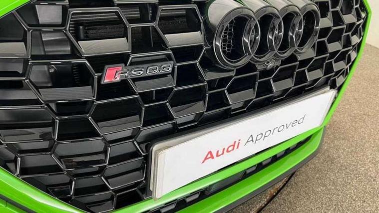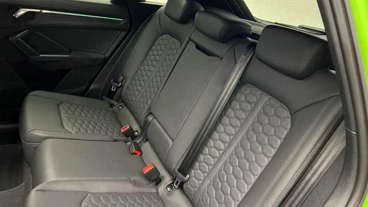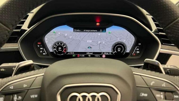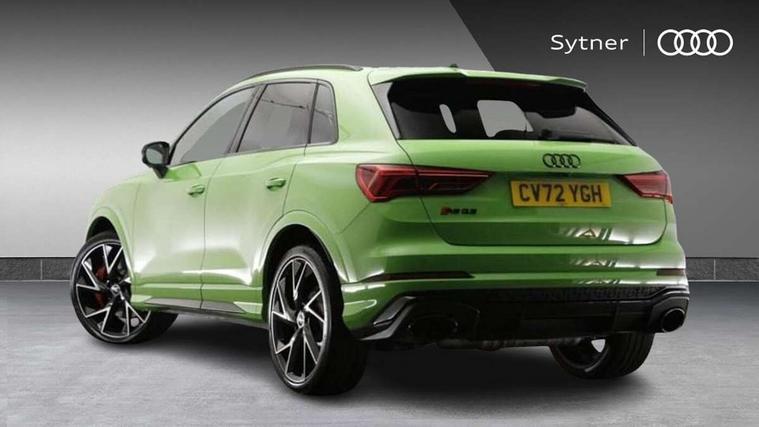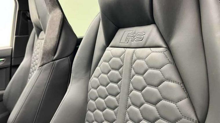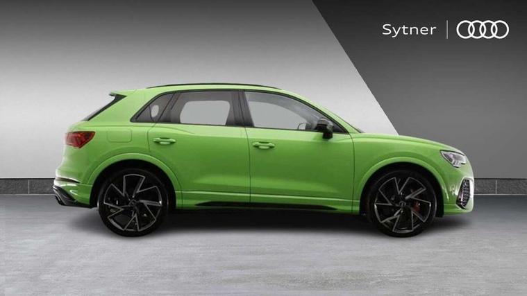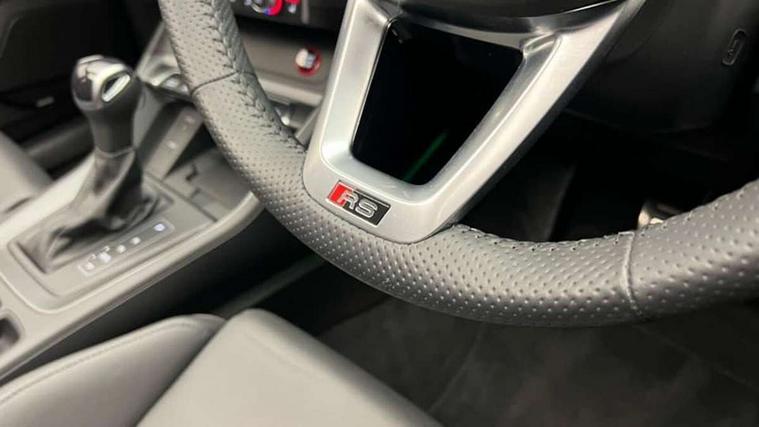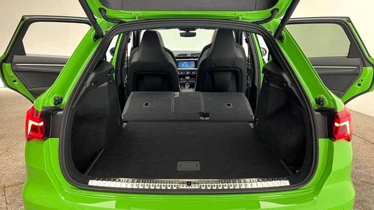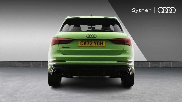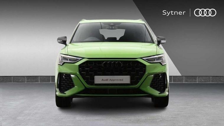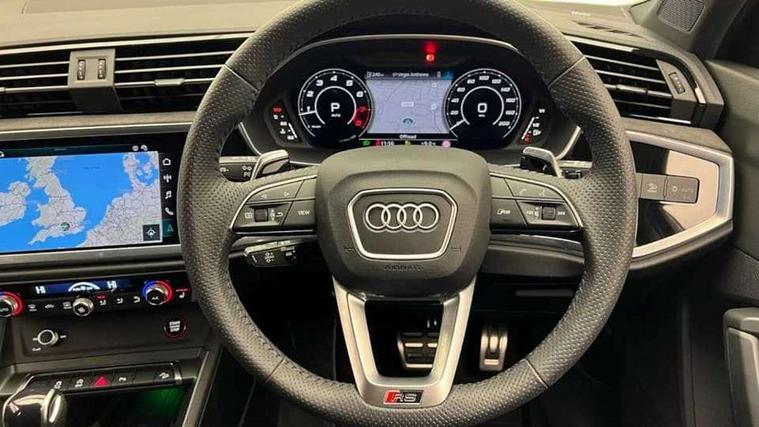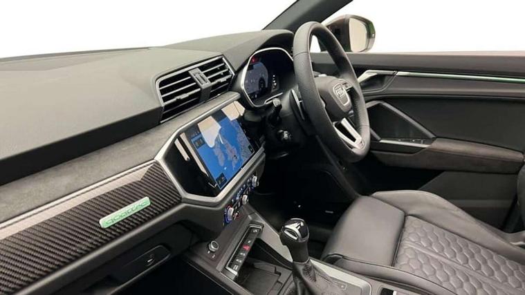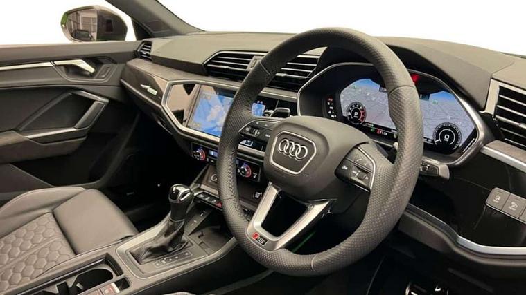 Aluminium look interior elements, Carbon twill inlays, Detail dashboard around MMI touch colour display in glass look, black with surround in aluminium look, Black styling pack - RS Q3, Driver assistance pack with side assist - RS Q3, Multi-coloured extended ambient lighting pack - RS Q3, Non smoking pack - RS Q3, Tyre repair kit, Advanced key, Anti theft alarm, Anti theft wheel bolts, Immobiliser, 2 USB-C ports with charge and data functions, Bang + Olufsen 3D sound system, DAB digital radio module, 3x3 point rear seatbelts, 6 airbags - Driver, front passenger, curtain and side windows, Audi pre-sense front with pedestrain and cyclist recognition, Electrically operated child locks on rear doors, Electromechanical parking brake, Electronic stabilisation control including ABS, ASR and EDL, Front seatbelt reminder, Hill descent control, Hill hold assist, Pre sense basic, RS brake system, Seatbelt monitoring, Tyre pressure warning, Warning triangle and first aid kit, Acoustic windscreen, Audi Beam uses LEDs to project the Audi Sport logo, Auto dimming door mirrors, Auto dimming frameless rear view mirror, Black roof rails, Body colour rear spoiler, Carbon door mirror housings, Electrically folding, adjustable and heated door mirrors with integrated LED side indicators and kerb view function for passenger side, Flared wheel arches, Flat slits on single frame grille, Headlight washers, High gloss black finish B and C pillars, Honeycomb radiator grille in gloss black, Illuminated door sill trims with RS logo, LED headlights with LED daytime running lights, LED rear lights, LED third brake light, Panoramic glass sunroof, Privacy glass dark tinted rear and rear-side windows (from B-pillar backwards), Rain and light sensors, Rear side wing doors, Rear wiper, RS specific bumpers with large front air inlets in black, RS Sport exhaust system, dual branch with exhaust flap control and gloss black oval tailpipe trims, Tinted rear windows, Variable front intermittent wipers, 3 seat bench in 2nd row, 3 zone electronic climate control, 4 way electric lumbar support for driver and front passenger, Adjustable rear seat bench/backrest with centre armrest and cupholder, Black Alcantara elements - dashboard and the armrests in the front and rear doors, Black cloth headlining, Electrically adjustable front seats, Fine Nappa leather upholstery with front sports seats + honeycomb stitching and RS embossed logo, Front and rear floor mats, Front and rear head restraints, Front centre armrest, Heated front seats, ISOFIX child seat mounting for front passenger with airbag deactivation and outer rear seat including top tether attachment point for outer rear seats, Leather steering wheel (Round) in 3-spoke design with multifunction plus and shift paddles, Single front passenger seat, Stainless steel luggage compartment sill finisher, Stainless steel pedals, Tool kit, 360 degree parking camera, Audi drive select with new RS modes, Audi lane departure warning, Audi parking system plus with front and rear sensors, Audi phone box with wireless charging, Audi smartphone interface includes wireless Apple carplay/Android Auto, Audi virtual cockpit plus - 12.3 inch display, Bluetooth interface, Camera based traffic sign recognition, Emergency e-call, MMI Navigation Plus with high resolution 10.1 inch touchscreen colour display, Power operated tailgate, Progressive steering, Rear cross traffic assist, Start stop system with recuperation, Voice control system with natural language interaction, Quattro all wheel drive, RS sports suspension plus,