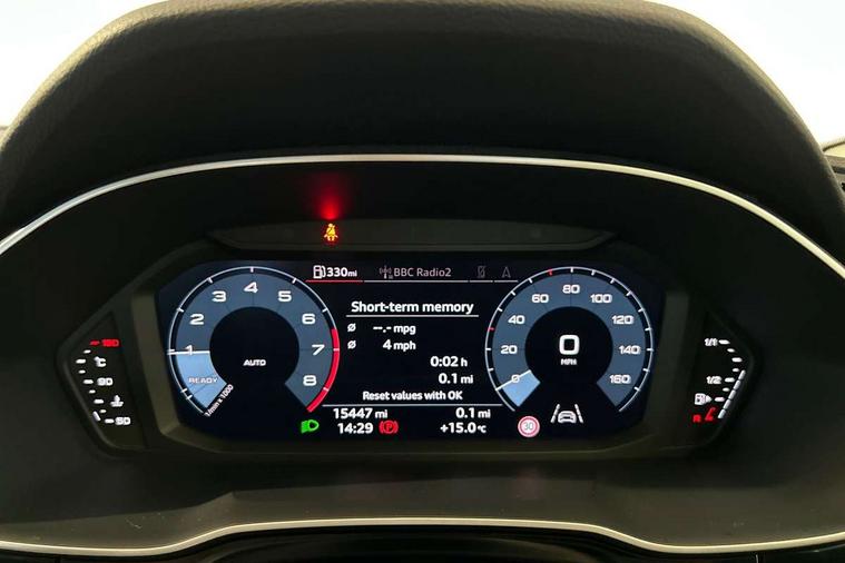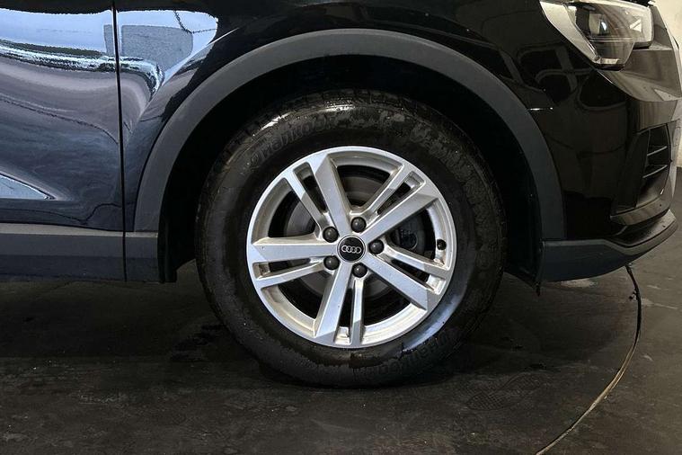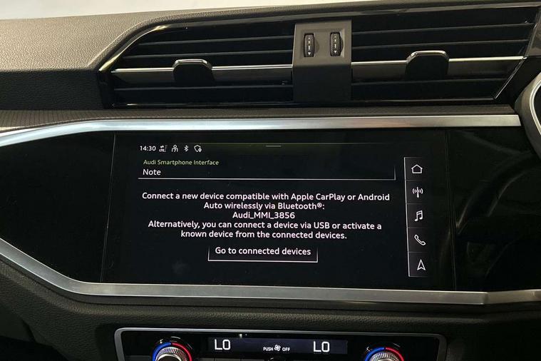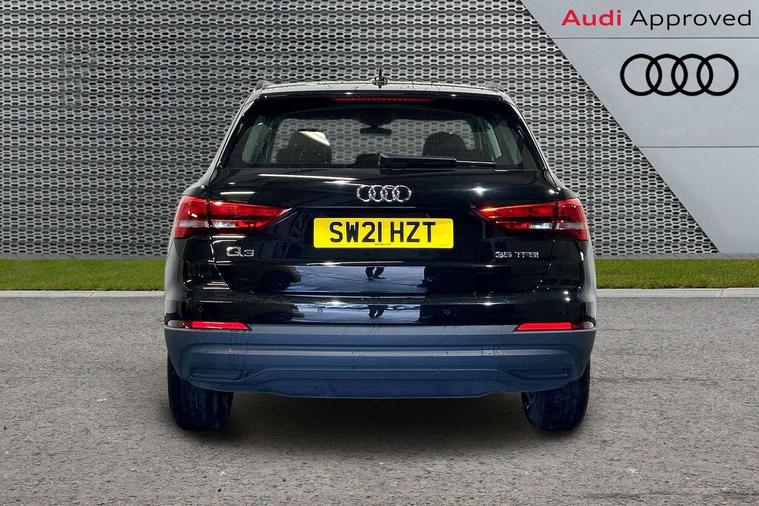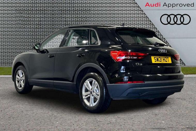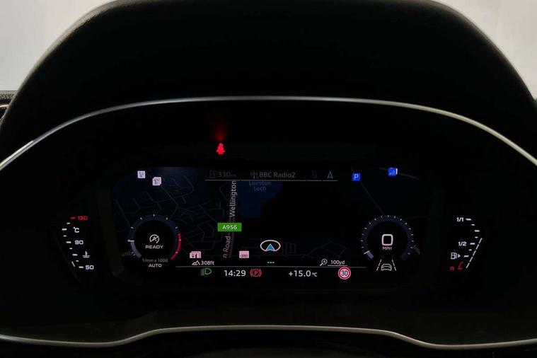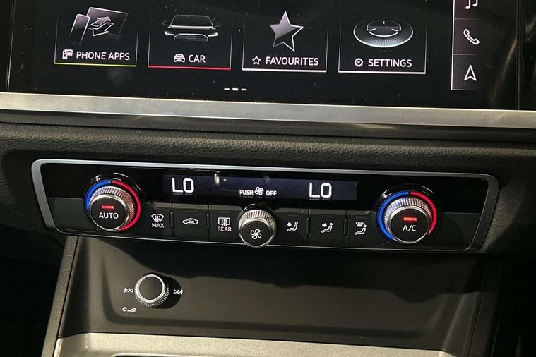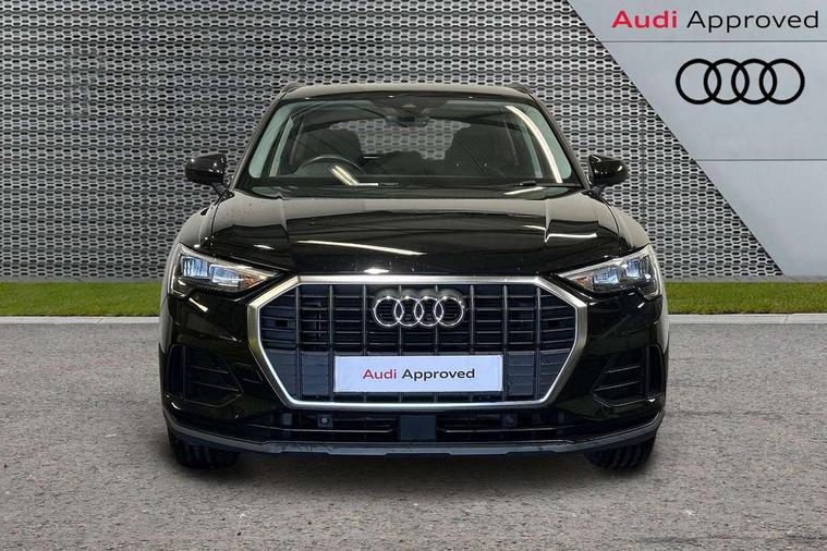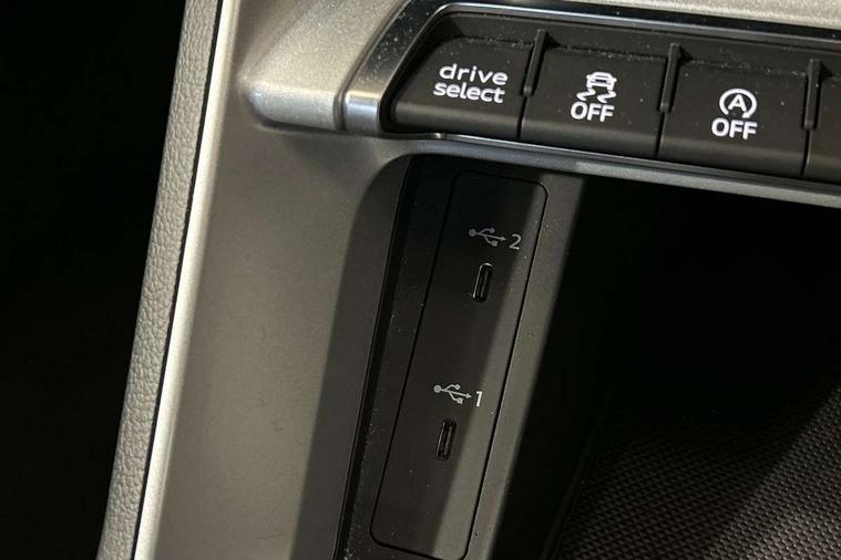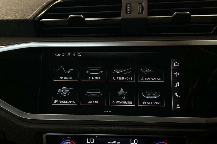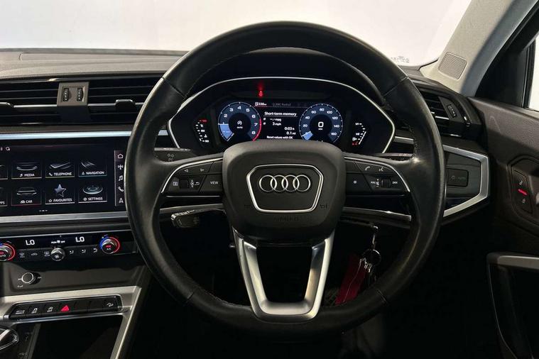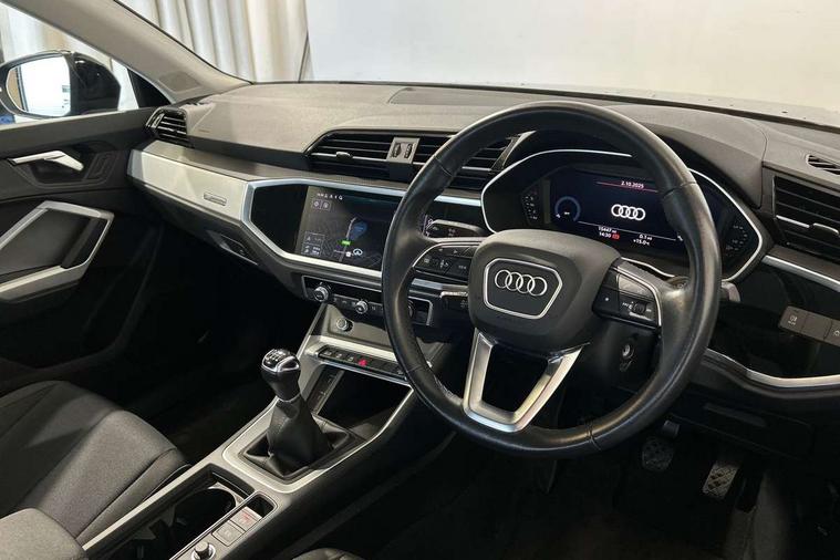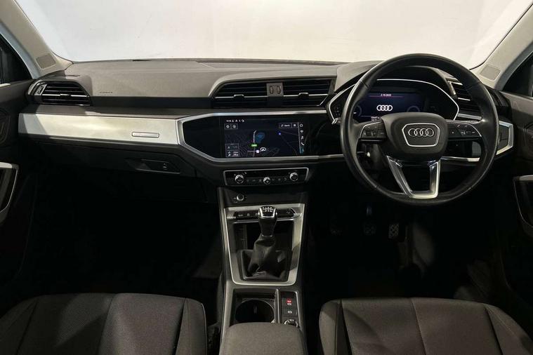 Detail dashboard around MMI touch colour display in glass look, black with surround in aluminium look, Micrometallic silver inlay, Non smoking pack - Q3, 17" 5 twin spoke design alloy wheels, Anti theft alarm, Anti theft wheel bolts, Remote central locking, 2 USB-C ports with charge and data functions, 6 passive loudspeakers, DAB digital radio module, 3x3 point rear seatbelts, 6 airbags - Driver, front passenger, curtain and side windows, Audi pre-sense front with pedestrain and cyclist recognition, Electrically operated child locks on rear doors, Electromechanical parking brake, Electronic stabilisation control including ABS, ASR and EDL, Hill descent control, Hill hold assist, Pre sense basic, Seatbelt monitoring, Tyre pressure warning, Warning triangle and first aid kit, Acoustic windscreen, Auto dimming frameless rear view mirror, Black roof rails, Body colour door mirrors, Diffuser in grained anthracite, Electrically folding, adjustable and heated door mirrors with integrated LED side indicators and kerb view function for passenger side, Exterior bumper with wheel arch trims and side sill trims in grained black matt, Front and rear electric windows, Grained radiator protective grille, Halogen rear lights, LED headlights with LED daytime running lights, Rain and light sensors, 12V socket in rear centre console, 3 spoke multi-function leather steering wheel, 40:20:40 folding with manual adjustment for 60:40 forwards/backwards position and backrest angle, Dual zone electronic climate control, Front and rear floor mats, Front and rear headrests, Front and rear roof module including reading lights, Front centre armrest, Glove compartment lighting, Height and reach adjustable steering wheel, ISOFIX child seat mounting for front passenger with airbag deactivation and outer rear seat including top tether attachment point for outer rear seats, Luggage compartment light, Lunar silver cloth headlining, Manual front seats with height adjustment, Stainless steel luggage compartment sill finisher, Audi connect safety and service (e-call), Audi drive select, Audi lane departure warning, Audi smartphone interface includes wireless Apple carplay/Android Auto, Audi Virtual Cockpit - 10.25" display, Bluetooth interface, Camera based traffic sign recognition, Cruise control + speed limiter, MMI Navigation Plus with high resolution 10.1 inch touchscreen colour display, Power operated tailgate, Progressive steering, Rear parking sensors, Service interval indicator, Start stop system with recuperation, Voice control system with natural language interaction, Standard suspension,