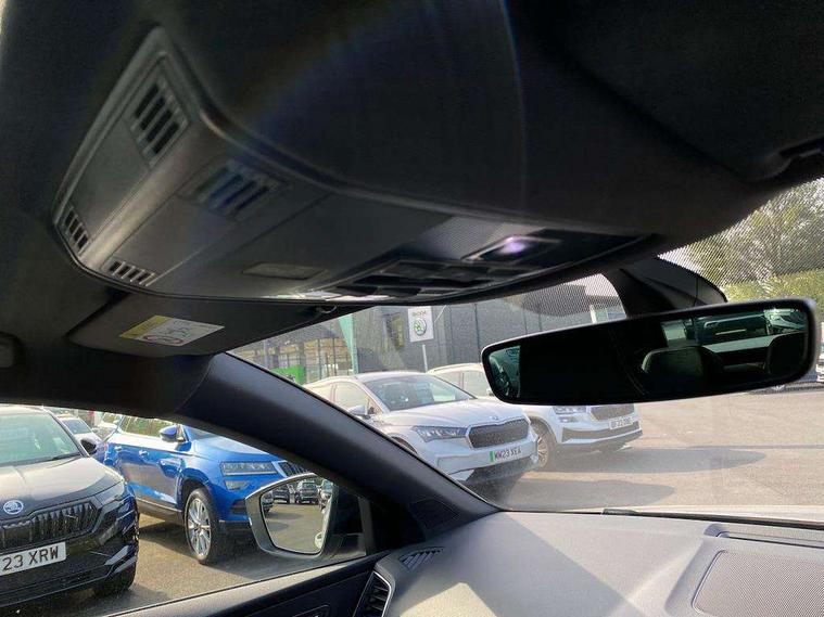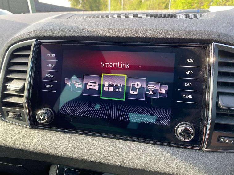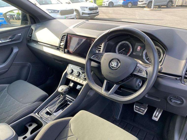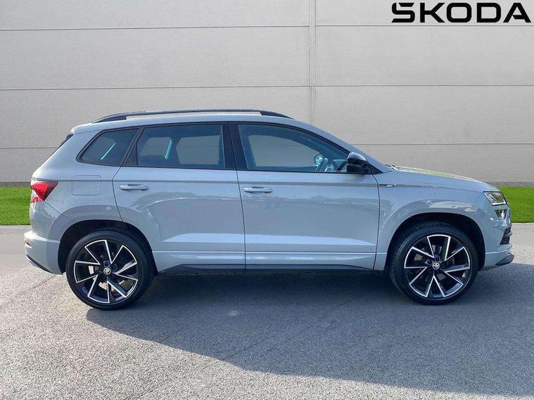 Chrome framed air vents, LED Interior lighting pack with Skoda welcome logo - Karoq, 19" Vega anthracite alloy wheels, Anti-theft wheel bolts protection, Storage on wheel cover, Alarm with interior monitoring, back up horn and tilt sensor with safe function, Electronic engine immobiliser, Keyless entry and keyless start with safe system, Remote central locking with 2 remote folding keys, DAB radio with Bluetooth, SD card slot, USB connection, Airbags - Front side, head, knee and curtain, Automatic door unlocking in case of crash, Automatic fuel cut off in case of crash, Driver airbag, Electronic parking brake with auto hold function, Emergency rear braking signal, ESC including ABS, MSR, ASR, EDS, HBA, DSR, RBS, MKB and traction control, Front assist radar scanning of the space in front of the car with automatic braking, Hill hold control, Passenger airbag with switch-off function, Pedestrian monitor, Seatbelt reminder signalisation and pretensioner for all seats, Three point seatbelts rear, Two tone horn, Tyre pressure display, Tyre pressure monitor, Acoustic glass, Aero front windscreen wipers with intermittent function, Automatic headlight control system, Black roof rails and door mirrors with radiator grille, Body colour door handles, Chrome outside aluminium bar around the window, Electrically adjustable heated folding and auto dimming door mirrors with boarding spots, Front door steps with SportLine logo, Full LED headlights + adaptive front light system + LED daytime running lights and front cornering fog lights, Headlight washers, Heated rear windscreen, LED rear lights with high functionality, Light assistant (coming/leaving home/tunnel light), Panoramic sliding sunroof, Privacy glass, Protective door side sills in body colour, Rear diffuser, Safety reflectors on front doors, Sportline badge on front fender, Sportline decorative inserts with badging, Sports front and rear bumpers, Third brake light, 1.5 litre bottle holders in driver and front passenger door panels, 12V socket in boot, 12v socket in front centre armrest with storage compartment and rear air vents, 2 Folding hooks and nets in boot, 2 Front readings lights for driver and passenger, 3 rear height adjustable headrests, 3 spoke sports leather multi-function steering wheel with silver stitching, 4 foldable roof handles with rear coat hooks, 4 lashing points on luggage floor, Aluminium pedals, Backrest release, Black roof headlining, Cargo elements in boot, Chrome inner door handles, Driver and passenger seats height adjust, Dual zone climate control, Fabric sports seats with thermoflux and silver stitching, Front seat and rear pockets, Height adjustable front three point seats belts with tensioners, Height/reach adjust steering wheel, Ice scraper, Illuminated and cooled glovebox, Illuminated luggage compartment, Isofix child seat preparation outer rear, Manual lumbar support for front seats, Net programme in boot, Pen holder, Pollen filter, Rear boot cover, Rear reading lights, Rear seats fixed folding and divided 60:40, Removable LED torch in the boot, Retractable parcel shelf attachable to tailgate, Safety vest holder, Storage box in upper central dashboard closed, Storage compartment below the passenger seat, Storage net on centre console passenger side, Sunvisors with illuminated vanity mirrors, Textile floor mats, Umbrella under passenger seat, Welcome animation with sportline logo, Driver alert system, Driver fatigue sensor, Driver profile selection, Electro-mechanical PAS, Front and rear parking sensors, Multifunction colour trip computer, Outside temperature gauge, Personalisation of drive mode selection with off road includes 3 keys, Rear view camera, Service interval indicator, Start/stop system with regenerative braking,
