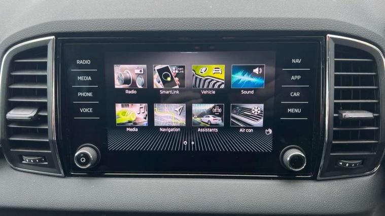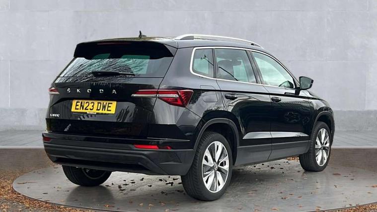8" Digital display, Care connect, Driver fatigue sensor, Emergency services call system, Outside temperature gauge, Service interval indicator, SmartLink wireless for Apple and wired for Android, Start/stop system with regenerative braking, USB C Port x 2 in front centre console, 8 speakers, DAB radio with Bluetooth, USB connection, Acoustic glass, Aero front windscreen wipers with intermittent function, Auto dimming rear view mirror with light and rain sensors, Black electric window control buttons, Body colour door mirrors and handles, Dynamic headlight range control with cornering light function, Electric front and rear windows with child proof lock, Heated rear windscreen, LED daytime running lights, LED rear lights with high functionality welcome effect and dynamic indicators, Light assistant (coming/leaving home/tunnel light), Plastic scuff plates, Privacy glass, Rear side wing doors, Rear spoiler, Rear window wiper with washer system and intermittent control, Safety reflectors on front doors, 1.5 litre bottle holders in driver and front passenger door panels, 12V socket in boot, 12v socket in front centre armrest with storage compartment and rear air vents, 2 spoke leather heated multifunction steering wheel with DSG paddles, 2 x Tablet holder, 3 rear height adjustable headrests, 3 seat bench in 2nd row, 4 foldable roof handles with rear coat hooks, Black floor carpet, Chrome inner door handles, Decorative door sills with KAROQ badging, Double sided boot floor, Foldable hooks in the boot, Front head restraints, Height adjustable front three point seats belts with tensioners, Height/reach adjust steering wheel, Ice scraper, Illuminated glovebox, Illuminated luggage compartment, Isofix child seat preparation for front passenger seat, Isofix child seat preparation outer rear, Manual lumbar support for front seats, Pen holder, Pollen filter, Rear boot cover, Rear reading lights, Rubbish bin door, Safety vest holder, Single front passenger seat, Storage box in upper central dashboard closed, Sunvisors with illuminated vanity mirrors, Textile floor mats, Ticket holder, Tool kit, VarioFlex seats with standard rear seat release, Boot pack - Karoq, Chrome roof rails + chrome pack - Karoq, Parking pack - Karoq, Automatic door unlocking in case of crash, Automatic fuel cut off in case of crash, Child locks on rear doors, Driver airbag, Electronic parking brake with auto hold function, Emergency rear braking signal, ESC including ABS, MSR, ASR, EDS, HBA, DSR, RBS, MKB and traction control, Front side airbags, Hill hold control, Knee airbags, Passenger airbag with switch-off function, Pedestrian monitor, Seatbelt reminder signalisation and pretensioner for all seats, Three point seatbelts rear, Two tone horn, Tyre pressure display, Tyre pressure monitor, Alarm with interior monitoring, back up horn and tilt sensor with safe function, Electronic engine immobiliser, Keyless entry and start/stop, Remote central locking with 2 remote folding keys, Chrome framed air vents, 18" Procyon silver alloy wheels with anthracite aero inserts, Anti-theft wheel bolts protection, Storage on wheel cover,