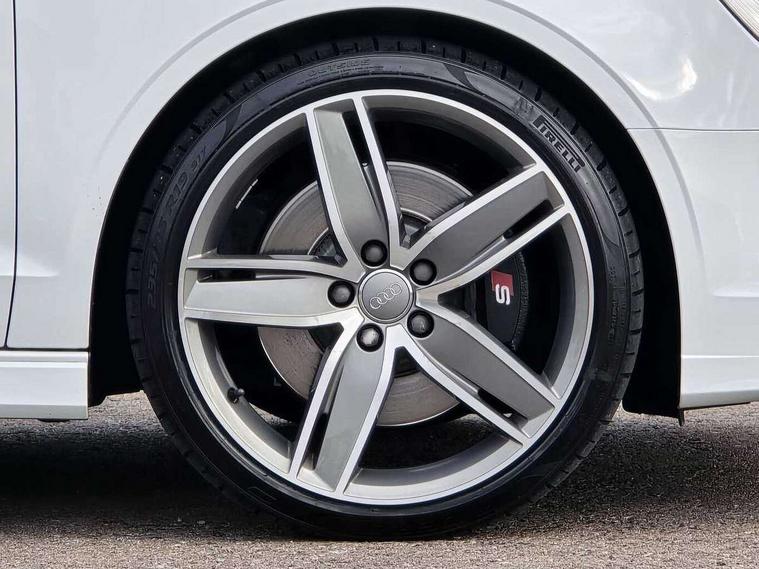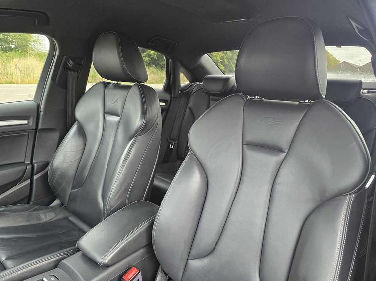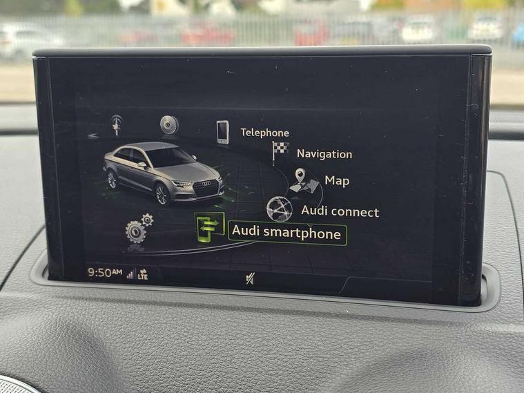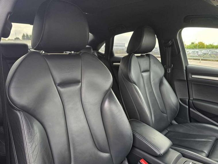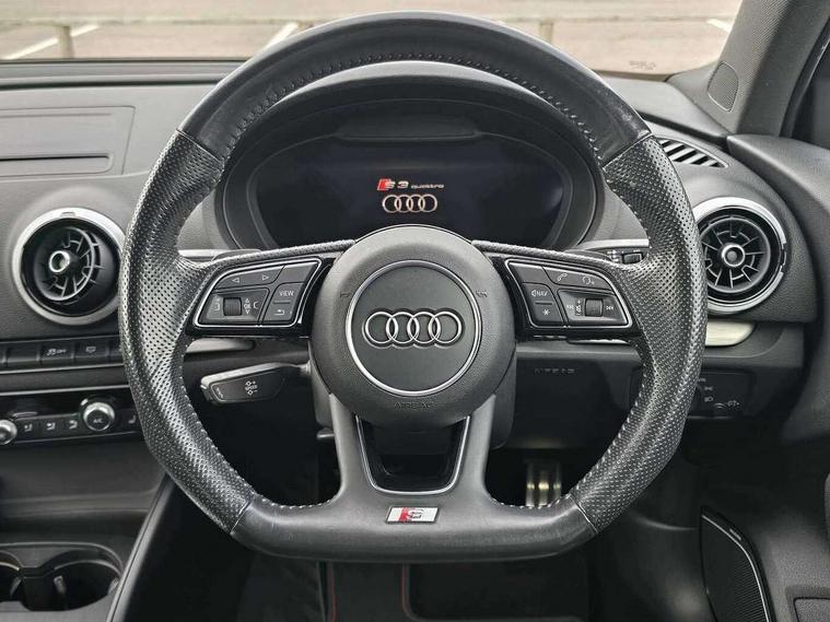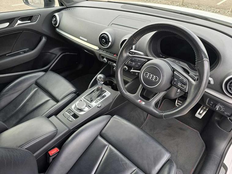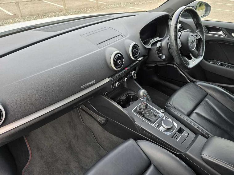 Audi connect, Audi smartphone interface, Bluetooth interface, Colour driver's information system display, Progressive power assisted steering, SD card based satellite navigation system, Service interval indicator, Voice control system, Audi magnetic ride, S sports suspension, 2 USB ports, Audi music interface, Aux-in socket, Bang + Olufsen advanced sound system, CD player, DAB Digital radio, MMI radio plus with 7" colour MMI screen and MMI controller, Automatic lights and wipers, Black door mirrors, Black rear diffuser, Body colour roof spoiler, Electric operated/heated door mirrors, Front and rear electric windows, Headlight washers, Heated rear window, Heated windscreen washer jets, LED daytime running lights, Privacy glass, Twin oval exhaust tailpipes with chrome finish, 3 adjustable rear headrests, 3 spoke flat bottom multi-function leather steering wheel including paddle shift, 4 lashing points to secure luggage, Adjustable front armrest, Cloth headlining, Driver/passenger sunvisors, Dual zone electronic climate control, Front and rear interior lights with delay, Front/rear floor mats, Heated front seats, Height/depth adjustable steering column, Illuminated door sills, Illuminated glovebox, ISOFIX child seat preparation+airbag deactivation, Jack and tool kit, Stainless steel pedals, Storage compartment in centre console, Storage compartments in doors, Storage under driver's seat, Black styling pack - A3/S3, LED interior light pack - A3/RS3, Non smoking pack - A3, Storage and luggage pack - A3/RS3, 3 point seatbelts on all seats, ABS/EBD, ASR, Curtain airbags, Driver and passenger side airbags, Driver/Front Passenger airbags, Drivers knee airbag, EDL, Electromechanical parking brake, ESC - Electronic Stability Control + traction control, Front passenger airbag deactivation, Seatbelt warning, Tyre pressure warning, Warning triangle and first aid kit, Anti theft alarm, Anti-theft wheel bolts, Immobiliser, Remote control central locking, Aluminium air vent surrounds, Aluminium trim elements,
