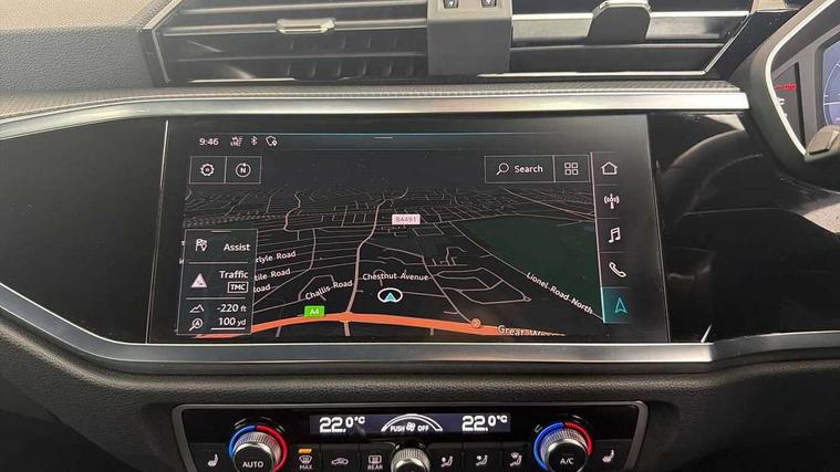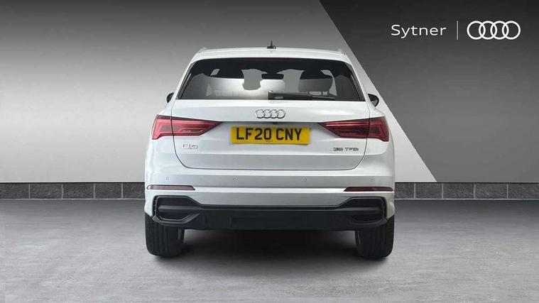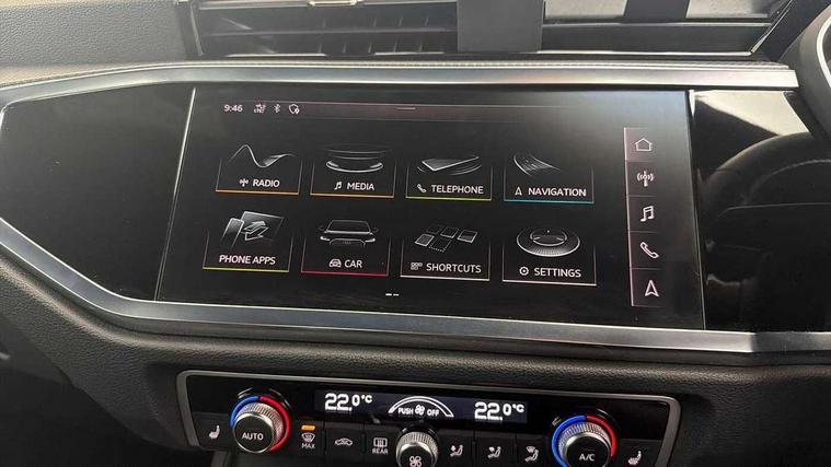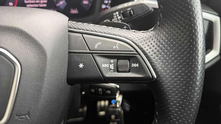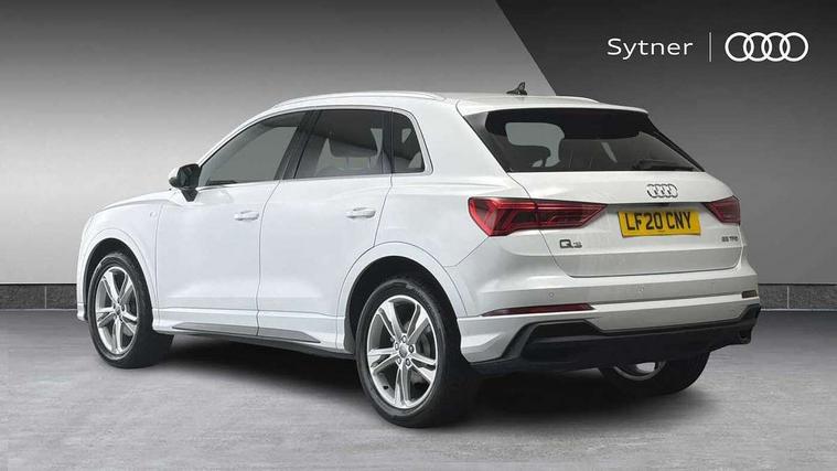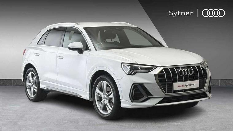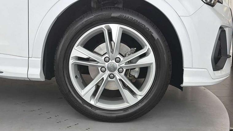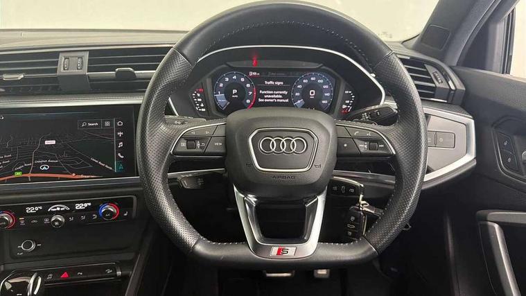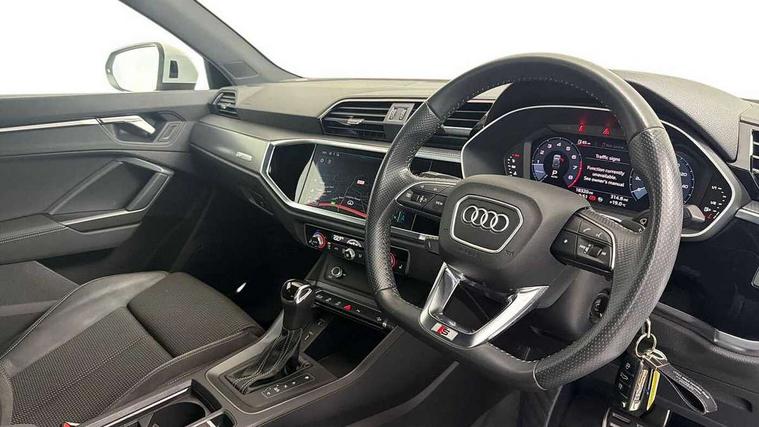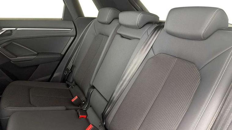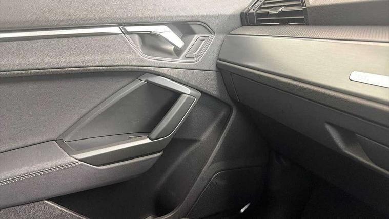 Apple CarPlay, Audi connect safety and service (e-call), Audi drive select, Audi lane departure warning, Audi side assist, Audi smartphone interface, Audi Virtual Cockpit - 10.25" display, Bluetooth interface, Camera based traffic sign recognition, MMI Navigation Plus with high resolution 10.1 inch touchscreen colour display, Power opening/closing tailgate, Progressive steering, Service interval indicator, Start stop system with recuperation, Voice control system with natural language interaction, 48V Mild hybrid technology, Sports suspension, 1 x USB type C and 1 USB type A charging points, 6 speakers, DAB digital radio module, Acoustic windscreen, Aluminium roof rails, Aluminium window trim, Auto dimming frameless rear view mirror, Body coloured bumpers, Electrically folding, adjustable and heated door mirrors with integrated LED side indicators and kerb view function for passenger side, Front and rear electric windows, Front fog lights, Front side air inlets in matt platinum grey, Front spoiler blade in matt platinum grey, Grille vertical bars in aluminium silver/Matt, High gloss black finish B and C pillars, LED headlights with LED daytime running lights and dynamic rear indicator, LED rear lights, Privacy glass, Rain and light sensors, Rear diffuser strip in matt titanium black, S Line badge on wings, S Line front and rear bumpers, Side skirt insert in matt Platinium grey, Silver chrome grille surround, Titanium black radiator grille, 12V socket in rear centre console, 40:20:40 split folding rear bench seat, 60:40 forwards/backwards position and backrest angle, Adjustable rear seat bench/backrest with centre armrest and cupholder, Aluminium door sill trims, Black cloth headlining, Dual zone electronic climate control, Front and rear black floor mats with contrast stitching in rock grey, Front and rear headrests, Front and rear roof module including reading lights, Front centre armrest with storage compartment and angle adjustment, Glove compartment lighting, Height and reach adjustable steering wheel, Illuminated door sill trims with S logo, ISOFIX child seat mounting and Top Tether with front passenger airbag deactivation, Luggage compartment light, Manual front seats with height adjustment, Perforated leather gearknob, Stainless steel luggage compartment sill finisher, Stainless steel pedals, Tool kit, Non smoking pack - Q3, 3x3 point rear seatbelts, 6 airbags - Driver, front passenger, curtain and side windows, Audi pre-sense front with pedestrain and cyclist recognition, Electrically operated child locks on rear doors, Electromechanical parking brake, Electronic stabilisation control including ABS, ASR and EDL, Hill descent control, Hill hold assist, Pre sense basic, Seatbelt monitoring, Tyre pressure warning, Warning triangle and first aid kit, Anti theft alarm, Anti theft wheel bolts, Remote central locking, Dark matt brushed aluminium inlay, Leatherette door armrest, MMI touch colour display in gloss black with aluminium surround, Tyre repair kit,