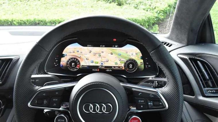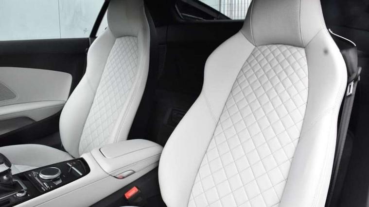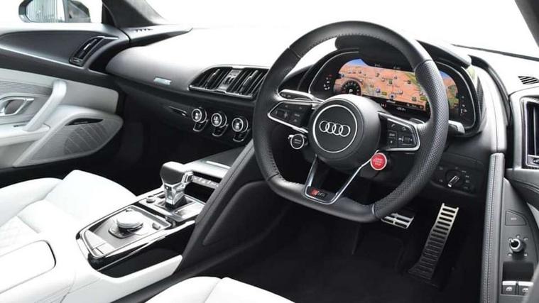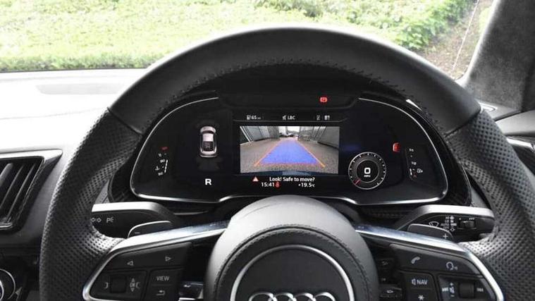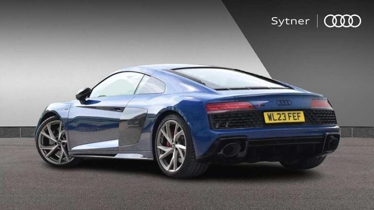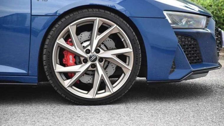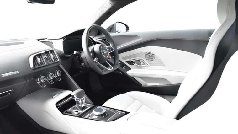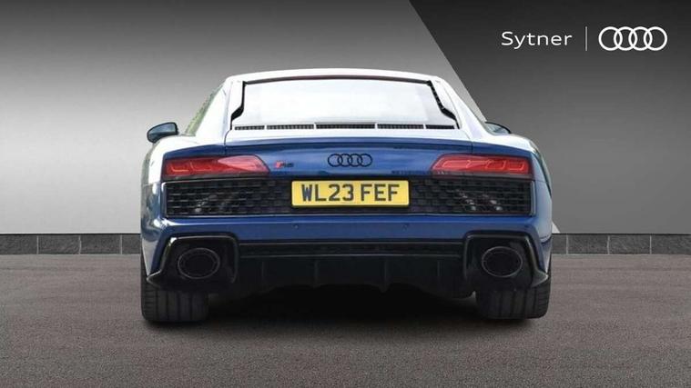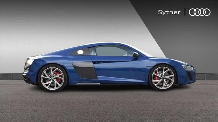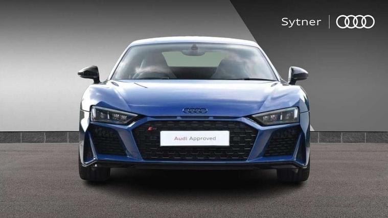 Audi connect, Audi drive select, Audi parking system plus with front and rear sensors, Audi phone box with wireless charging, Audi smartphone interface, Audi virtual cockpit, Bluetooth interface, Cruise control with speed above 18mph, Emergency call service, MMI navigation plus with MMI touch, PAS, Reversing camera, Service interval indicator, Start/Stop system with energy recuperation, Voice control system, Audi cylinder on demand, Rear wheel drive with passive differential lock on rear axle, RWD specific sport suspension, S tronic transmission with hill hold assist, Audi music interface with 2 USB ports with charge and data functions, Bang and Olufsen Sound System with loudspeakers in the head restraints, DAB Digital radio, 3rd brake light, Audi beam, Audi space frame, Auto dimming rear view mirror and frameless with light and rain sensor, Automatically extendable rear spoiler, Black mirrors, Electric front windows, Electrically adjustable, heated, folding and automatically dimming door mirrors with integrated LED indicator, Gloss black oval tailpipe trim, Gloss black radiator grille with R8 emblem, Heated rear window, High beam assist, LED headlights with dipped beam, daytime running lights, indicator and static turning light in LED technology, LED rear lights with dynamic rear indicators, Light and rain sensor, Rear boot, Sideblades in gloss carbon, Variable front intermittent wipers, 3 spoke flat bottomed sport leather steering wheel and multifunction plus with 2 operating satellites, Deluxe automatic climate control air conditioning, Illuminated door sills with aluminium insert, Seat heating, Single front passenger seat, Stainless steel pedals and footrest, Tool kit, Black Styling pack - R8 Coupe, Gloss black styling pack - R8, Interior light pack - R8, ABS, Driver/front passenger airbag, EDL traction control, ESP, Front side airbags, Red brake calipers, Seatbelt monitoring, Side curtain airbags, Tyre pressure warning light, Warning triangle and first aid kit, Wave brake discs, Advanced key with safelock, Anti theft alarm and immobiliser, Locking wheel bolts, Remote central locking, Alcantara headlining with diamond stitched pattern, Belt loops, top section of centre console, centre armrest, door pull handle and speaker trim on front pass. side in fine Nappa leather seat up. colour, Door armrests and map compartments in fine Nappa leather in seat upholstery colour, Loudspeaker on drivers side in artificial black leather, Piano black lower inlays, Steering wheel impact absorber trim, lower part of centre console, door rails, rear panel rail and side panel trims in black Fine Nappa Leather, Upper and lower section of dashboard, cowl, monoposto, knee pad on the drivers side, airbag cover in black Fine Nappa Leather, Upper inlays in gloss carbon, Tyre repair kit,