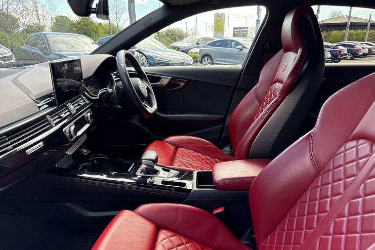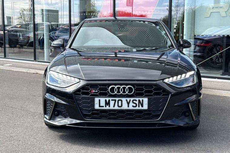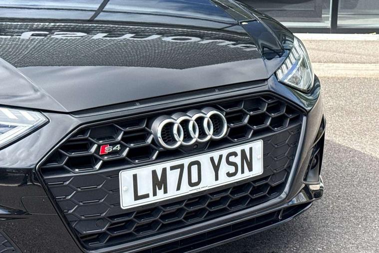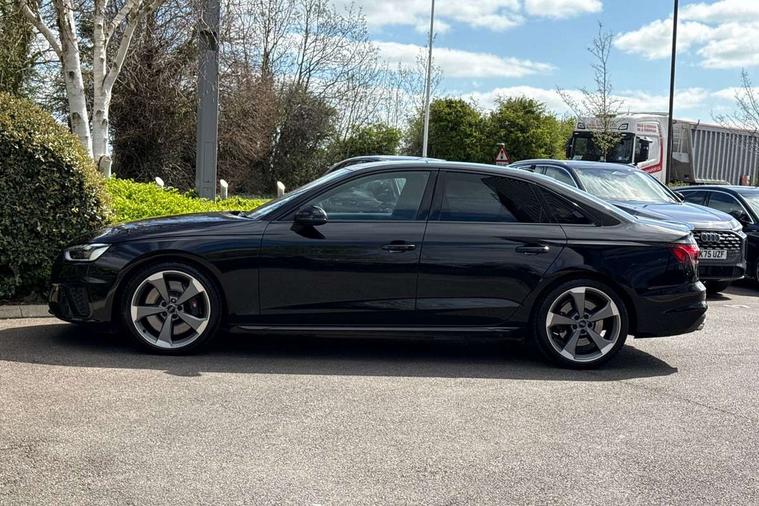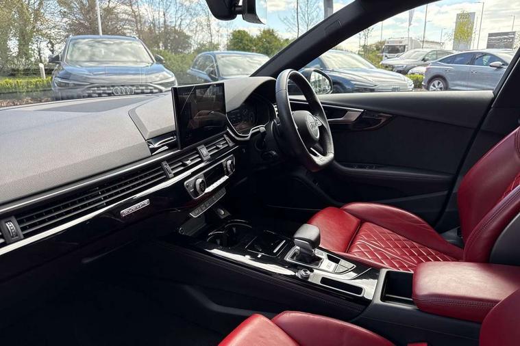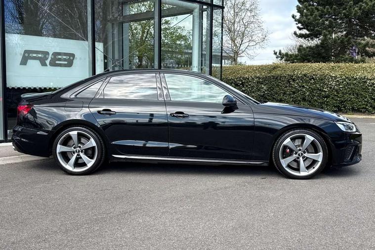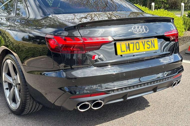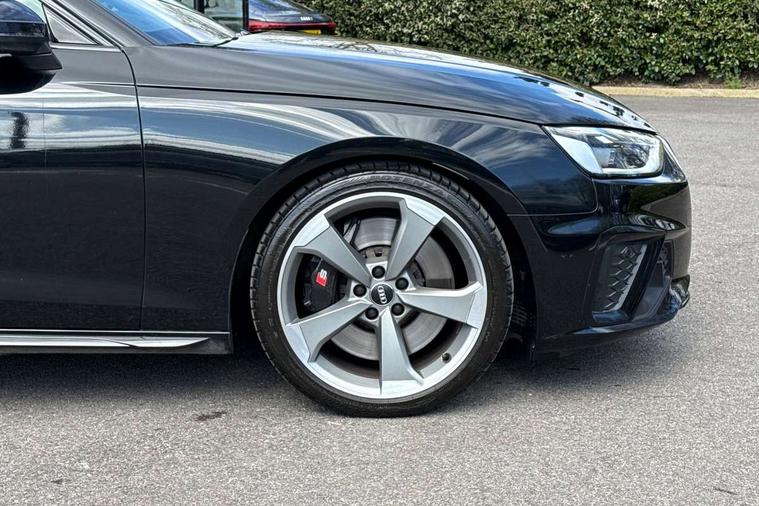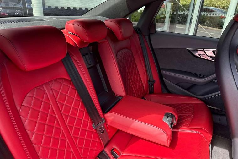Audi connect safety and service (e-call), Audi drive select, Audi parking system plus with front and rear sensors, Audi phone box with wireless charging, Audi smartphone interface, Audi virtual cockpit, Automatic start-stop system with coasting functionality and efficiency programme, Bluetooth interface, Electric boot lid release, Electromechanical power steering, MMI Navigation plus with MMI touch includes 10.1" high resolution colour MMI display, 3D map, Rear view camera, S instrument dials, Voice control system, 58 Litre fuel tank, S sports suspension, 2 USB charging ports, Audi sound system with 10 loudspeakers, DAB digital radio reception, Audi Beam uses LEDs to project the Audi logo, Auto dimming rear view mirror, Body colour door handles, Body colour front spoiler lip, Body colour side sill trim, Electrically folding auto dimming/adjustable/heated door mirrors with LED side indicators and kerb view function for passenger side, High beam assistant, LED headlights with LED rear lights + dynamic rear indicators + headlight adjustment and high beam, turning light + LED daytime running lights, New design rear diffuser, Rain and light sensors, S line front and rear bumpers with side skirts, S specific dual branch chrome tailpipes with twin oval pipes on left and right, S specific side air inlets in titan black with chrome inlays in unique S design, S Style rear spoiler, Windscreen with acoustic glazing, 40/20/40 split folding 3 rear seat bench in 3 parts with rear centre armrest, Black cloth headlining, Black leather gear lever knob, Contrast stitching on seats, steering wheel and gear lever gaiter, Deluxe 3 zone electronic climate control, Door sill trims with aluminium inlay, Fine nappa leather upholstery with S embossed logo + super sports seats, Front and rear head restraints, Front centre armrest, Gear lever with diamond S badge, Heated front seats, Illuminated door sill trims with S logo, ISOFIX child seat mounting and top tether, Key with S4 logo, Pneumatically adjustable lumbar support with massage function, Stainless steel pedals and foot rest, Tool kit, Extended leather pack - A4/S4, LED Interior light pack - A4/S4, Titanium black styling pack - A4 Saloon, 3 rear seatbelts, 6 airbags - Driver, front passenger, curtain and side windows, Electronic Stabilisation Control (ESC) including ABS, ASR and EDL, Front brake calipers painted in black with S4 logo, Hill hold assist, Multi collision brake assist, Pop-up bonnet for pedestrian protection, Pre sense city, S model enhanced braking system, Seatbelt monitoring, Warning triangle and first aid kit, Anti theft alarm, Anti theft wheel bolts, Keyless Go, 19" 5 arm rotor design alloy wheels titanium matt look, Tyre repair kit,