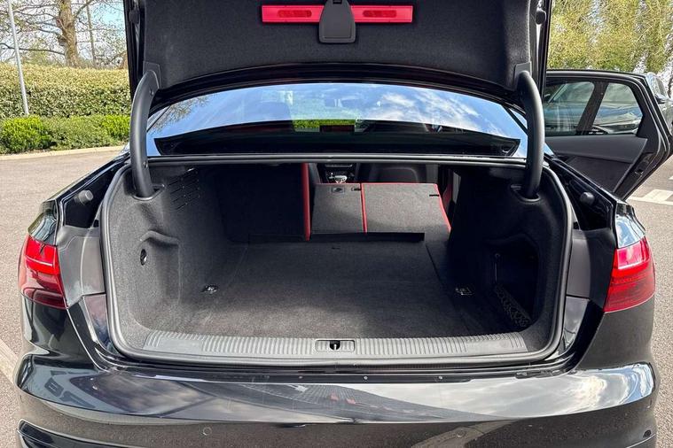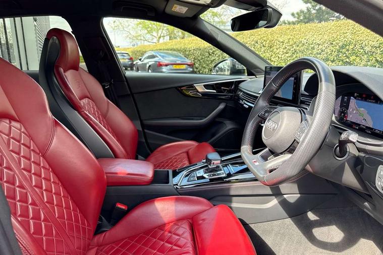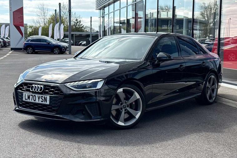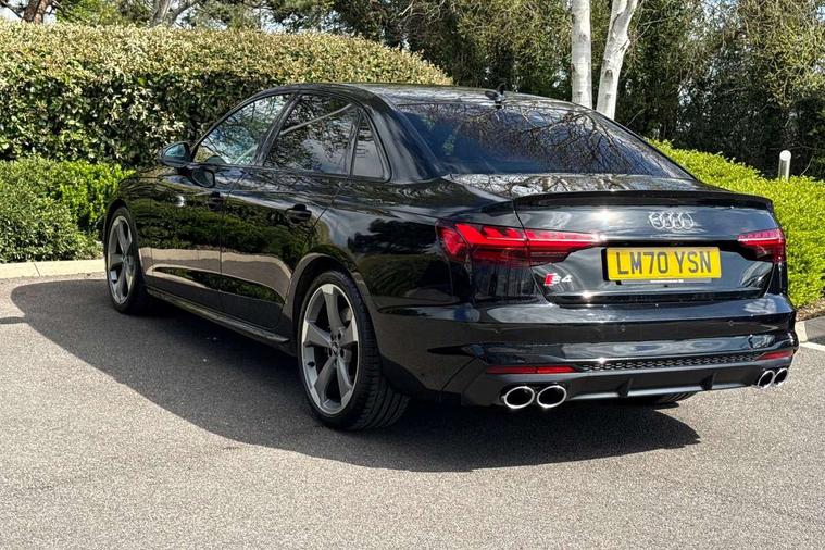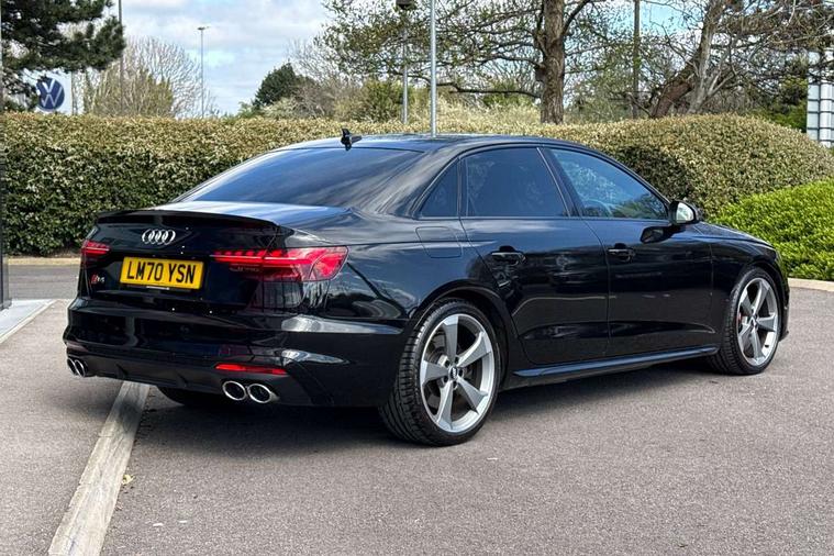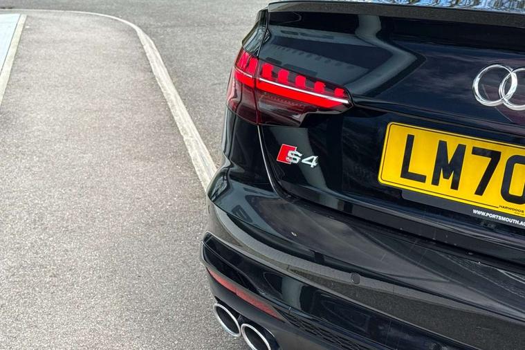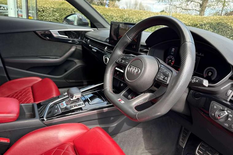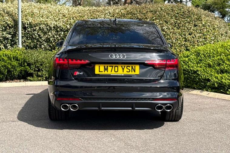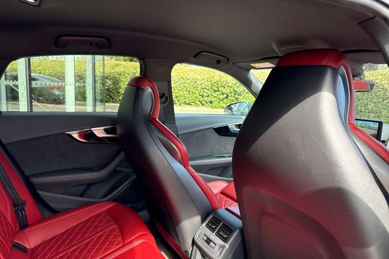 Audi connect safety and service (e-call), Audi drive select, Audi parking system plus with front and rear sensors, Audi phone box with wireless charging, Audi smartphone interface, Audi virtual cockpit, Automatic start-stop system with coasting functionality and efficiency programme, Bluetooth interface, Electric boot lid release, Electromechanical power steering, MMI Navigation plus with MMI touch includes 10.1" high resolution colour MMI display, 3D map, Rear view camera, S instrument dials, Voice control system, 58 Litre fuel tank, S sports suspension, 2 USB charging ports, Audi sound system with 10 loudspeakers, DAB digital radio reception, Audi Beam uses LEDs to project the Audi logo, Auto dimming rear view mirror, Body colour door handles, Body colour front spoiler lip, Body colour side sill trim, Electrically folding auto dimming/adjustable/heated door mirrors with LED side indicators and kerb view function for passenger side, High beam assistant, LED headlights with LED rear lights + dynamic rear indicators + headlight adjustment and high beam, turning light + LED daytime running lights, New design rear diffuser, Rain and light sensors, S line front and rear bumpers with side skirts, S specific dual branch chrome tailpipes with twin oval pipes on left and right, S specific side air inlets in titan black with chrome inlays in unique S design, S Style rear spoiler, Windscreen with acoustic glazing, 40/20/40 split folding 3 rear seat bench in 3 parts with rear centre armrest, Black cloth headlining, Black leather gear lever knob, Contrast stitching on seats, steering wheel and gear lever gaiter, Deluxe 3 zone electronic climate control, Door sill trims with aluminium inlay, Fine nappa leather upholstery with S embossed logo + super sports seats, Front and rear head restraints, Front centre armrest, Gear lever with diamond S badge, Heated front seats, Illuminated door sill trims with S logo, ISOFIX child seat mounting and top tether, Key with S4 logo, Pneumatically adjustable lumbar support with massage function, Stainless steel pedals and foot rest, Tool kit, Extended leather pack - A4/S4, LED Interior light pack - A4/S4, Titanium black styling pack - A4 Saloon, 3 rear seatbelts, 6 airbags - Driver, front passenger, curtain and side windows, Electronic Stabilisation Control (ESC) including ABS, ASR and EDL, Front brake calipers painted in black with S4 logo, Hill hold assist, Multi collision brake assist, Pop-up bonnet for pedestrian protection, Pre sense city, S model enhanced braking system, Seatbelt monitoring, Warning triangle and first aid kit, Anti theft alarm, Anti theft wheel bolts, Keyless Go, 19" 5 arm rotor design alloy wheels titanium matt look, Tyre repair kit,