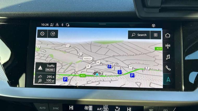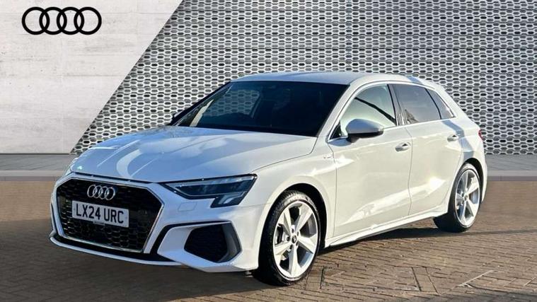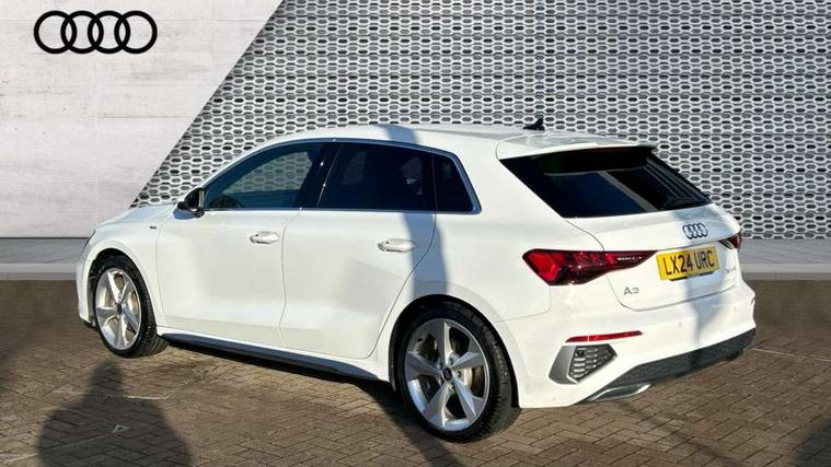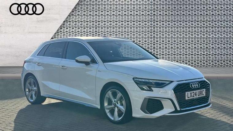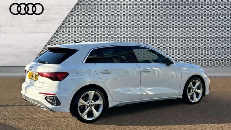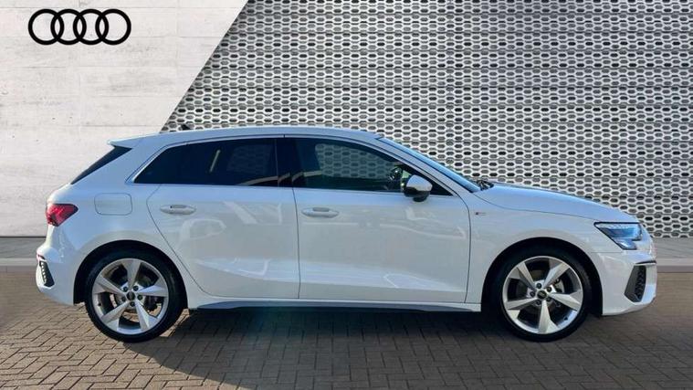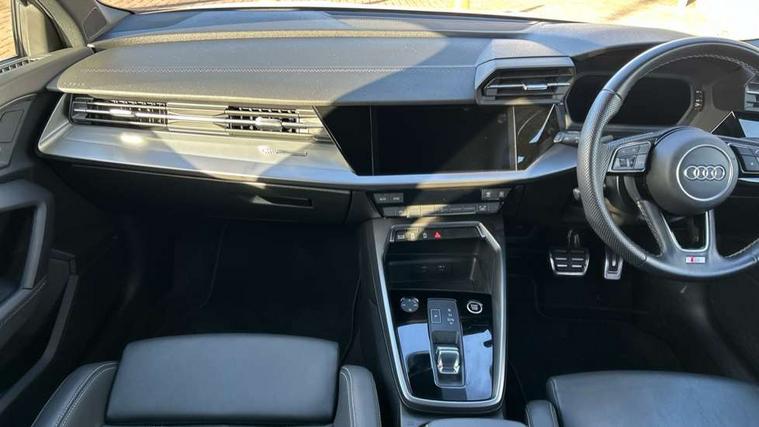 Audi drive select (Auto, Comfort, Dynamic, Efficiency and Individual), Audi smartphone interface, Audi Virtual Cockpit - 10.25" digital and colour instrument cluster, Automatic start/stop system with recuperation, Bluetooth interface, Camera based traffic sign recognition, Collision avoidance assistant, e-Call (emergency call), Electromechanical power speed sensitive steering, Lane departure warning system, MMI Navigation Plus with high resolution 10.1" colour touch screen display, Service indicator, Trip computer, Voice control system with natural language interaction, Sports suspension, 2xUSB-C connection with data and charging functions, 6 passive loudspeakers, DAB Digital radio, 3rd brake light, Acoustic glass windscreen, Aluminium window trim, Auto dimming frameless rear view mirror, Body colour exterior mirrors, Electrically adjustable/heated/folding/dimming door mirrors with kerb view includes integrated LED indications + kerb view function for passenger side, Front electric windows, Illuminated door sills with aluminium inserts at the front with S logo, LED daytime running lights, LED headlights with LED rear lights and dynamic rear indicators, Light and rain sensors, Privacy glass - dark tinted rear window, rear door and side windows, Rear electric windows, Rear side air outlets in grained matt black, Rear side wing doors, Rear wiper, S line bumpers, S roof spoiler, 12V socket and storage compartment in front centre console, 3 seat bench in 2nd row, 3 spoke leather multifunction steering wheel with paddle shift, 4 way electrically adjustable lumbar support for driver and front passenger, 60/40 split folding rear seat bench, Black cloth headlining, Dual zone electronic climate control, Front and rear centre armrest in artificial leather, Front and rear headrests, Front/rear floor mats, Height and reach adjustable steering wheel, Interior lighting - glove compartment light and right hand side, Luggage compartment floor covering, Manual boot compartment lid, Manually adjustable front seats, Seat side bolsters, Single front passenger seat, Stainless steel pedals and front footrest in black, Twin leather upholstery with front sports seats S embossed logo, Aluminium interior elements pack - A3 Sportback, LED interior lighting pack - A3 Sportback, S line styling pack - A3 Sportback, 3x3 point rear seat belts, Driver and front passenger airbag with passenger airbag deactivation, Electronic Stabilisation Control (ESC) including ABS, ASR and EDL, First aid kit with warning triangle and 2 safety vests, Front side airbags with head airbags and interaction airbag, Pre-sense front with pedestrian and cyclist detection, Seatbelt monitoring, Tyre pressure loss indicator, Anti theft alarm, Anti-theft wheel bolts, Electronically operated child locks, Immobiliser, Remote control central locking, Dark spectrum aluminium inlays, accent surfaces in the dashboard and centre console in platinum grey silk effect paint finish,