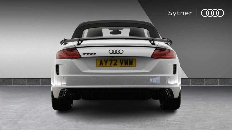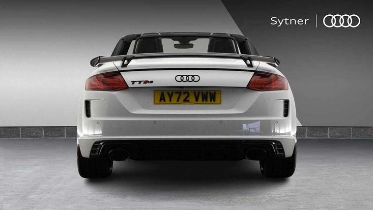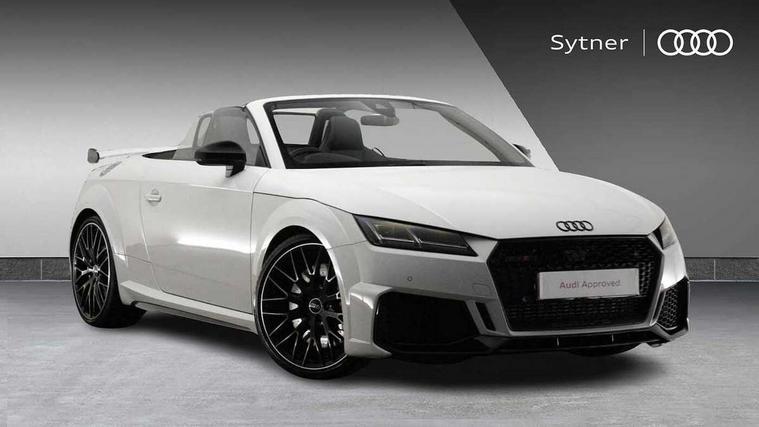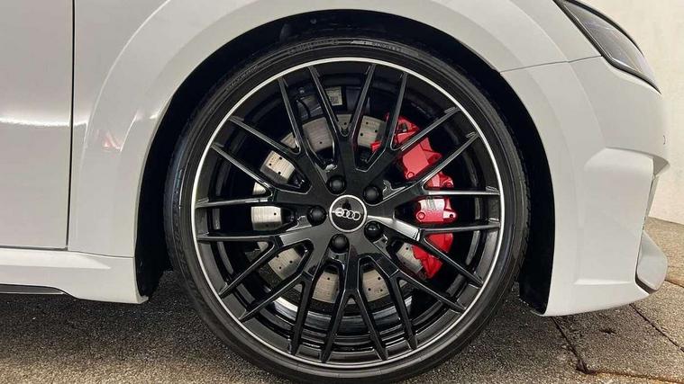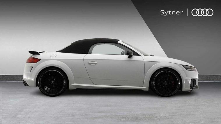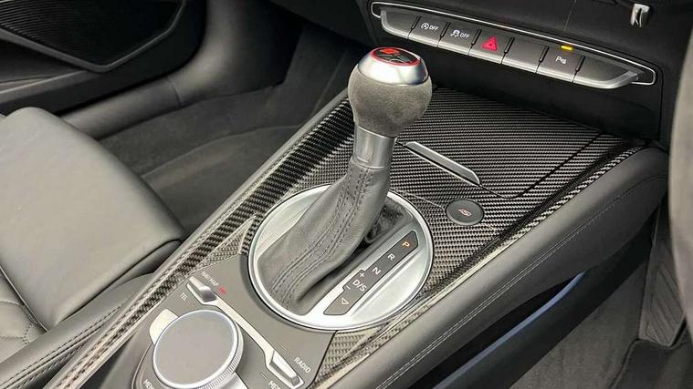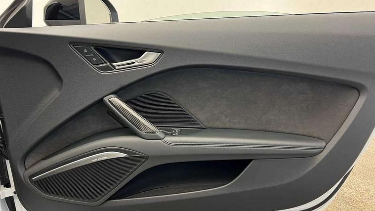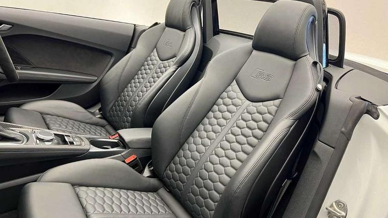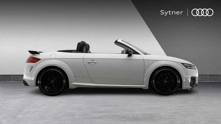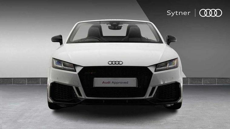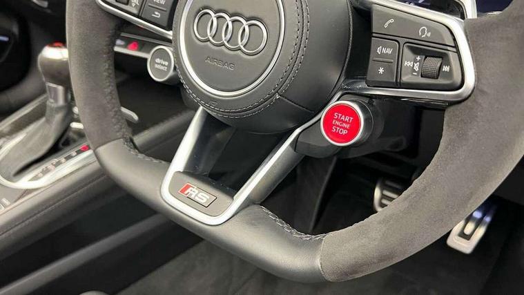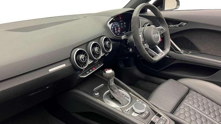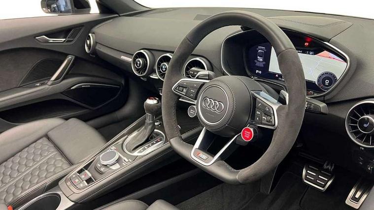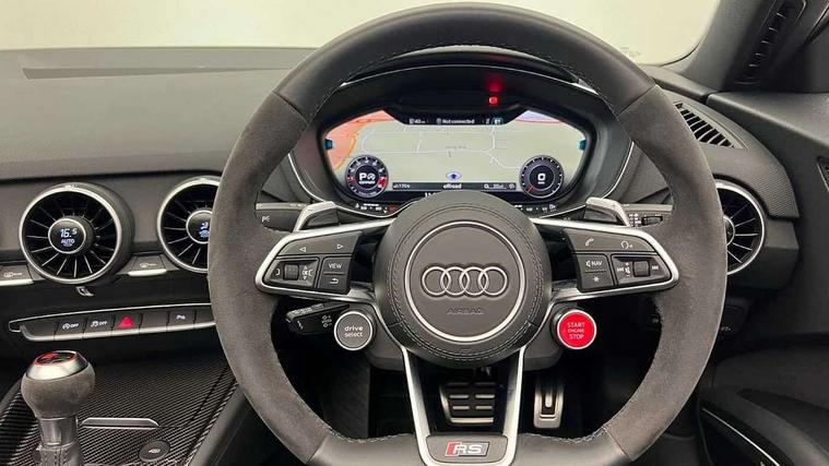 Audi drive select, Audi parking system plus with front and rear sensors, Audi Phone Box with wireless charging - Qi enabled compatible phone and additional bluetooth interface, Audi smartphone interface, Audi virtual cockpit with RS specific with 12.3" full colour digital cluster, 3D navi, info, MMI functionalities, RS specific menu + g force indicator, Cruise control + speed limiter, Emergency call service, Mobile phone preparation with bluetooth interface, Progressive power assisted steering, Seat belt microphone, Service interval indicator, Start/Stop system with energy recuperation, TP memo, TT RS specification sports suspension, Audi sound system, Auxiliary input socket, Bluetooth audio streaming, DAB Digital radio, MMI Radio with CD player and SD/XC card slot, Online medta streaming, All weather LED headlights, Auto dimming rear view mirror, Auto headlight range control, Electric front windows, Electrically adjustable, foldable and heated auto dimming on driver side and automatic kerb view dipping function on the passenger side, Electrically operated wind deflector, Front spoiler, Fully automatic acoustic hood, Green tinted heat insulating glass, High beam assist, LED 3rd brake light, LED daytime running lights, LED Dynamic rear indicators, LED rear lights, Light and rain sensors, Rear boot, RS design body styling, RS sport exhaust system, Sunband for windscreen, TTRS fixed rear wing, Twin oval tailpipes, 3 spoke alcantara sports leather multifunction plus steering wheel, Black headlining, Black roll bar, Coloured interior elements in slate grey on the side of seat, sides of the centre console and air vents, Deluxe auto air conditioning with integrated digital display, Door sill trims with aluminium inlays and TTRS logo, Front centre armrest, Front passenger seat, Front passenger seat isofix location point, Heated front seats, Height adjustable front head restraints, Height/reach adjust steering wheel, RS Gear lever knob in alcantara, Stainless steel pedals and footrest, Tool kit, TTRS badge on the steering wheel, TTRS exhaust sound button in centre console, Black styling pack - TT RS Sport, Extended leather package - TT RS, LED interior light pack - TT/TT RS roadster, Non smoking pack - TT/TT RS, Technology pack without Audi phone box - TT, 3 point front seat belts, Curtain airbags, Driver and front passenger airbag with front passenger airbag deactivation, Electromechanical parking brake, Electronic stabilisation control (ESC) with Sport mode, including ABS, ASR, EBD and EDL, ESP, First aid kit, Front side airbags, Hill hold assist, RS brake system, Seatbelt warning, Warning triangle, Anti theft alarm, Anti theft wheel bolts, Immobiliser, Keyless Go, Remote central locking, Carbon inlays, 20" 7-spoke rotor design alloy wheels in gloss anthracite black, diamond cut finish, Tyre repair kit,