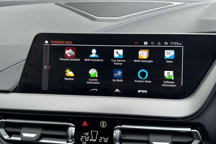 Active guard plus, Attentiveness assist, BMW ConnectedDrive online services, BMW Teleservices, Check Control warning system for monitoring of lights and door/luggage compartment open warning, Cruise control with speed limiter, Eco pro mode, Front axle single joint with specific axle kinematics to minimise drive influences on steering + provide increased rigidity agile driving behaviour, Integrated owners handbook, Lane departure warning system, Oil sensor for level and grade, On board computer, Optimum shift indicator, Personal Profile, Pull away assistant, Rigidly mounted rear subframe - Multi link construction with separate spring / damper configuration and excellent driving characteristics, Speed limit Info including no-overtaking indicator, Aluminium lightweight construction, Anti roll bar front and rear, Balancer shaft, Double VANOS twin scroll turbocharging system, Drive Performance Control, Electronic differential lock, High precision injection, M sport suspension, Petrol Particulate Filter, Twin tube gas filled shock absorbers with degressive characteristic curve, VALVETRONIC engine management, DAB Digital radio, Auto dimming rear view mirror, Automatic headlight beam throw control, Automatic windscreen wipers and automatic headlight, Body colour door handles, Body colour mirror caps, Body colour roof trims, Chrome 'M' logo side designation, Chrome exhaust twin tailpipes round 90mm in left, Chrome kidney grille frame with Satin Aluminium struts, Direction indicator side lights in exterior mirrors, Electrically adjustable exterior mirror with mirror adjustment switch on drivers armrest and aspheric on driver side, convex on passenger side, Fading support, Folding side mirrors with auto dimming/folding wing mirrors with auto dimming, Follow me home headlights, Front and rear bumper system with replaceable deformation elements, Front and rear electric windows with open and close fingertip control, anti trap facility and comfort closing, Front door sill finishers in black plastic with M designation in metallic look, Green tinted heat protection glazing, High gloss shadowline window frame, Recess cover mirror frames and B/C pillar embelisher trim, High level third brake light, Integrated front windscreen with washer jets, LED daytime running lights, LED eyebrow turn indicators, LED front fog lights, Lightweight engineering, Matt black air guide grilles, Matt black wheel arch trim, Model designation on electric bootlid, Nearside reverse light in rear light cluster, Preparation for high beam assistant, Rear fog lights, Rear side wing doors, Rear window wiper, Shark fin antenna, Trailer stabilisation logic, Visible VIN plate, Welcome lighting, 12V power socket in front centre console with blanking plug, 3 rear seat head restraints, 3 seat bench in 2nd row, 3 spoke sports leather steering wheel with black leather and stitching, pearl chrome decorative finish, specific M Badge, Anthracite headlining, Black boot net with lashing eyes, Cargo function on 2nd seat row, Child seat ISOFIX attachment for two outer rear seats and front passenger seat with anchorage points, Conditioned based service, Driver and front passenger backrest net on rear, Driver and front passenger seat heating, Driver side folding compartment in instrument panel, Folding rear clothes hook, Four grab handles integrated in roof lining, Front and rear door pockets with bottle holders, Front and rear side armrest integrated into door trim, Front armrest, Front sports seats, Glove compartment, Height adjustable front head restraints, Luggage compartment for bag hooks on left and right, foldable luggage compartment liner and four lashing eyelets, Manual adjust steering wheel, Multi-function controls for steering wheel, Single front passenger seat, Storage compartment in centre console, Storage compartment in luggage compartment, Stowage of the parcel shelf in luggage compartment trim, Sun visors with vanity mirrors and insert tab, Two front centre console cupholders, Two zone automatic air conditioning, Type C two USB ports in rear centre console, Velour floor mats, Additional interior lighting pack - 1 Series, BMW live cockpit professional pack- 1 Series, Connected pack professional - 1 Series, Interior lights pack - 1 Series, M Sport exterior styling aerodynamics pack - 1 Series, 2 tone horn, 3 point seatbelts on all seats, front pyrotechnic belt tensioners, stopper and belt force limiters, rear coded belt buckles, Airbags - Front driver/passenger, front and rear curtain head protection, front side, manual deactivation of front passenger airbag, Anti lock braking system (ABS) with brake assist, BMW emergency call, Brake drying, Braking readiness, Child proof locking system in rear door, City braking function, Comfort modes, Cornering brake control, Crash sensor activating of airbags, Unlocking doors, hazard warning lights, fuel cut off, interior lighting+activation of safety battery terminal clamp, Driver and front passenger seat belt security check, Dynamic stability control + (DSC+), Dynamic Traction Control - DTC, Electrically operated hand brake including automatic hold function, Front and rear disc brakes, Seatbelt warning, Side impact protection, Tyre pressure monitoring system, Warning triangle and first aid kit, Central locking switch for all doors, fuel filler cap and luggage compartment, Deadlocking function system to all doors, Drive away locking system on all doors and luggage compartment with de-activated in iDrive settings, Locking wheel bolts, Remote control with integrated key with High-gloss Black inlay and M designation and 1 button for open/ close lock, window, open luggage compartment, Start/stop button illuminated in centre console with keyless engine start and auto start stop deactivation button, Thatcham Cat.1 alarm and immobiliser, Wheel slip limitation close to the actuator (ARB), Contrast stitching on instrument panel, 18" Burnished M double spoke bi-colour alloy wheels finished in orbit grey - styl