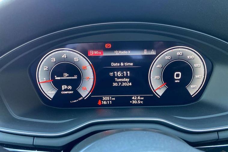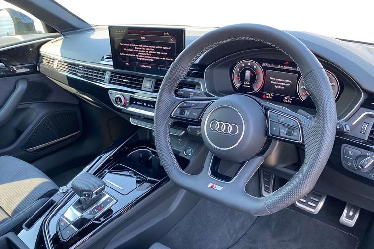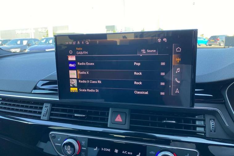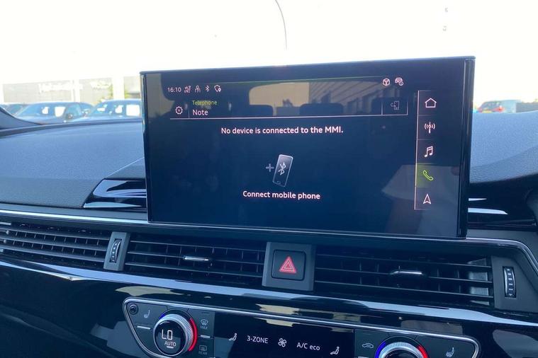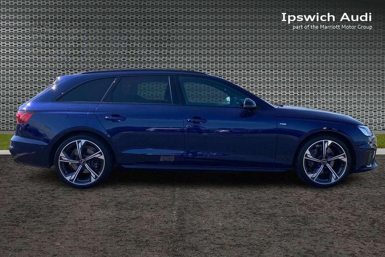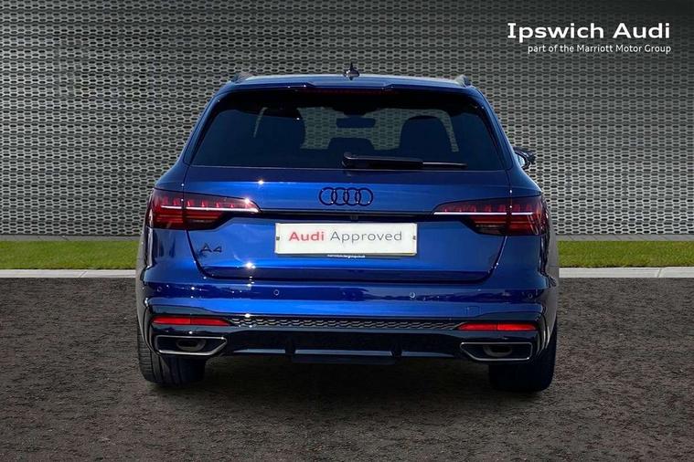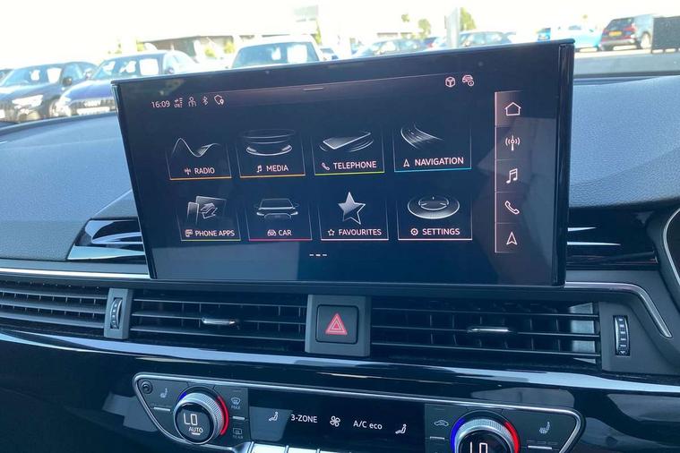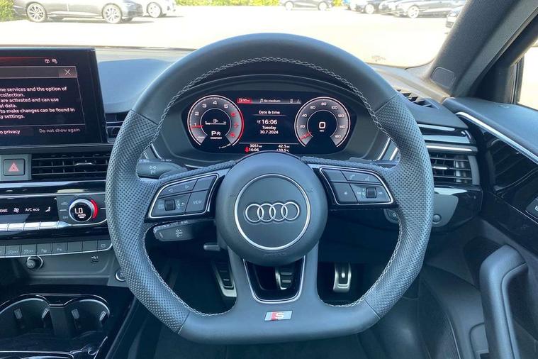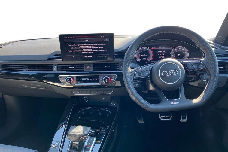 Audi connect safety and service (e-call), Audi drive select, Audi smartphone interface, Audi virtual cockpit, Automatic start-stop system with coasting functionality and efficiency programme, Bluetooth interface, Camera based traffic sign recognition, Electromechanical power steering, Email, calendar and text messages displayed via MMI, Front and rear parking sensors, Lane departure warning, MMI Navigation plus with MMI touch includes 10.1" high resolution colour MMI display, 3D map, Power operated tailgate, Rear view camera, Voice control system, 54 litre fuel tank, Sports suspension lowered by 23mm, 2 USB charging ports, 8 passive loudspeakers, DAB digital radio reception, Audi beam uses LEDs to project the audi logo onto the ground as you exit your A4, Auto dimming rear view mirror, Black Audi rings and black badging (model name in black badging, no engine badging), Body colour door handles, Body colour front spoiler lip, Body colour side sill trim, Electric adjustable/heated/folding door mirrors with auto dimming, Exhaust tailpipes in high dark chrome, Grained matt black side air inlets with matt aluminium silver inlay, High beam assistant, High gloss black B pillar trims and triangular rear door trim, LED headlights with LED rear lights + dynamic rear indicators + headlight adjustment and high beam, turning light + LED daytime running lights, LED third brake light, Privacy glass, Rain and light sensors, Rear diffuser in matt black with trim strip in matt aluminium silver, Rear side wing doors, Rear wiper, RS4 rear spoiler in body colour, S Line roof edge spoiler, Sport front and rear bumpers with side skirts, Variable intermittent front wash/wipe, Windscreen with acoustic glazing, 4 way electric lumbar support for driver and front passenger, 40/20/40 split folding 3 rear seat bench in 3 parts with rear centre armrest, Black carpets, Black cloth headlining, Black perforated leather gearknob, Contrast stitching on seats, steering wheel and gear lever gaiter, Deluxe 3 zone electronic climate control, Electric load area cover, Front and rear head restraints, Front centre armrest, Heated front seats, Illuminated door sill trims with S logo, ISOFIX child seat mounting and top tether, Manual seat adjustment, Single front passenger seat, Stainless steel pedals and foot rest, Tool kit, Black styling pack - A4 Avant, LED Interior light pack - A4/S4, 3 rear seatbelts, 6 airbags - Driver, front passenger, curtain and side windows, Attention and drowsiness assist, Electronic Stabilisation Control (ESC) including ABS, ASR and EDL, Hill hold assist, Multi collision brake assist, Pop-up bonnet for pedestrian protection, Pre sense city, Rear door child safety locks, Seatbelt monitoring, Warning triangle and first aid kit, Anti theft alarm, Anti theft wheel bolts, Central locking, Keyless Go, Piano black finish inlay, Tyre repair kit,