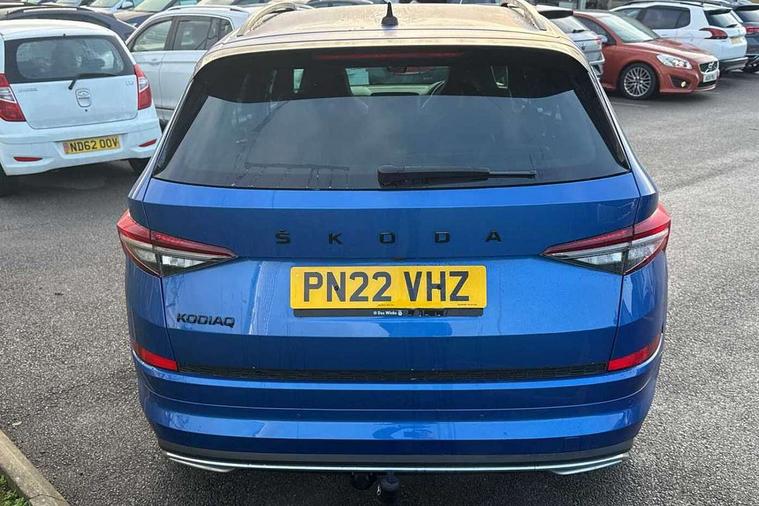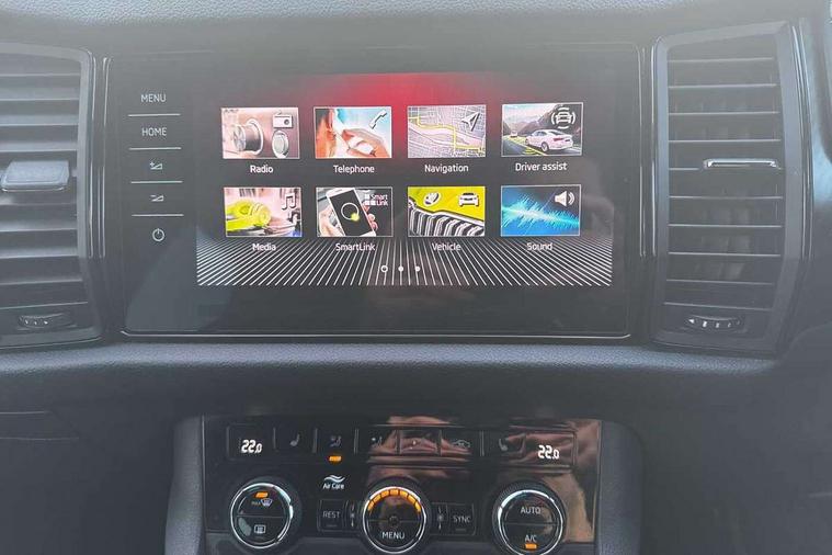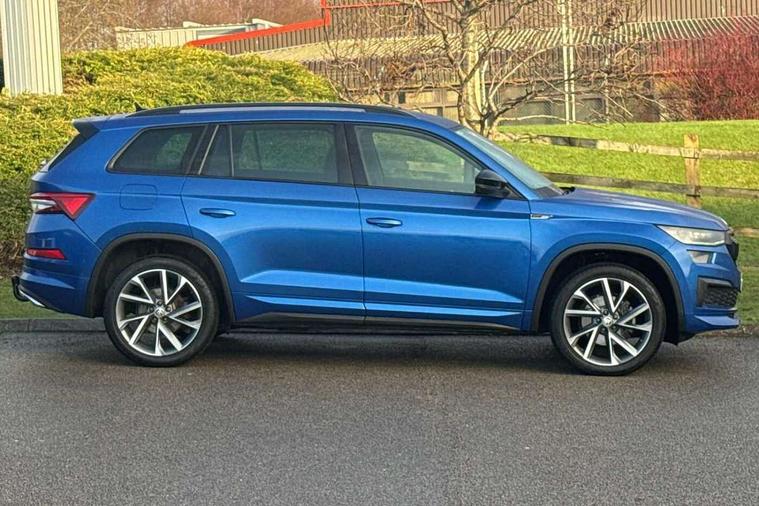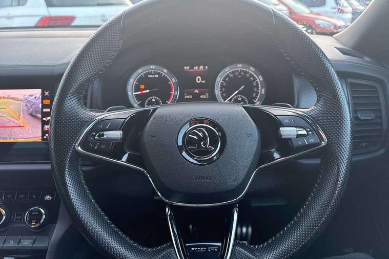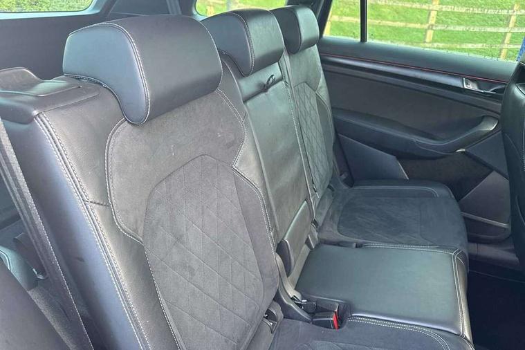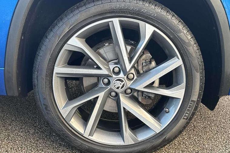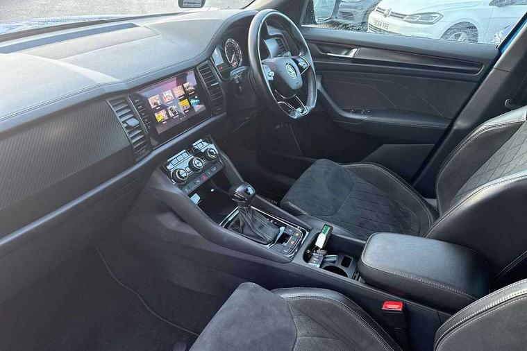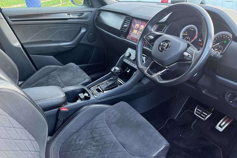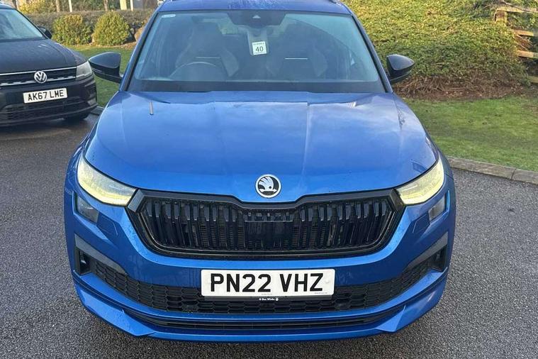 Bluetooth system, Columbus satellite navigation with 9.2" touchscreen, integrated Wi-Fi, web radio, E-call, ECO Stop/start function, Exterior temperature indicator, Progressive steering, Rear view camera, Smartlink wireless for apple carplay and wired for android auto, Speed limiter, USB C Port x 2 in front centre console, Wireless charging, 8 speakers, DAB Digital radio, Aero front windscreen wipers with intermittent function, Aero rear window wiper, Auto dimming rear view mirror, Black roof rails, Black sports styling including front grille and window surrounds, Black wheel arch surrounds, Body colour bumpers, Body colour door handles, Electric adjustable/heated/folding door mirrors, driver side auto dimming with boarding sports and memory function, Electric front and rear windows, Extended rear spoiler with finlets in gloss black, Front fog lights, Full LED matrix headlights with AFS (adaptive front light system), cornering function and AWL (all weather lighting system), Gloss black door mirrors, Headlight washers, Heated rear window, Invisible tailpipe, LED daytime running lights, LED rear fog light, LED third brake light in rear spoiler, Light assistant (coming/leaving home/tunnel light), Off-road style lower front bumper element, Privacy glass, Rain and light sensors, Rear diffuser, Rear LED lights (high functionality) with welcome effect and dynamic indicators, Rear side wing doors, Safety reflectors on front and rear doors, Sportline badge on front fender, Sports front and rear bumpers including lower rear chrome strip, Tailgate lettering in Black, Window control switches with black trim, 12V socket in boot, 2 rails with 2 hooks, 2 seat bench in 3rd row, 3 seat bench in 2nd row, 4 foldable roof handles with rear coat hooks, 60:40 foldable rear seat with sliding adjustment and backrest angle adjustment, Aluminium pedals, Black roof headlining, Bottle holders in door panel in the 1.5 litre front and 1 litre rear, Cargo storage compartments, Chrome headlight control button, Chrome interior door handles, Coat hooks on B pillar, Covered storage compartment on driver side, Decorative door sills in the front and rear, Front centre armrest with storage compartment, cup holder and 12V socket, Front courtesy lights, Gear shift lever with chrome frame and black gloss insert, Grey stitching in front and rear armrests and door armrests + door inserts, Height adjustable front headrests, Illuminated and cooled glovebox, Illuminated luggage compartment, Isofix child seat fittings in outer rear seats with top tether, Manually adjustable steering column, Microsuede door panels, Net programme in boot (1x horizontal Net, 2x vertical Nets), Overhead glasses storage compartment, Pollen filter, Rear centre armrest with cupholders, Single front passenger seat, Sliding trunk cover, Small Bags on the inner sides of the front backrests, Sports seats, Sunvisors with illuminated vanity mirrors, Three rear height adjustable headrests, Ticket holder on A Pillar, Umbrella in door panel, Variable boot floor, LED Interior light pack - Kodiaq, Auto door release and activation of warning lights, Child locks on rear doors, Driver and front passenger airbag with knee airbag and front passenger airbag deactivation, Electronic parking brake with hill start assist, Emergency rear braking signal, ESC (incl. ABS+MSR+ASR+EDS+HBA+DSR+RBS+MKB), Front assist with autonomous emergency braking, Front side airbags with curtain airbags, Fuel cut off safety device, Height adjustable front 3 point seatbelts + pretensioners, Hill hold control, Rear disc brakes, Safety vest holder in door, Seat belt reminder for all seats, Tailgate unlocking from outside, Three point rear seat belts, Two tone horn, Tyre pressure monitor, Alarm with interior monitoring and tilt sensor with safe function, Anti-theft wheel bolts, Immobiliser, Keyless entry and start system (KESSY), Remote central locking with 2 keys, Black air vent surround, Carbon finish dashboard and door inserts, Grey stitching in dashboard, 20" Vega Anthracite alloy wheels, Temporary spare wheel (space saver),