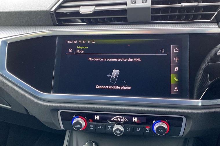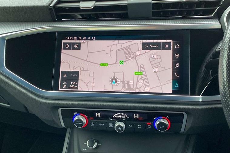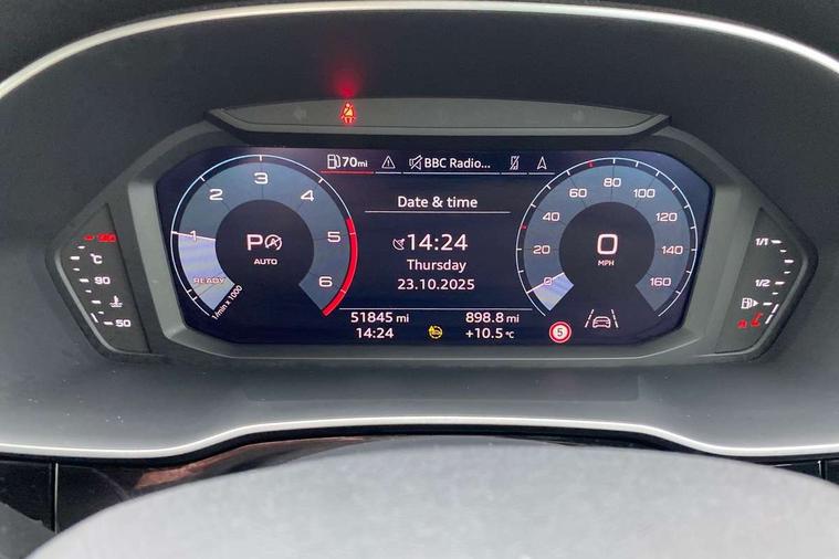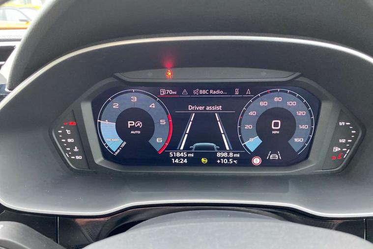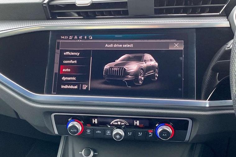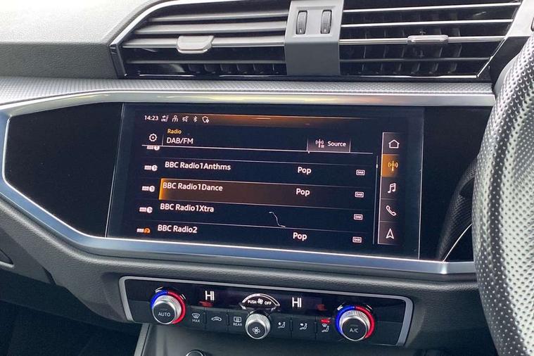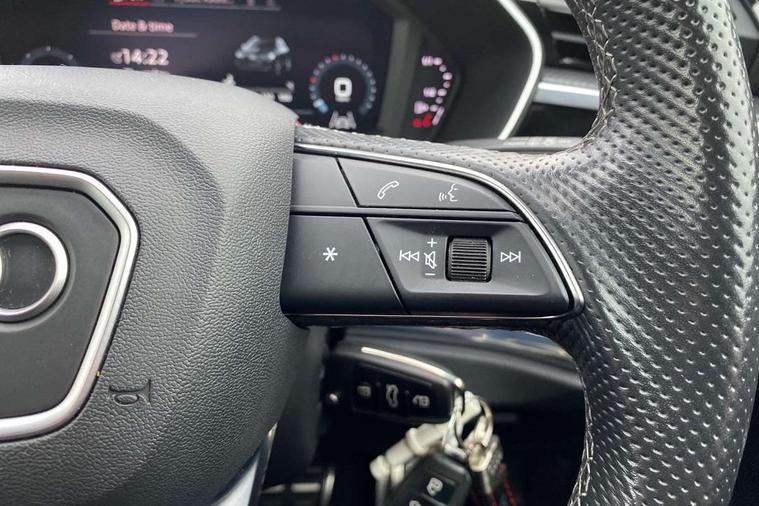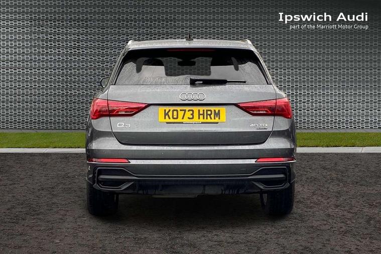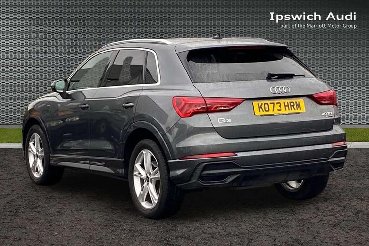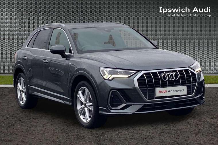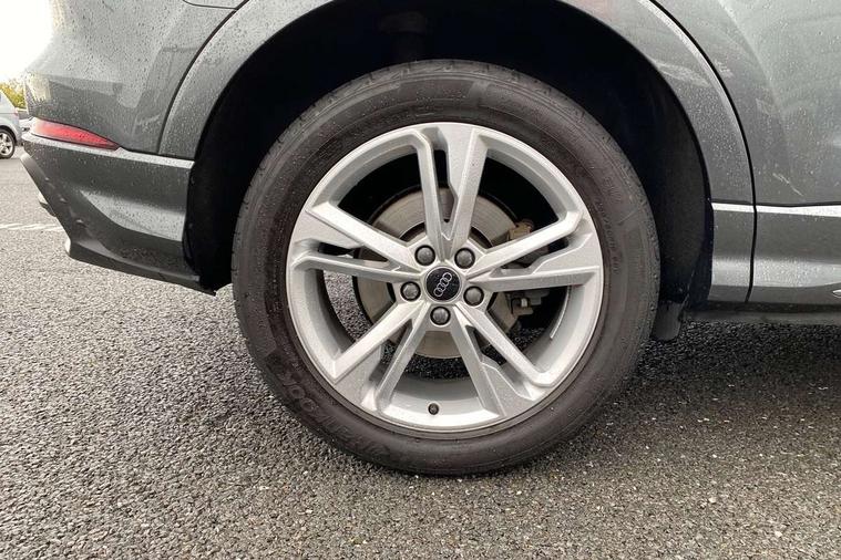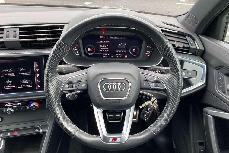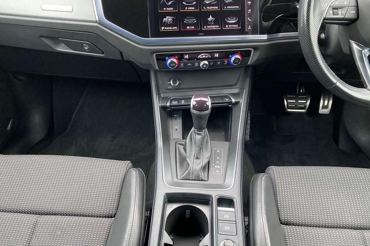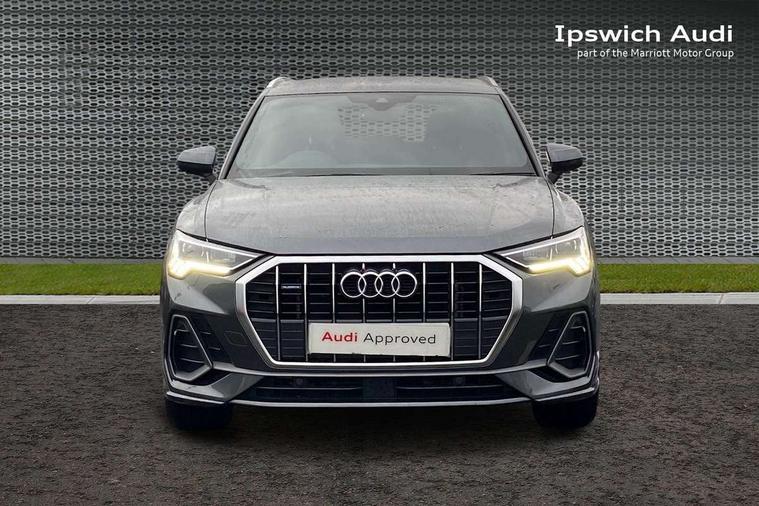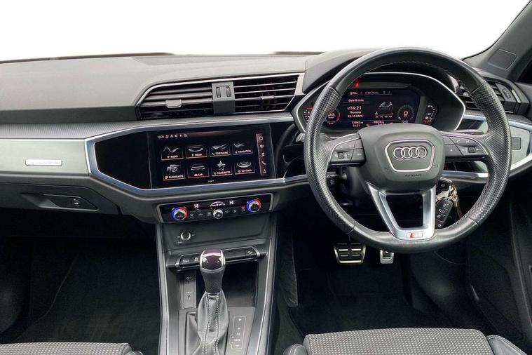Amazon alexa Integration, Audi drive select, Audi lane departure warning, Audi smartphone interface includes wireless Apple carplay/Android Auto, Audi Virtual Cockpit - 10.25" display, Bluetooth interface, Camera based traffic sign recognition, Legal emergency call, MMI Navigation Plus with high resolution 10.1 inch touchscreen colour display, Power operated tailgate, Progressive steering, Service interval indicator, Start stop system with recuperation, Voice control system with natural language interaction, Diesel particulate filter, Sports suspension, 2 USB-C ports with charge and data functions, 6 passive loudspeakers, DAB digital radio module, Acoustic windscreen, Aluminium roof rails, Aluminium window trim, Anthracite black radiator grille, Auto dimming frameless rear view mirror, Body colour front spoiler blade, Body coloured bumpers, Electrically folding, adjustable and heated door mirrors with integrated LED side indicators and kerb view function for passenger side, Front and rear electric windows, Front fog lights, Front side air inlets in matt platinum grey, Grille vertical bars in aluminium silver/Matt, High gloss black finish B and C pillars, LED Dynamic rear indicators, LED headlights with LED daytime running lights, LED rear lights, LED third brake light, Privacy glass dark tinted rear and rear-side windows (from B-pillar backwards), Rain and light sensors, Rear diffuser grille in grained matt black, Rear diffuser strip in matt anthracite black, Rear side wing doors, Rear wiper, S line badges on front wings, S Line front and rear bumpers, Side skirt insert in matt Platinium grey, Variable front intermittent wipers, 12V socket in rear centre console, 3 seat bench in 2nd row, 3 spoke leather multifunction steering wheel features S badging and grips in perforated leather with contrast stitching, 40:20:40 folding with manual adjustment for 60:40 forwards/backwards position and backrest angle, Adjustable rear seat bench/backrest with centre armrest and cupholder, Black cloth headlining, Dual zone electronic climate control, Front and rear black floor mats with contrast stitching in rock grey, Front and rear headrests, Front and rear roof module including reading lights, Front centre armrest, Glove compartment lighting, Height and reach adjustable steering wheel, Illuminated door sill trims with S logo, ISOFIX child seat mounting for front passenger with airbag deactivation and outer rear seat including top tether attachment point for outer rear seats, Luggage compartment light, Manual front seats with height adjustment, Perforated leather gearknob, Single front passenger seat, Stainless steel luggage compartment sill finisher, Stainless steel pedals, Ambient lighting pack - Q3, Non smoking pack - Q3, 3x3 point rear seatbelts, 6 airbags - Driver, front passenger, curtain and side windows, Audi pre-sense front with pedestrain and cyclist recognition, Electrically operated child locks on rear doors, Electromechanical parking brake, Electronic stabilisation control including ABS, ASR and EDL, Front seatbelt reminder, Hill descent control, Hill hold assist, Pre sense basic, Seatbelt monitoring, Tyre pressure warning, Warning triangle and first aid kit, Anti theft alarm, Anti theft wheel bolts, Immobiliser, Remote central locking, Aluminium look interior elements, Dark matt brushed aluminium inlay, Detail dashboard around MMI touch colour display in glass look, black with surround in aluminium look, Leatherette door armrest,