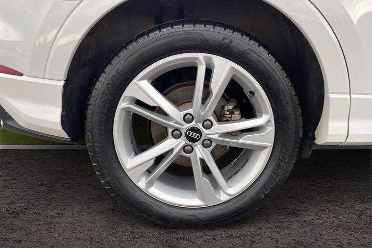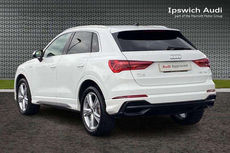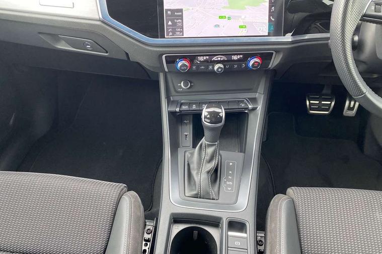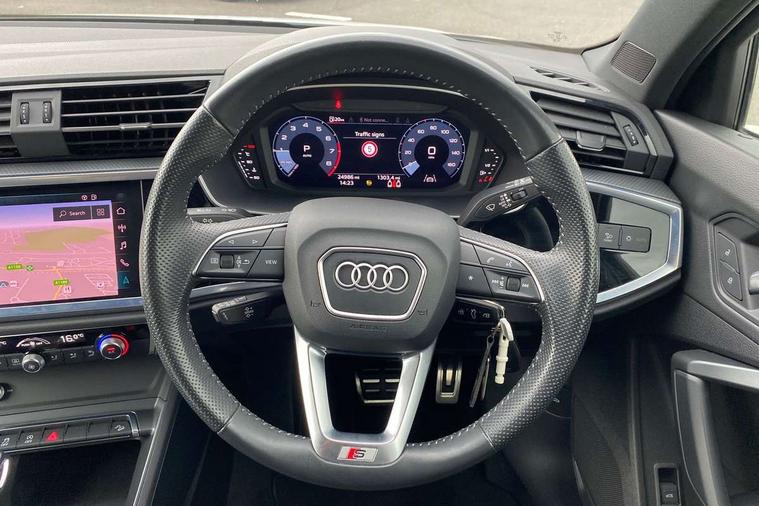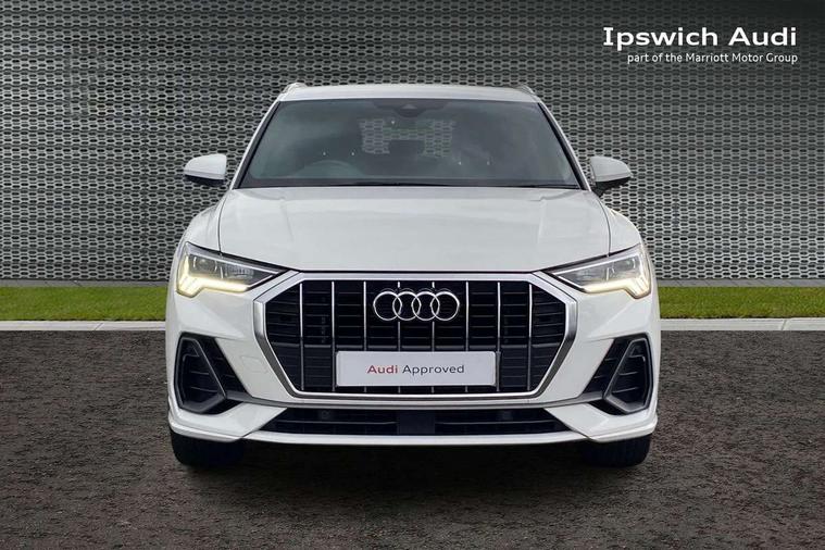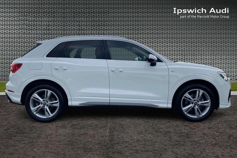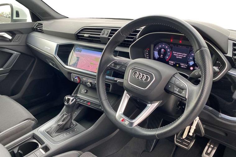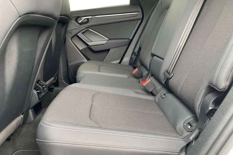 Audi connect safety and service (e-call), Audi drive select, Audi lane departure warning, Audi side assist, Audi smartphone interface includes wireless Apple carplay/Android Auto, Audi Virtual Cockpit - 10.25" display, Bluetooth interface, Camera based traffic sign recognition, MMI Navigation Plus with high resolution 10.1 inch touchscreen colour display, Power operated tailgate, Progressive steering, Service interval indicator, Start stop system with recuperation, Voice control system with natural language interaction, 48V Mild hybrid technology, Sports suspension, 1 x USB type C and 1 USB type A charging points, 6 passive loudspeakers, DAB digital radio module, Acoustic windscreen, Aluminium roof rails, Aluminium window trim, Auto dimming frameless rear view mirror, Body coloured bumpers, Electrically folding, adjustable and heated door mirrors with integrated LED side indicators and kerb view function for passenger side, Front and rear electric windows, Front fog lights, Front side air inlets in matt platinum grey, Front spoiler blade in matt platinum grey, Grille vertical bars in aluminium silver/Matt, High gloss black finish B and C pillars, LED headlights with LED daytime running lights and dynamic rear indicator, LED rear lights, Privacy glass dark tinted rear and rear-side windows (from B-pillar backwards), Rain and light sensors, Rear diffuser strip in matt titanium black, S line badges on front wings, S Line front and rear bumpers, Side skirt insert in matt Platinium grey, Silver chrome grille surround, Titanium black radiator grille, 12V socket in rear centre console, 40:20:40 folding with manual adjustment for 60:40 forwards/backwards position and backrest angle, Adjustable rear seat bench/backrest with centre armrest and cupholder, Black cloth headlining, Dual zone electronic climate control, Front and rear black floor mats with contrast stitching in rock grey, Front and rear headrests, Front and rear roof module including reading lights, Front centre armrest, Glove compartment lighting, Height and reach adjustable steering wheel, Illuminated door sill trims with S logo, ISOFIX child seat mounting for front passenger with airbag deactivation and outer rear seat including top tether attachment point for outer rear seats, Luggage compartment light, Manual front seats with height adjustment, Perforated leather gearknob, Stainless steel luggage compartment sill finisher, Stainless steel pedals, Tool kit, Non smoking pack - Q3, 3x3 point rear seatbelts, 6 airbags - Driver, front passenger, curtain and side windows, Audi pre-sense front with pedestrain and cyclist recognition, Electrically operated child locks on rear doors, Electromechanical parking brake, Electronic stabilisation control including ABS, ASR and EDL, Hill descent control, Hill hold assist, Pre sense basic, Seatbelt monitoring, Tyre pressure warning, Warning triangle and first aid kit, Anti theft alarm, Anti theft wheel bolts, Remote central locking, Dark matt brushed aluminium inlay, Detail dashboard around MMI touch colour display in glass look, black with surround in aluminium look, Leatherette door armrest, Tyre repair kit,