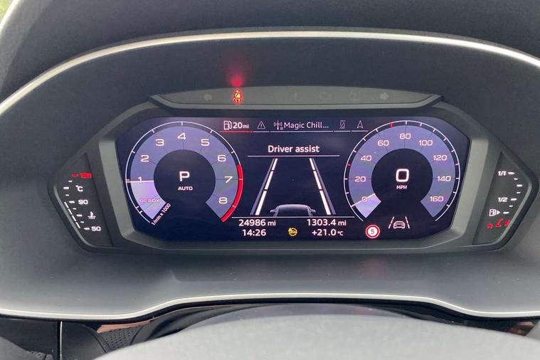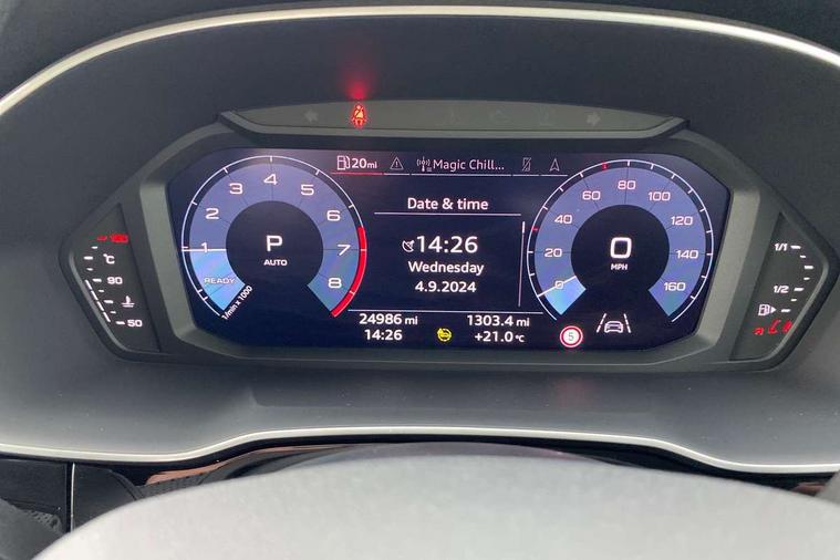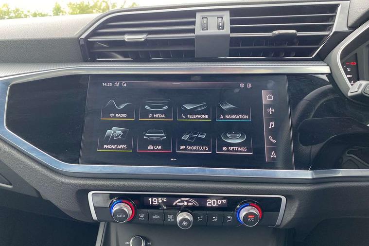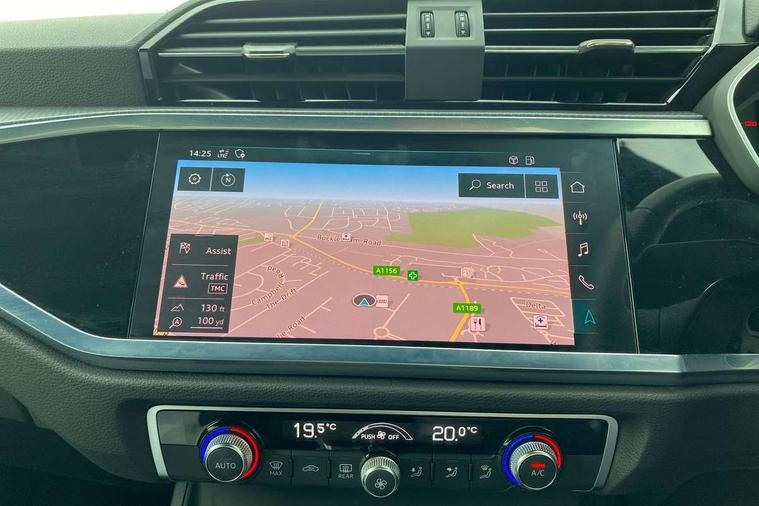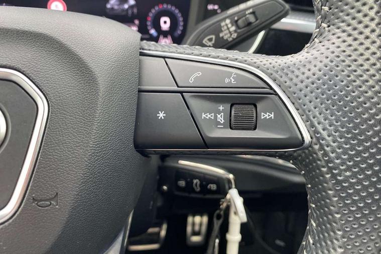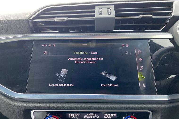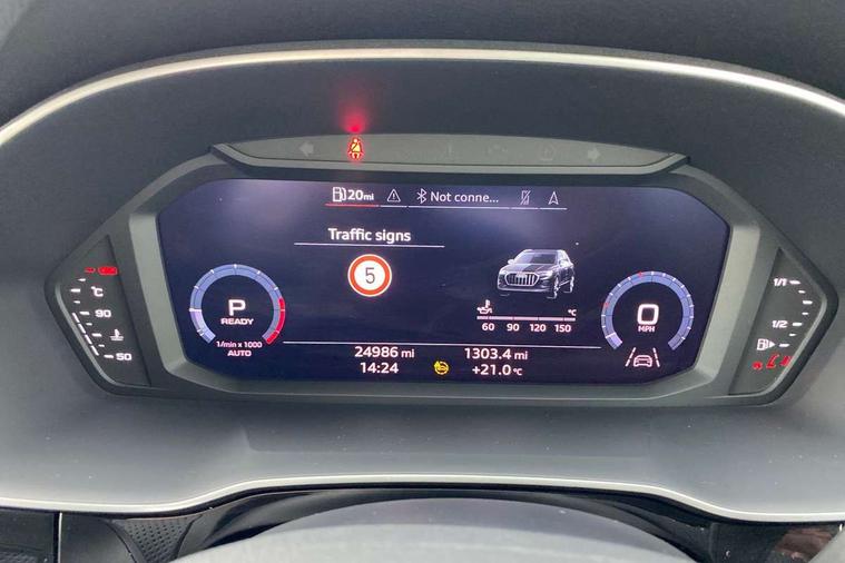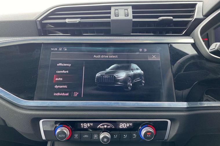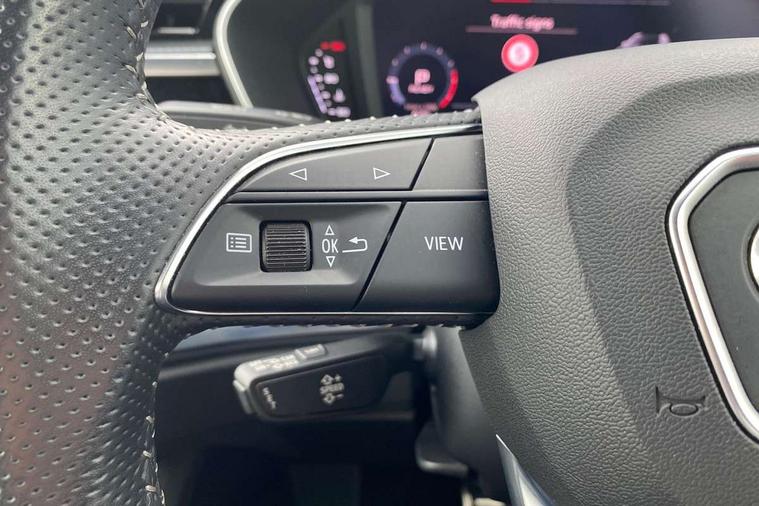 Audi connect safety and service (e-call), Audi drive select, Audi lane departure warning, Audi side assist, Audi smartphone interface includes wireless Apple carplay/Android Auto, Audi Virtual Cockpit - 10.25" display, Bluetooth interface, Camera based traffic sign recognition, MMI Navigation Plus with high resolution 10.1 inch touchscreen colour display, Power operated tailgate, Progressive steering, Service interval indicator, Start stop system with recuperation, Voice control system with natural language interaction, 48V Mild hybrid technology, Sports suspension, 1 x USB type C and 1 USB type A charging points, 6 passive loudspeakers, DAB digital radio module, Acoustic windscreen, Aluminium roof rails, Aluminium window trim, Auto dimming frameless rear view mirror, Body coloured bumpers, Electrically folding, adjustable and heated door mirrors with integrated LED side indicators and kerb view function for passenger side, Front and rear electric windows, Front fog lights, Front side air inlets in matt platinum grey, Front spoiler blade in matt platinum grey, Grille vertical bars in aluminium silver/Matt, High gloss black finish B and C pillars, LED headlights with LED daytime running lights and dynamic rear indicator, LED rear lights, Privacy glass dark tinted rear and rear-side windows (from B-pillar backwards), Rain and light sensors, Rear diffuser strip in matt titanium black, S line badges on front wings, S Line front and rear bumpers, Side skirt insert in matt Platinium grey, Silver chrome grille surround, Titanium black radiator grille, 12V socket in rear centre console, 40:20:40 folding with manual adjustment for 60:40 forwards/backwards position and backrest angle, Adjustable rear seat bench/backrest with centre armrest and cupholder, Black cloth headlining, Dual zone electronic climate control, Front and rear black floor mats with contrast stitching in rock grey, Front and rear headrests, Front and rear roof module including reading lights, Front centre armrest, Glove compartment lighting, Height and reach adjustable steering wheel, Illuminated door sill trims with S logo, ISOFIX child seat mounting for front passenger with airbag deactivation and outer rear seat including top tether attachment point for outer rear seats, Luggage compartment light, Manual front seats with height adjustment, Perforated leather gearknob, Stainless steel luggage compartment sill finisher, Stainless steel pedals, Tool kit, Non smoking pack - Q3, 3x3 point rear seatbelts, 6 airbags - Driver, front passenger, curtain and side windows, Audi pre-sense front with pedestrain and cyclist recognition, Electrically operated child locks on rear doors, Electromechanical parking brake, Electronic stabilisation control including ABS, ASR and EDL, Hill descent control, Hill hold assist, Pre sense basic, Seatbelt monitoring, Tyre pressure warning, Warning triangle and first aid kit, Anti theft alarm, Anti theft wheel bolts, Remote central locking, Dark matt brushed aluminium inlay, Detail dashboard around MMI touch colour display in glass look, black with surround in aluminium look, Leatherette door armrest, Tyre repair kit,
