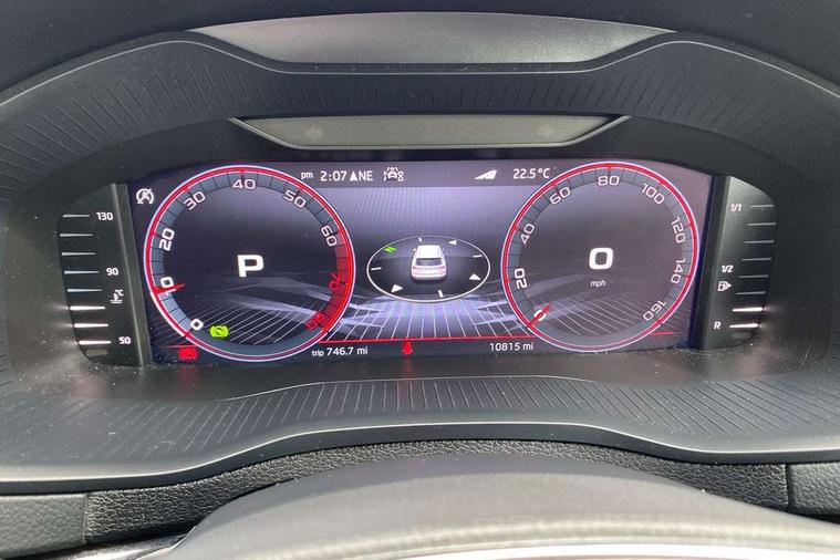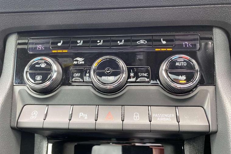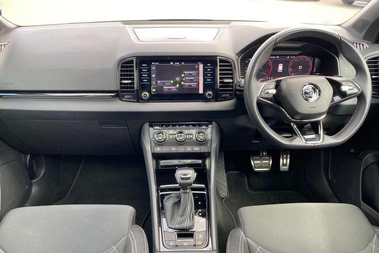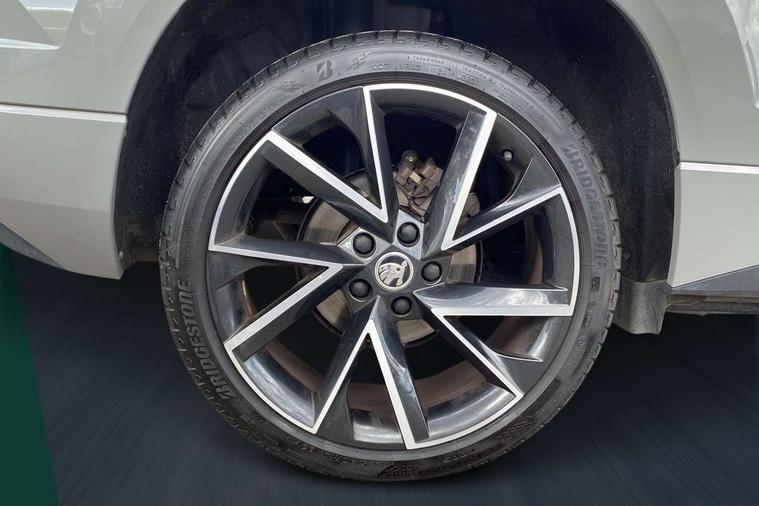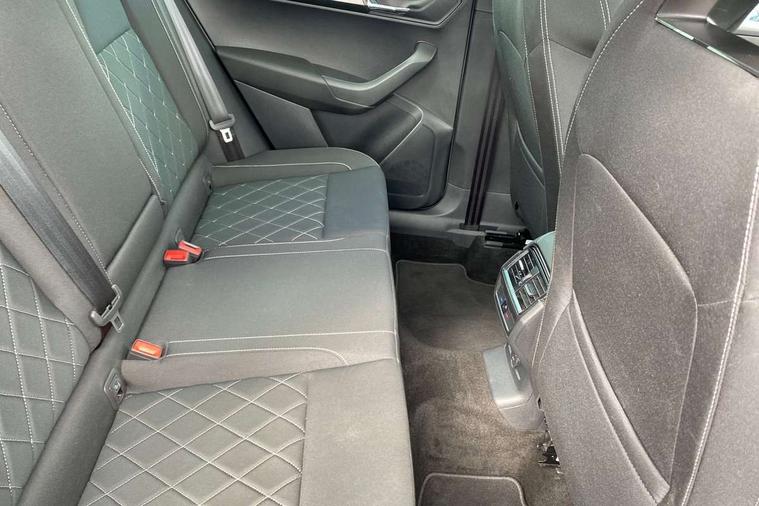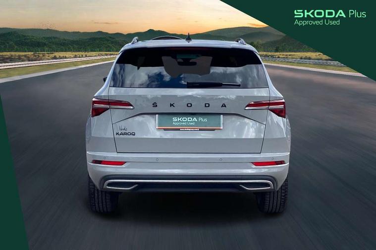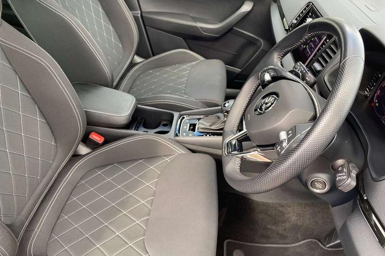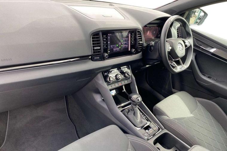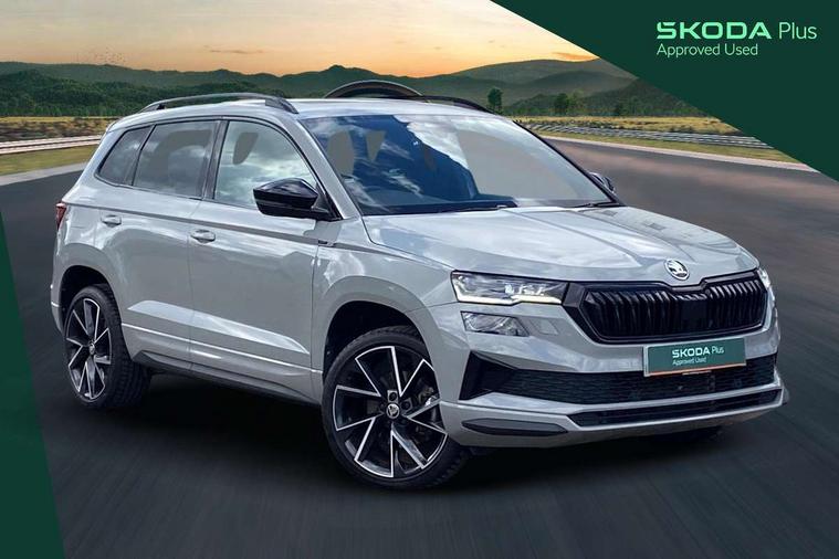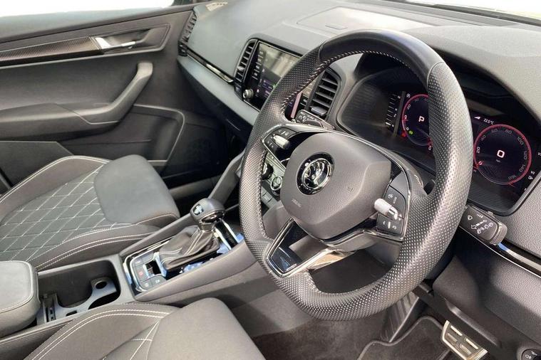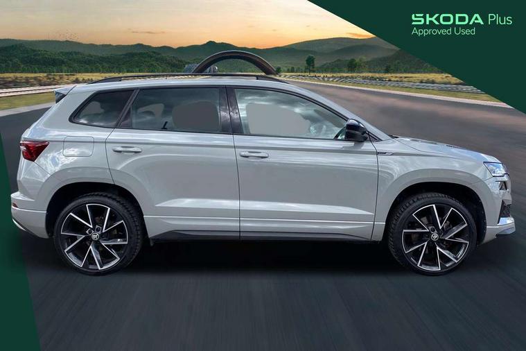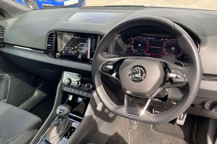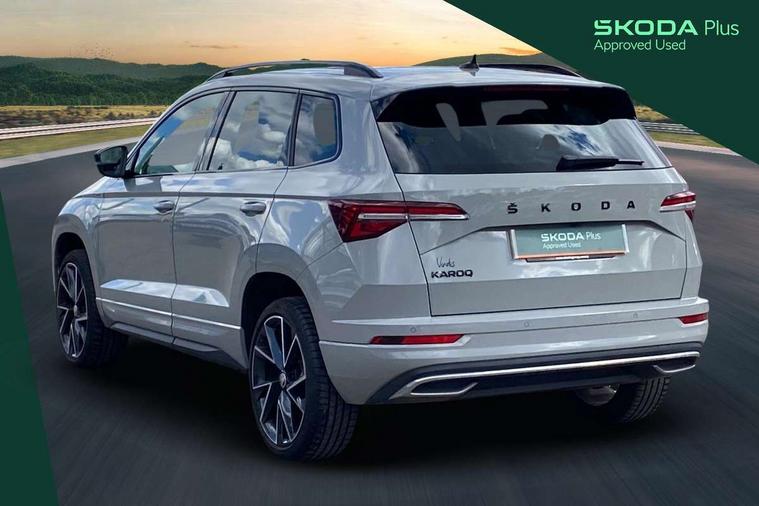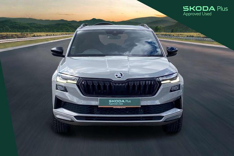 8" Digital display, Care connect, Driver fatigue sensor, Emergency services call system, Outside temperature gauge, Service interval indicator, SmartLink wireless for Apple and wired for Android, Start/stop system with regenerative braking, USB C Port x 2 in front centre console, Virtual cockpit, Virtual pedal with electrically operated boot door, 8 speakers, DAB radio with Bluetooth, USB connection, Wireless charging without wireless aerial connection, Acoustic glass, Aero front windscreen wipers with intermittent function, Auto dimming rear view mirror with light and rain sensors, Black door mirrors, Black electric window control buttons, Black radiator grille, Black roof rails, Body colour door handles, Electric front and rear windows with child proof lock, Front door steps with SportLine logo, Heated rear windscreen, LED daytime running lights, LED rear lights with high functionality welcome effect and dynamic indicators, Light assistant (coming/leaving home/tunnel light), Panoramic sliding sunroof, Plastic scuff plates, Privacy glass, Protective door side sills in body colour, Rear diffuser, Rear side wing doors, Rear spoiler, Rear window wiper with washer system and intermittent control, Safety reflectors on front doors, Skoda lettering on tailgate in black, Sportline badge on front fender, Sportline decorative inserts with badging, Sports front and rear bumpers, 1.5 litre bottle holders in driver and front passenger door panels, 12V socket in boot, 12v socket in front centre armrest with storage compartment and rear air vents, 3 rear height adjustable headrests, 3 seat bench in 2nd row, 3 spoke leather sports multifunction steering wheel and silver stitching with gear shift paddles, 4 foldable roof handles with rear coat hooks, Black floor carpet, Black roof headlining, Chrome inner door handles, Double sided boot floor, Foldable hooks in the boot, Front head restraints, Height adjustable front three point seats belts with tensioners, Height/reach adjust steering wheel, Ice scraper, Illuminated glovebox, Illuminated luggage compartment, Isofix child seat preparation outer rear, Manual lumbar support for front seats, Pen holder, Pollen filter, Rear boot cover, Rear reading lights, Rear seats fixed folding and divided 60:40, Rubbish bin door, Safety vest holder, Single front passenger seat, Storage box in upper central dashboard closed, Sunvisors with illuminated vanity mirrors, Textile floor mats, Ticket holder, Titan black interior ceiling, Tool kit, Welcome animation with sportline logo, Boot pack - Karoq, Light Pack - Karoq, Parking pack - Karoq, Automatic door unlocking in case of crash, Automatic fuel cut off in case of crash, Child locks on rear doors, Driver airbag, Electronic parking brake with auto hold function, Emergency rear braking signal, ESC including ABS, MSR, ASR, EDS, HBA, DSR, RBS, MKB and traction control, Front side airbags, Hill hold control, Knee airbags, Passenger airbag with switch-off function, Pedestrian monitor, Seatbelt reminder signalisation and pretensioner for all seats, Three point seatbelts rear, Two tone horn, Tyre pressure display, Tyre pressure monitor, Alarm with interior monitoring, back up horn and tilt sensor with safe function, Electronic engine immobiliser, Keyless entry and start/stop, Remote central locking with 2 remote folding keys, Black air vent surround, Black centre console, Satin black dashboard, Satin black door trim, 19" Sagitarius anthracite alloy wheels with matt black aero inserts, Anti-theft wheel bolts protection, Matt black aero hub caps, Storage on wheel cover,