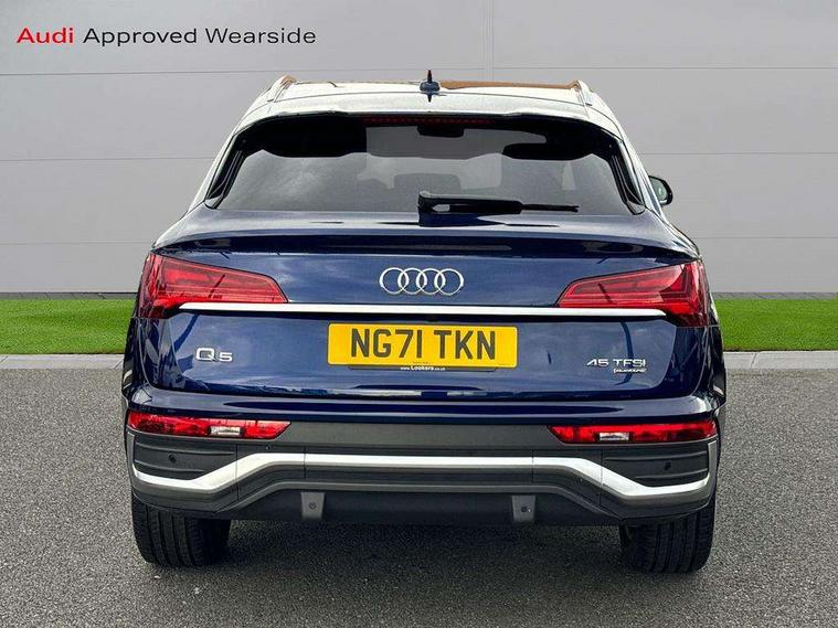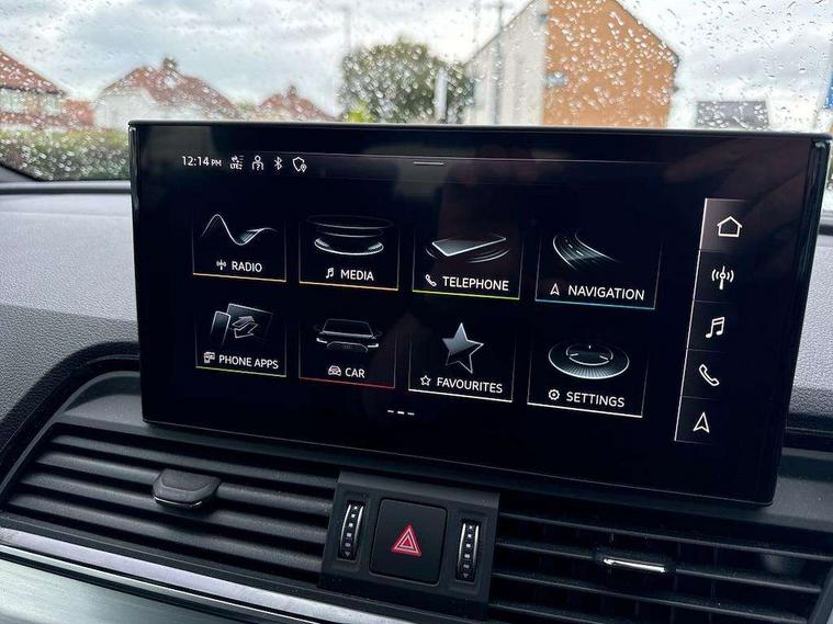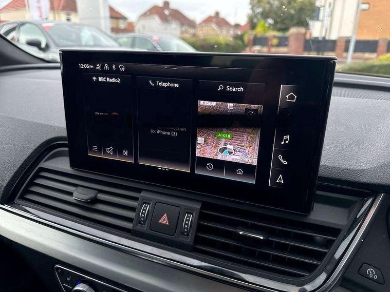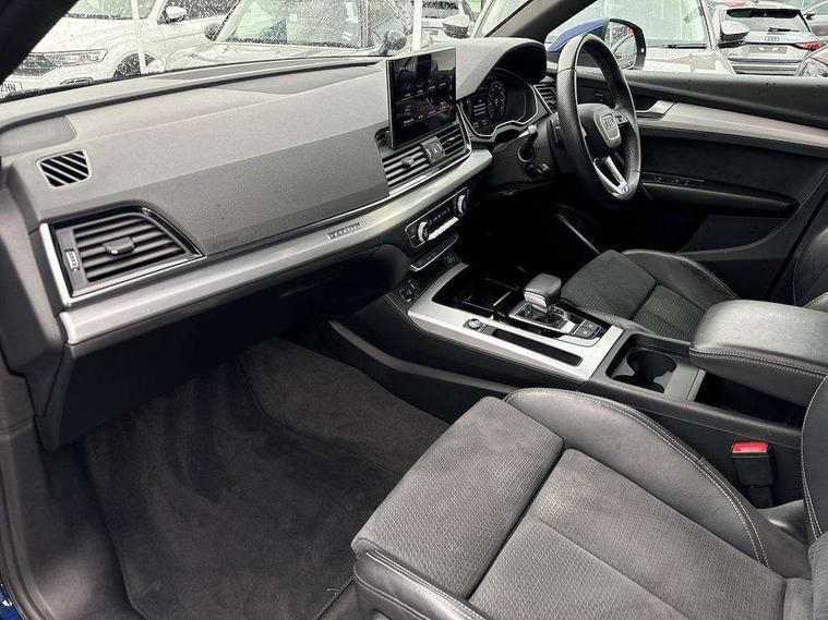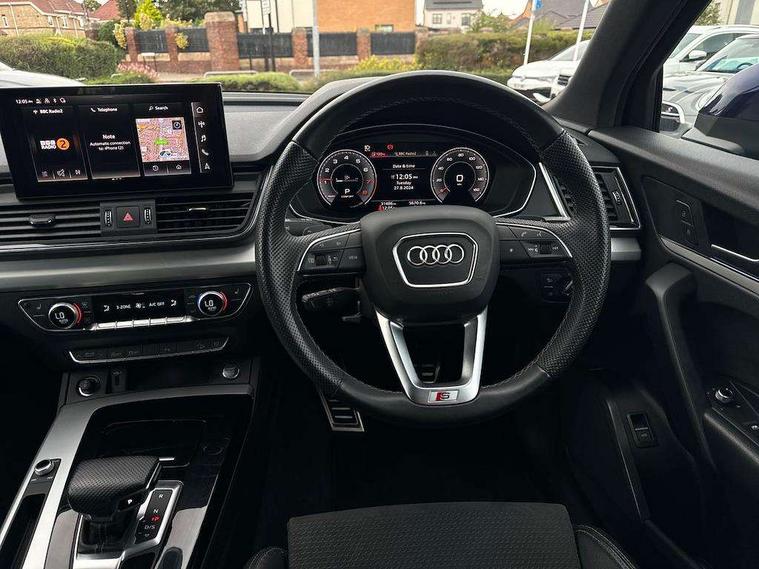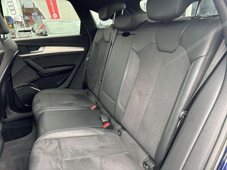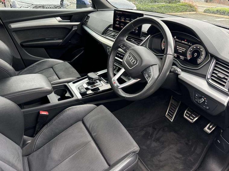 Audi connect safety and service (e-call), Audi connect with Amazon Alexa Integration, Audi drive select, Audi virtual cockpit plus with 12.3" screen and three different layout designs, Audi wireless smartphone interface, Automatic start-stop system with coasting functionality and efficiency programme, Bluetooth interface, Electro - mechanical power assisted steering, MMI navigation plus with 10.1" touch screen, Power tailgate, Reversing camera, Service interval indicator, Voice control system with Audi hotword activation "Hey Audi", Quattro on demand, S line sports suspension, DAB Digital radio, Acoustic windscreen, Aluminium roof rails, Audi matrix LED headlights with dynamic front and rear indicators, Auto dimming door mirrors, Auto dimming rear view mirror, Automatic headlights and windscreen wipers, Body colour door mirrors, Body colour rear diffuser with matt aluminium silver surrounds, Body colour underbody protection, Chrome plated exhaust trims, Daytime running lights, Door sills in Selenite silver, Electric adjustable/heated/folding door mirrors, Front air inlet surrounds in aluminium, Front and rear electric windows, Front radiator grille in honeycomb design, Headlight washers, High level LED brake light, Lower bumpers painted in contrast Manhattan grey, Rear chrome trim strip below lights, Rear privacy glass and rear side windows, Rear side wing doors, Rear spoiler, Rear wiper, Roof bars, S Line badges on the front wings, S Line front and rear bumpers, S Line side skirts, 2 x USB charging port with aux input socket, 3 rear headrests, 40:20:40 split folding 3 rear bench seat in 2nd row with rear centre armrest, Black cloth headlining, Comfort front centre armrest, Contrast stitching on seats, steering wheel and gear lever gaiter, Deluxe 3 zone electronic climate control, Front head restraints, Front/rear floor mats, Gear lever in black leather, Heated front seats, Height/reach adjustable steering column, Illuminated door sill trims with S logo, ISOFIX child seat mounting and top tether, Manual seat adjustment with 4-way electric lumbar support, Removable luggage compartment floor, Single front passenger seat, Stainless steel pedals, Sunvisors with vanity mirrors, Trunk roller cover, High gloss pack - Q5, LED interior light pack - Q5, 3 point seatbelts on all seats, 6 airbags - Driver, front passenger, curtain and side airbags, Electrically operated child locks on rear doors, Electromechanical parking brake, Electronic stabilisation control including ABS, ASR and EDL, Front passenger airbag deactivation, Hill descent control, Hill hold assist, Multi collision brake assist, Pop-up bonnet for pedestrian protection, Pre sense city, Seat belt force limiter, Seatbelt monitoring, Tyre pressure warning, Warning triangle and first aid kit, Anti theft alarm, Anti-theft wheel bolts, Keyless Go access/ignition system, Remote central locking, Matt brushed aluminium inlays,