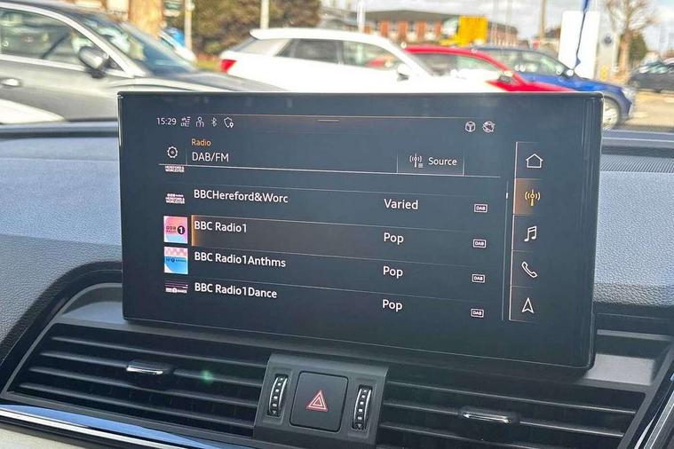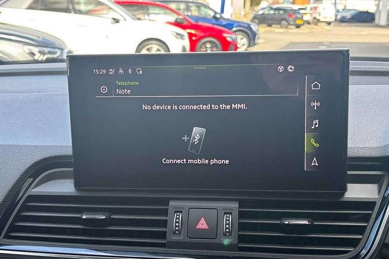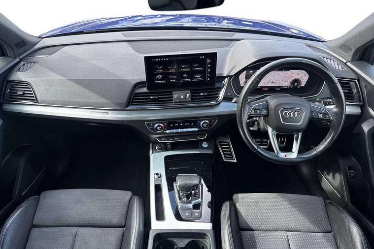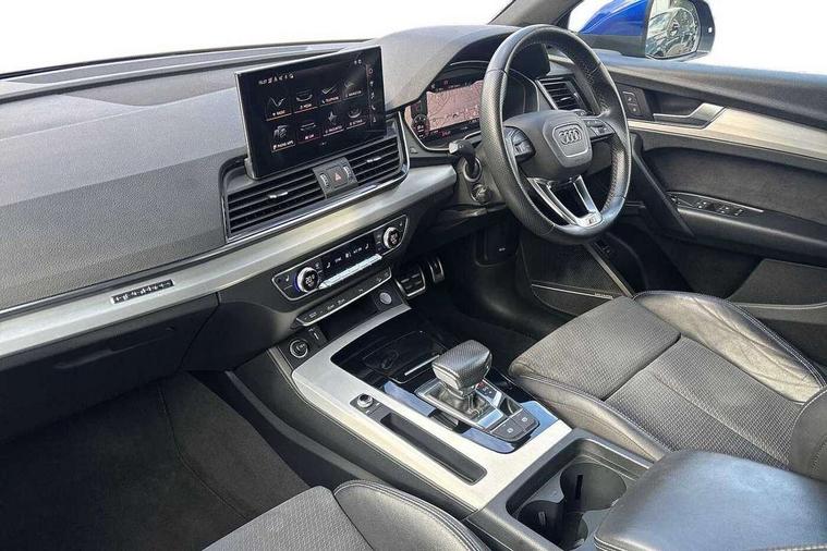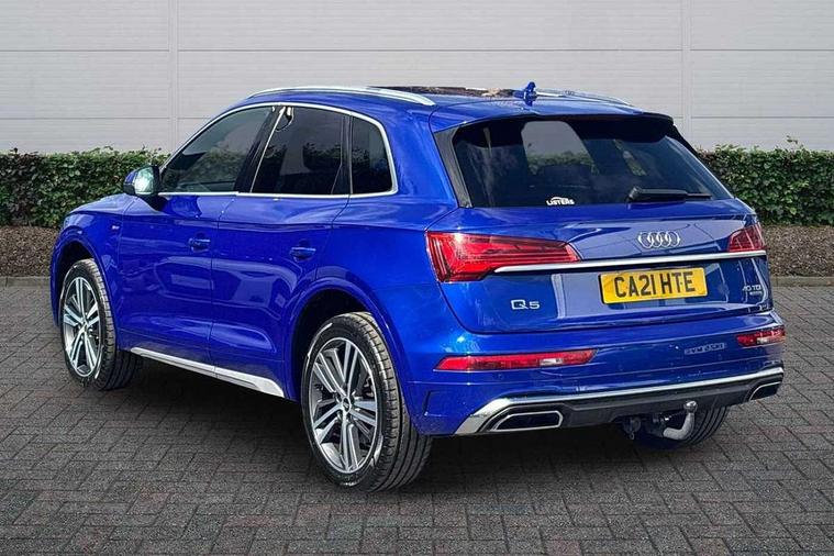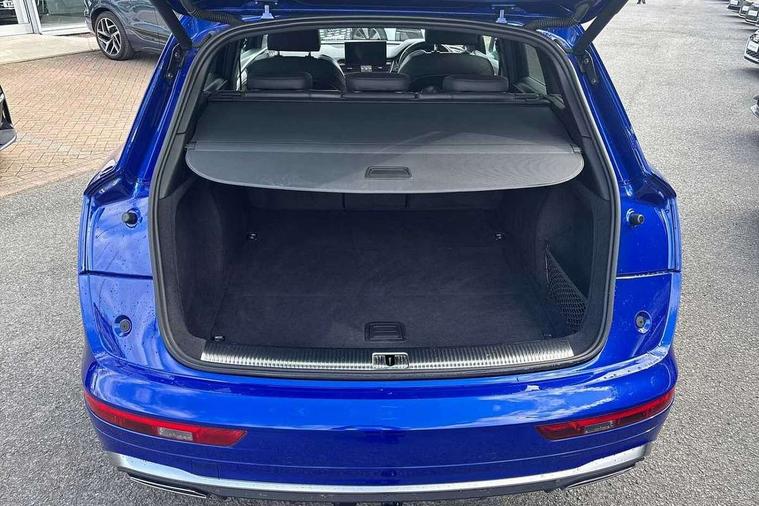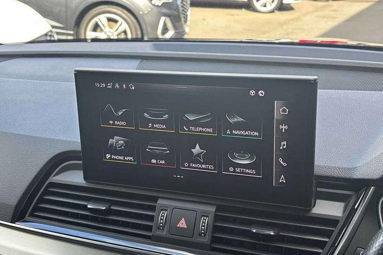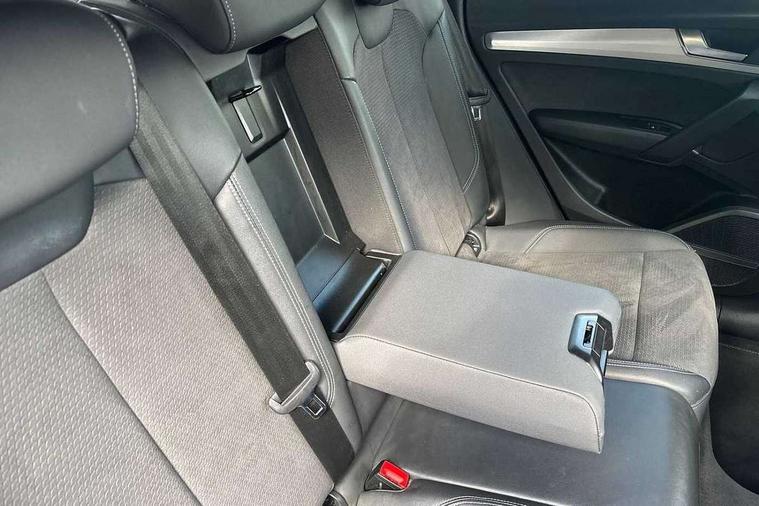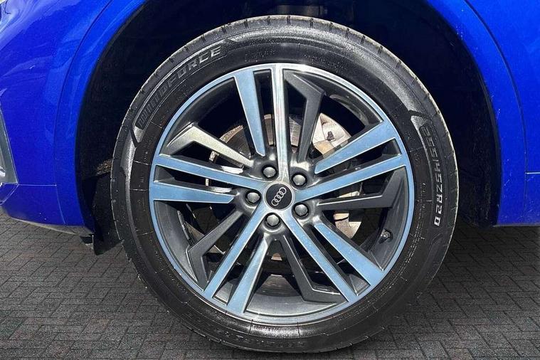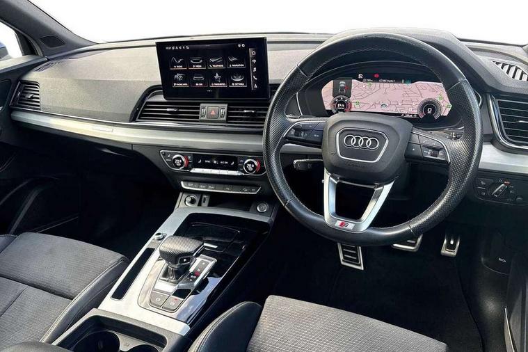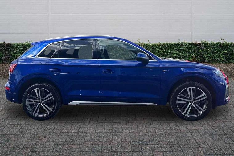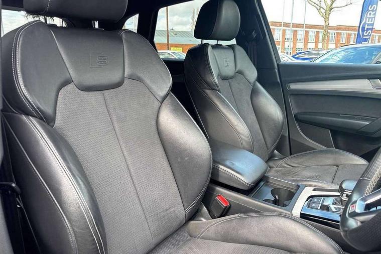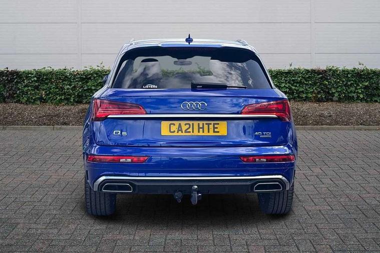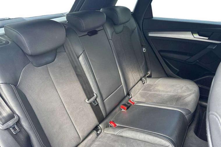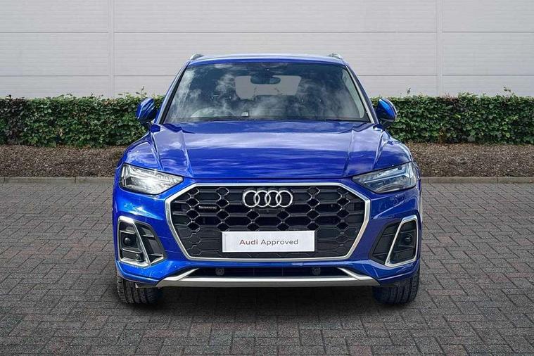 Amazon alexa Integration, Audi connect safety and service (e-call), Audi drive select, Audi virtual cockpit plus with 12.3" screen and three different layout designs, Audi wireless smartphone interface, Automatic start-stop system with coasting functionality and efficiency programme, Electro - mechanical power assisted steering, MMI navigation plus with 10.1" touch screen, Mobile telephone preparation - bluetooth interface, Power tailgate, Service interval indicator, Voice control system with Audi hotword activation "Hey Audi", Diesel particulate filter, Quattro on demand, 2 USB charging ports, DAB Digital radio, Acoustic windscreen, Aluminium roof rails, Audi matrix LED headlights with LED rear lights + dynamic front and rear indicators, Auto dimming rear view mirror, Automatic headlight adjustment, Automatic headlights and windscreen wipers, Body colour bumpers, Body colour door mirrors, Body colour rear diffuser with matt aluminium silver surrounds, Body colour underbody protection, Chrome plated exhaust trims, Door sills in Selenite silver, Electric adjustable/heated/folding door mirrors, Front air inlet surrounds in aluminium, Front and rear electric windows, Front radiator grille in honeycomb design, Headlight washers, Lower bumpers painted in contrast Manhattan grey, Rear chrome trim strip below lights, Rear privacy glass and rear side windows, Rear spoiler, Rear wiper, Roof bars, S Line badges on the front wings, S Line front and rear bumpers, S Line side skirts, 3 rear headrests, 40:20:40 split folding rear seat with rear centre armrest, Black cloth headlining, Contrast stitching on seats, steering wheel and gear lever gaiter, Deluxe 3 zone electronic climate control, Front centre armrest, Front/rear floor mats, Gear lever in black leather, Heated front seats, Height adjustable front head restraints, Height/reach adjustable steering column, Illuminated door sill trims with S logo, ISOFIX child seat mounting and top tether, Manual seat adjustment with 4-way electric lumbar support, Removable luggage compartment floor, Stainless steel pedals, Sunvisors with vanity mirrors, Tool kit, Trunk roller cover, High gloss pack - Q5, LED interior light pack - Q5, 3 point seatbelts on all seats, 6 airbags - Driver, front passenger, curtain and side airbags, Electrically operated child locks on rear doors, Electromechanical parking brake, Electronic stabilisation control including ABS, ASR and EDL, Front passenger airbag deactivation, Hill descent control, Hill hold assist, Multi collision brake assist, Pop-up bonnet for pedestrian protection, Pre sense city, Seat belt force limiter, Seatbelt monitoring, Tyre pressure warning, Warning triangle and first aid kit, Anti theft alarm, Anti-theft wheel bolts, Keyless Go access/ignition system, Matt brushed aluminium inlays,