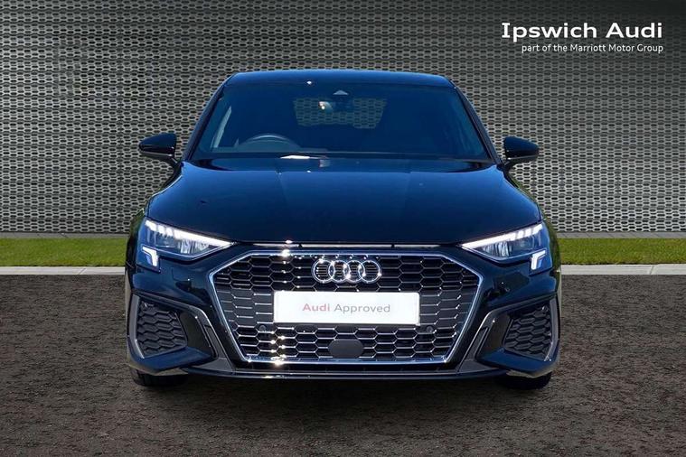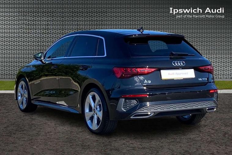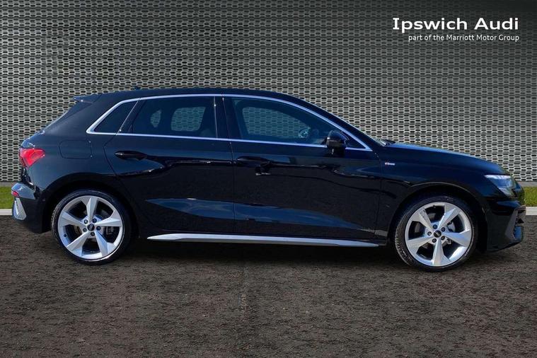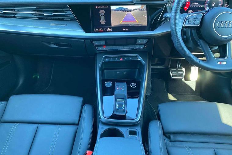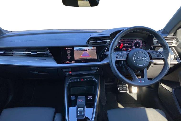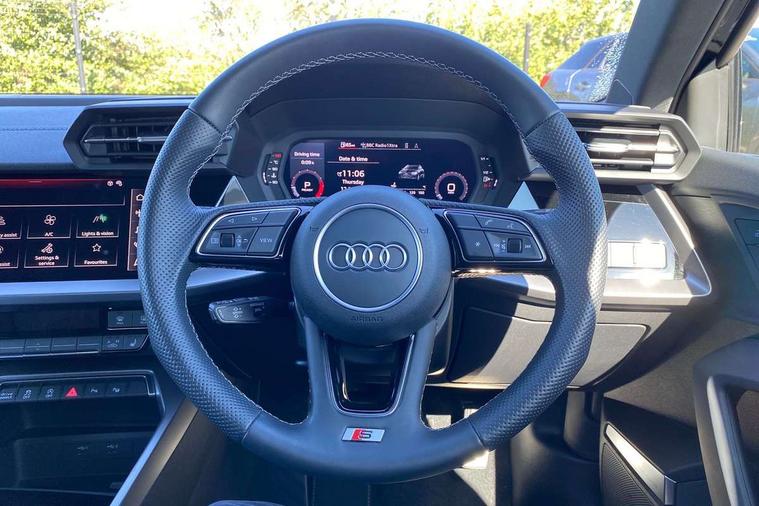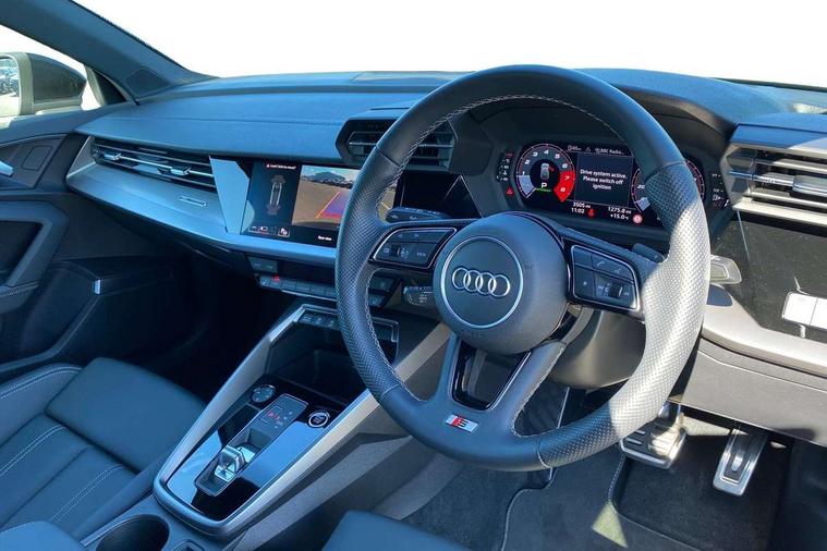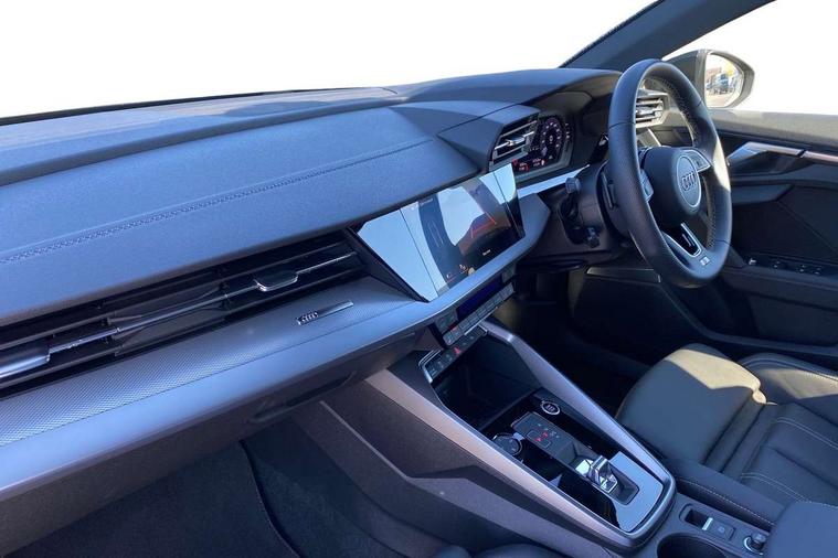 Audi drive select (Auto, Comfort, Dynamic, Efficiency and Individual), Audi smartphone interface, Audi Virtual Cockpit - 10.25" digital and colour instrument cluster, Automatic start/stop system with recuperation, Bluetooth interface, Camera based traffic sign recognition, Collision avoidance assistant, e-Call (emergency call), Electromechanical power speed sensitive steering, Lane departure warning system, MMI Navigation Plus with high resolution 10.1" colour touch screen display, Service indicator, Trip computer, Voice control system with natural language interaction, Sports suspension, 2xUSB-C connection with data and charging functions, 6 passive loudspeakers, DAB Digital radio, 3rd brake light, Acoustic glass windscreen, Aluminium window trim, Auto dimming frameless rear view mirror, Body colour exterior mirrors, Electrically adjustable/heated/folding/dimming door mirrors with kerb view includes integrated LED indications + kerb view function for passenger side, Front electric windows, Illuminated door sills with aluminium inserts at the front with S logo, LED daytime running lights, LED headlights with LED rear lights and dynamic rear indicators, Light and rain sensors, Privacy glass - dark tinted rear window, rear door and side windows, Rear electric windows, Rear side air outlets in grained matt black, Rear side wing doors, Rear wiper, S line bumpers, S roof spoiler, 12V socket and storage compartment in front centre console, 3 seat bench in 2nd row, 3 spoke leather multifunction steering wheel with paddle shift, 4 way electrically adjustable lumbar support for driver and front passenger, 60/40 split folding rear seat bench, Black cloth headlining, Dual zone electronic climate control, Front and rear centre armrest in artificial leather, Front and rear headrests, Front/rear floor mats, Height and reach adjustable steering wheel, Interior lighting - glove compartment light and right hand side, Luggage compartment floor covering, Manual boot compartment lid, Manually adjustable front seats, Seat side bolsters, Single front passenger seat, Stainless steel pedals and front footrest in black, Twin leather upholstery with front sports seats S embossed logo, Aluminium interior elements pack - A3 Sportback, LED interior lighting pack - A3 Sportback, S line styling pack - A3 Sportback, 3x3 point rear seat belts, Driver and front passenger airbag with passenger airbag deactivation, Electronic Stabilisation Control (ESC) including ABS, ASR and EDL, First aid kit with warning triangle and 2 safety vests, Front side airbags with head airbags and interaction airbag, Pre-sense front with pedestrian and cyclist detection, Seatbelt monitoring, Tyre pressure loss indicator, Anti theft alarm, Anti-theft wheel bolts, Electronically operated child locks, Immobiliser, Remote control central locking, Dark spectrum aluminium inlays, accent surfaces in the dashboard and centre console in platinum grey silk effect paint finish,