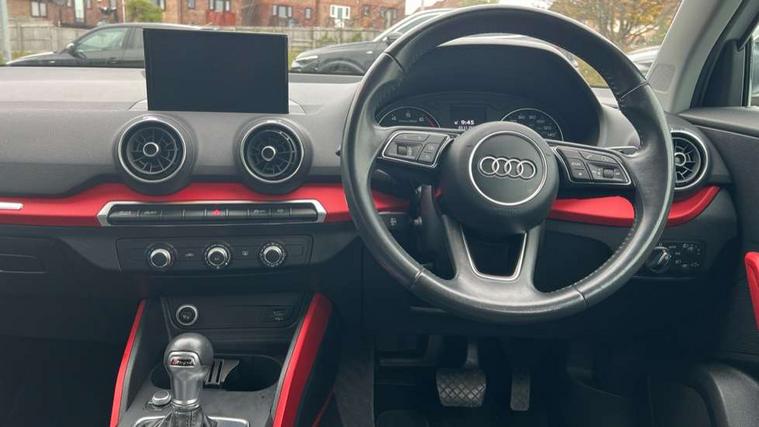 Audi drive select, Audi smartphone interface, Bluetooth hands free telephone connection, MMI - Multi Media Interface control system, MMI SD card Navigation, PAS, Service interval indicator, Voice control system, Dynamic suspension, Audi music interface, Aux input, CD player, DAB digital radio module, MMI radio plus with 7" colour MMI screen and MMI controller, USB port, Body colour door mirrors, Chrome exhaust tailpipe, Door mirror integrated indicators, Electrically adjustable and heated door mirrors, Front and rear electric windows, Rear wiper, Sunband for windscreen, Aluminium door sill trims, Centre console with storage/cupholders, Front and rear door pockets, Front and rear headrests, Front and rear velour floor mats, Front centre armrest, Front sports seats, Glovebox, Height adjustable front seats, Height/reach adjust steering wheel, ISOFIX on front passenger and rear outer seats, Storage compartment in rear centre console, Titanium grey cloth headlining, Non smoking pack - Q2, 3x3 point rear seatbelts, ABS+Electronic Brake force Distribution, Curtain airbags, Driver and passenger airbags, Driver and passenger side airbags, EDL + ASR, Electrically operated child locks on rear doors, Electromechanical parking brake, ESP, Multi-Collision braking, Pre-sense front with pedestrian recognition, Seatbelt warning light, Tyre pressure monitoring system, Warning triangle and first aid kit, Locking wheel bolts, Remote central locking, Thatcham category 1 alarm + immobiliser, Aluminium interior trim,