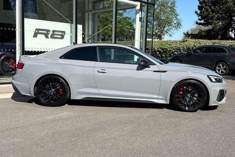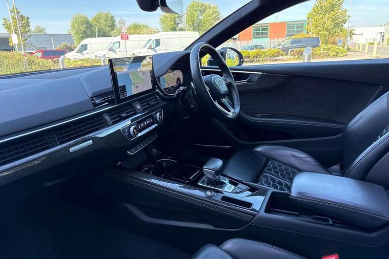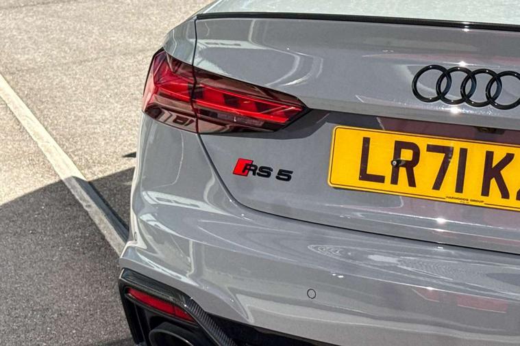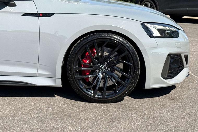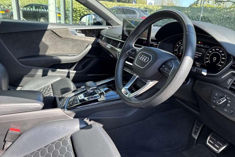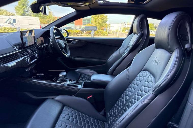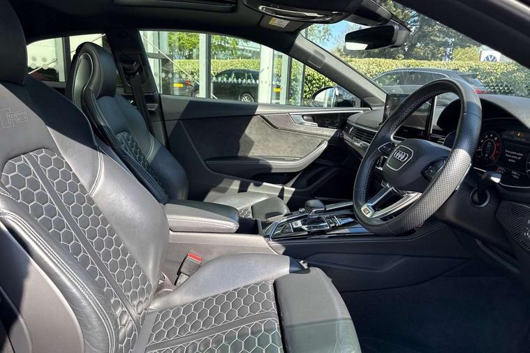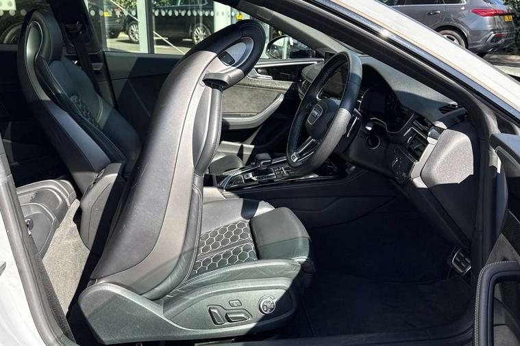 Audi connect safety and service (e-call), Audi connect with Amazon Alexa Integration, Audi parking system plus with front and rear sensors, Audi phone box with wireless charging, Audi side assist, Audi smartphone interface, Audi Virtual Cockpit with RS specific design and 12.3" display, Automatic start-stop system with coasting functionality and efficiency programme, Bluetooth interface, Electromechanical power steering, Email, calendar and text messages displayed via MMI, MMI Navigation plus with MMI touch includes 10.1" high resolution colour MMI display, 3D map, Rear view camera, RS Audi drive select, RS drive modes on steering wheel, Service interval indicator, Voice control system, Quattro sports differential, Audi sound system, DAB digital radio reception, Audi Beam uses LEDs to project the RS logo, Audi matrix LED headlights with LED rear lights + dynamic front and rear indicators, Audi rings and lettering glossy black, Auto dimming rear view mirror, Body colour door handles, Electric front windows, Electric rear windows, Electrically folding, adjustable and heated door mirrors with integrated LED side indicators and kerb view function for passenger side, Exterior mirror housing in high gloss black, High beam assistant, Larger singleframe grill, LED daytime running lights, Privacy glass with rear acoustic glazing, Rain and light sensors, RS bumper with quattro lettering, RS5 badges on grille, the front wing panels and rear, RS5 dual branch chrome tailpipes with left and right oval pipes, Windscreen with acoustic glazing, 2 x USB charging port with aux input socket, 3 spoke leather heated multi-function plus steering wheel with RS badging, 40:20:40 split folding 2 seater rear seat bench with rear centre armrest, Aluminium shift paddles, Black cloth headlining, Deluxe 3 zone electronic climate control, Electrically adjustable front seats, Fine Nappa leather upholstery, Front centre armrest, Front head restraints, Front/rear floor mats, Heated front seats, Illuminated door sill trims with RS5 logo, ISOFIX child seat mounting and top tether, Leather door armrests and knee pad, Pneumatic massage function, Rear head restraints, RS Specific perforated leather gear lever knob with contrast stitching, RS Super Sports seats with contrast honeycomb stitching, Stainless steel pedals, Tool kit, Carbon black styling pack - RS5, LED Interior light pack - RS5, 2 x 3-point rear seatbelts, 6 airbags - Driver, front passenger, curtain and side airbags, Electromechanical parking brake, Electronic Stabilisation Control (ESC) including ABS, ASR and EDL, Front passenger airbag deactivation, Height adjustable front seatbelts, Hill hold assist, Multi collision brake assist, Pop-up bonnet for pedestrian protection, Pre sense city, RS Model enhanced braking system, Seatbelt monitoring, Tyre pressure warning, Warning triangle and first aid kit, Anti theft alarm system, Anti theft wheel bolts, Immobiliser, Keyless Go, Remote control key with RS emblem, Carbon twill inlays, 20" 5 Segment spoke Evo style design audi sport alloy wheels in glossy black, Tyre repair kit,
