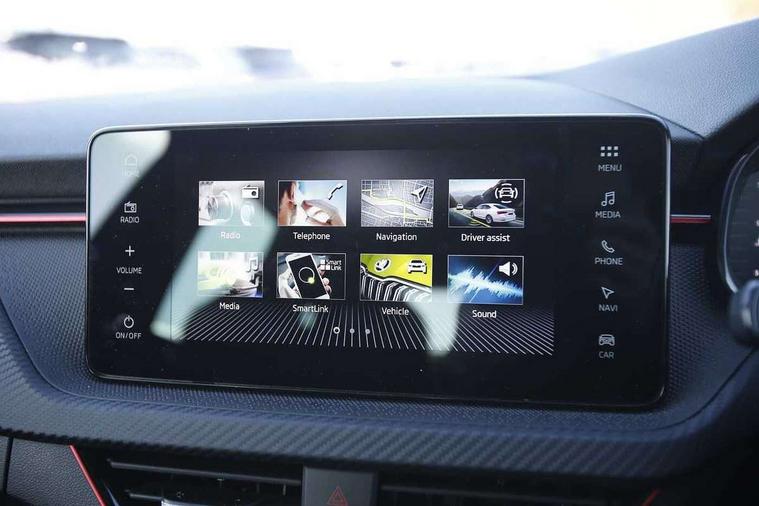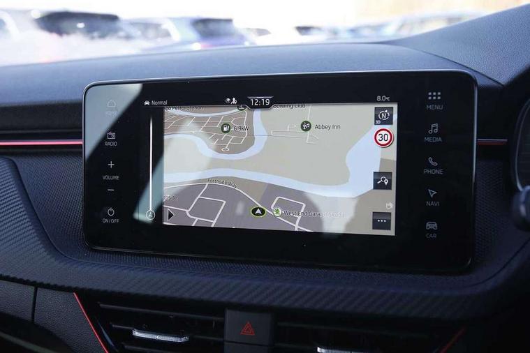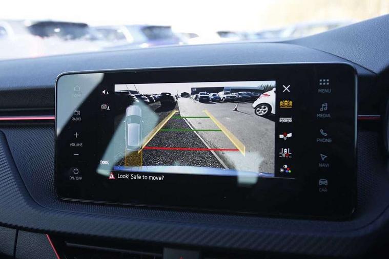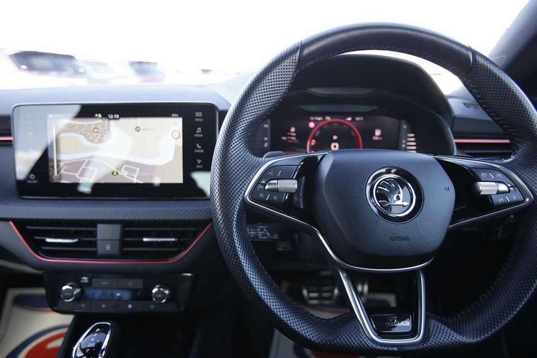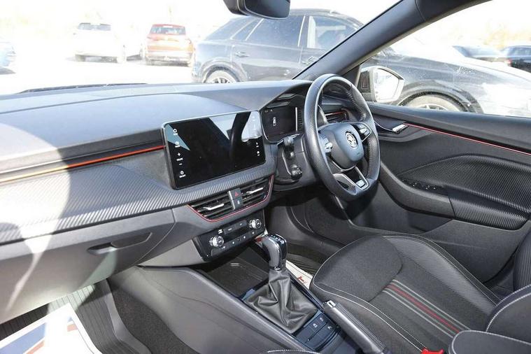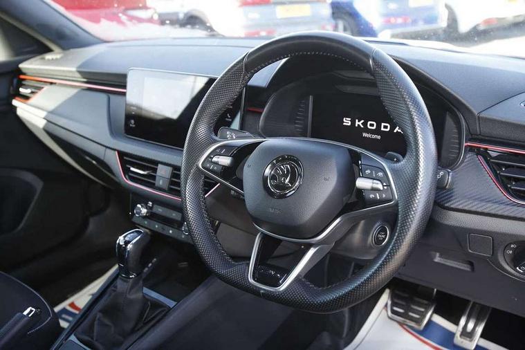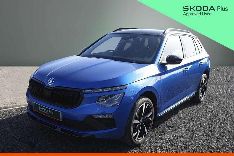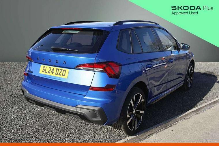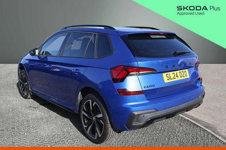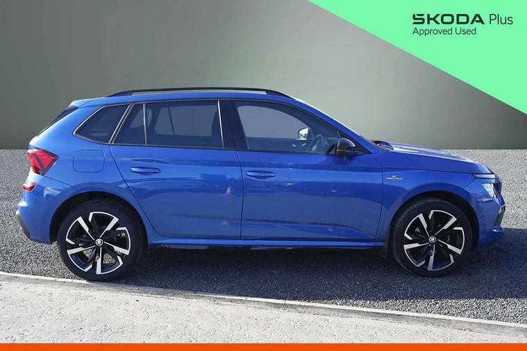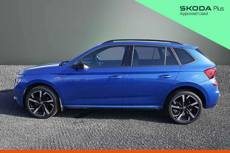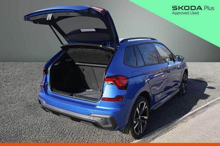 Advanced driver attention and drowsiness monitor, Bluetooth system, E-call, Front assist system, PAS, Rear parking sensors, Service indicator, Speed limiter, Traffic sign recognition, Virtual cockpit with 10.25" display, Voice control system, Wireless smartlink, 4 USB C ports, 8 speakers, 9.2" Skoda navigation display, DAB Digital radio, Auto dimming rear view mirror, Automatic headlight control with coming home and leaving home feature, Automatic headlights, Black door mirrors, Black radiator grille, Black rear diffuser, Black roof spoiler, Body colour bumpers, Body colour door handles, Boot lettering in black, Extended tailgate glass, Front and rear electric windows, Heated rear window, LED daytime running lights, LED high beam, LED low beam, LED third brake light, Monte carlo plaque, Panoramic sunroof with black roof rails, Privacy glass, Rear side wing doors, Rear wiper, Ticket holder inside windscreen, 12V socket in luggage compartment, 3 seat bench in 2nd row, Aluminium pedals, Ambient lighting in white/red, Art leather carbon decor inserts, Art leather carbon door inserts, Black roof lining, Cargo elements, Chrome inner door handles, Driver and passenger sun visors with vanity mirror, Dual zone climate control, Front and rear roof lights, Front centre armrest, Front head restraints, Glove compartment with illumination, Height adjustable driver seat, Height adjustable front passenger seat, Ice scraper, Inner circulation control with pollen filter, ISOFIX on front passenger seat, Isofix preparation for back seats, Leather gearknob and handbrake lever, Manual lumbar support for front seats, Monte Carlo cloth upholstery, Net package and top tether hooks in boot space, Net under rear shelf, Pocket on the back of both front seats include mobile phone pockets, Rake/reach adjustable steering wheel, Reading lights, Rear centre armrests, Red hotstamping, Single front passenger seat, Sports seats, Textile floor mats, Third rear headrest, Top tether for front passenger seat, Umbrella in driver's door, Light and view plus package - Kamiq, 3x3 point rear seatbelts, Airbags - driver and front passenger, Disc brakes, ESP, Extended and predictive pedestrian/cyclist protection, Front passenger airbag deactivation switch, Front side airbags with curtain airbags, Hill hold control, Manual leather parking brake, Manual rear child locks, One tone horn, Seatbelt reminder for driver an co-driver, Traction control, Tyre pressure monitor, Anti-theft alarm system with interior monitoring, backup horn, towing protection and remote central locking with SAFE system, Anti-theft wheel bolts, Electronic engine immobilizer, 18" Ursa black diamond cut alloy wheels,
