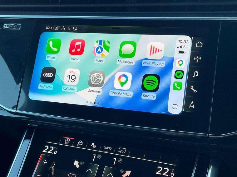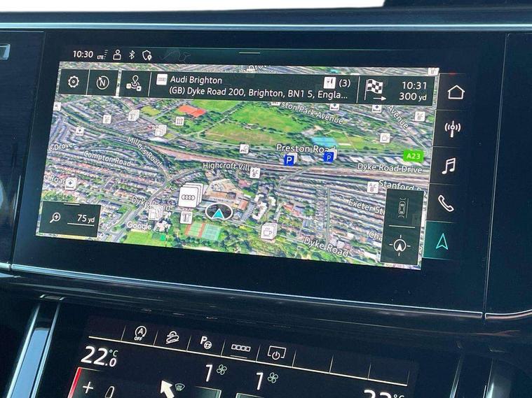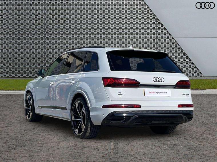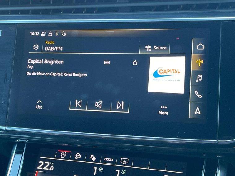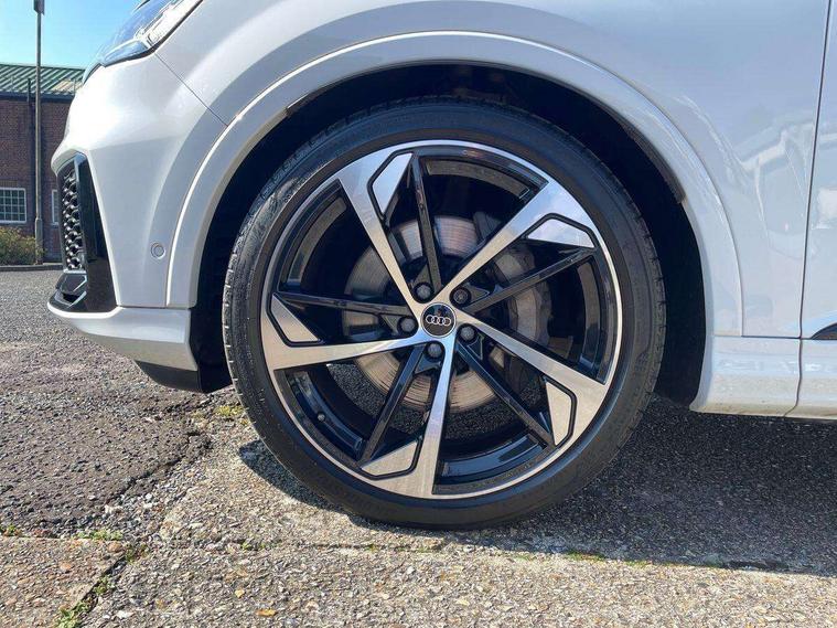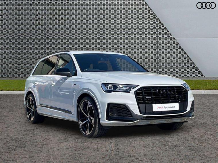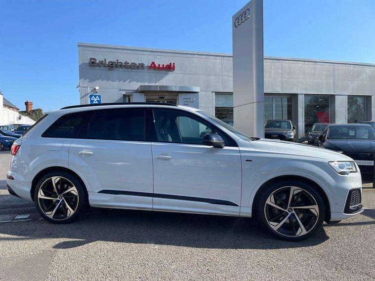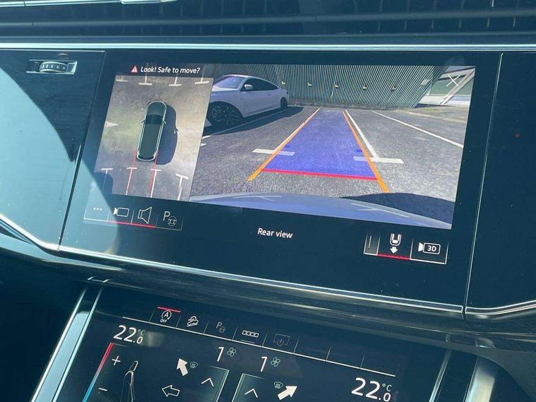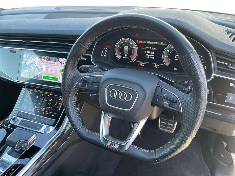 Audi connect safety and service (e-call), Audi connect with Amazon Alexa Integration, Audi drive select (Auto, Comfort, Dynamic, Efficiency, Individual, Off-road and All road), Audi smartphone interface includes wireless Apple carplay/Android Auto, Bluetooth interface, Camera based traffic sign recognition, Electromechanical steering, MMI navigation plus with MMI touch screens includes 10.1" and 8.6" screens with haptic feedback, Natural voice recognition, Parking system plus with 360 degree display (front, rear and side sensors) - acoustic and visual park assist system, Power operated tailgate, Rear view camera, Start/stop system, 48V Mild hybrid technology, 85 litre fuel tank, Adaptive air sports suspension, Quattro all wheel drive with self locking centre differential, Audi music interface - front 2 USB-C ports with charger and data functions, Audi sound system with 6 channel amplifier, 180 watt amplifying capacity and 10 loudspeakers including subwoofer, DAB digital radio module, 3rd brake light, Audi matrix LED headlights with dynamic front and rear indicators, Auto dimming frameless rear view mirror, Black roof rails, Bumpers in contrast paint scandium grey finish includes door trim and wheel arch trim strips, inlays in door strip contain quattro embossing, Electrically adj heated/folding + automatically dimming exterior mirrors with memory + automatic kerb side function for passenger side exterior mirror, Heat insulating glass in windshield, Integrated LED indications in door mirrors, LED daytime running lights, LED rear tail lights, Privacy glass - dark tinted rear and rear side windows from B-pillar backwards, Rear side wing doors, Rear wiper, 2 seat bench in 3rd row, 3 seat bench in 2nd row, 4 zone deluxe automatic climate control, 7 seat layout with ISOFIX points for the front passenger seat and rear passenger seat, Black cloth headlining, Comfort front centre armrest, Electric adjustable front seat with 4 way lumbar support, driver memory functionality, Folding rear seats, Front head restraints, Front/rear floor mats, Heated front seats, Illuminated door sill trims with S logo, LED interior ambient lighting, Luggage compartment cover, Luggage compartment sill protection in stainless steel, Rear head restraints, Single front passenger seat, Stainless steel pedals, Sunvisors with illuminated vanity mirrors, Tool kit, Titanium black styling pack - Q7/SQ7, 3 point seatbelts on all rear seats, Audi pre sense front, Child locks on rear doors, Driver and front passenger, front side and curtain airbags, Electromechanical parking brake, Electronic Stabilisation Control (ESC) including ABS, ASR and EDL, Extended pedestrian protection measures, Hill hold assist, Seatbelt monitoring, Tyre pressure loss indicator, Warning triangle and first aid kit, Anti theft alarm, Anti-theft wheel bolts and wheel loosening detection, Keyless Go, Remote central locking, Polished oak trim with grey finished, Tyre repair kit,