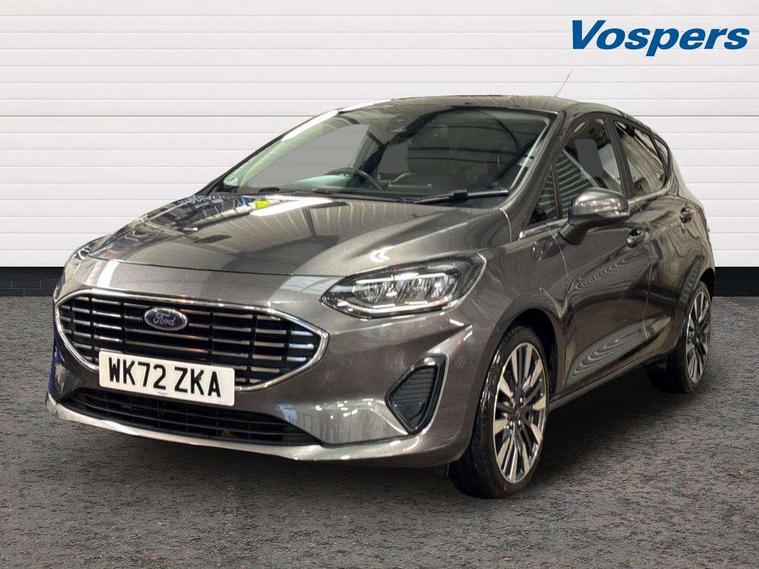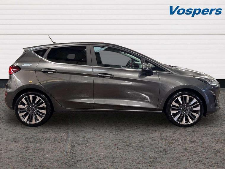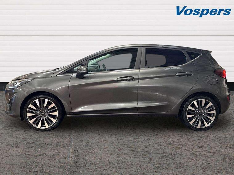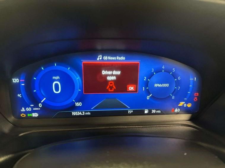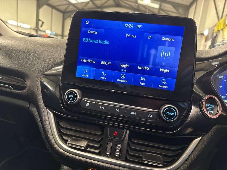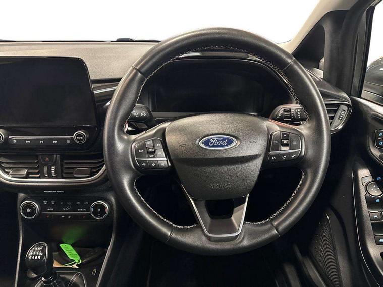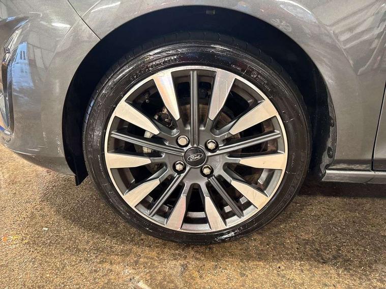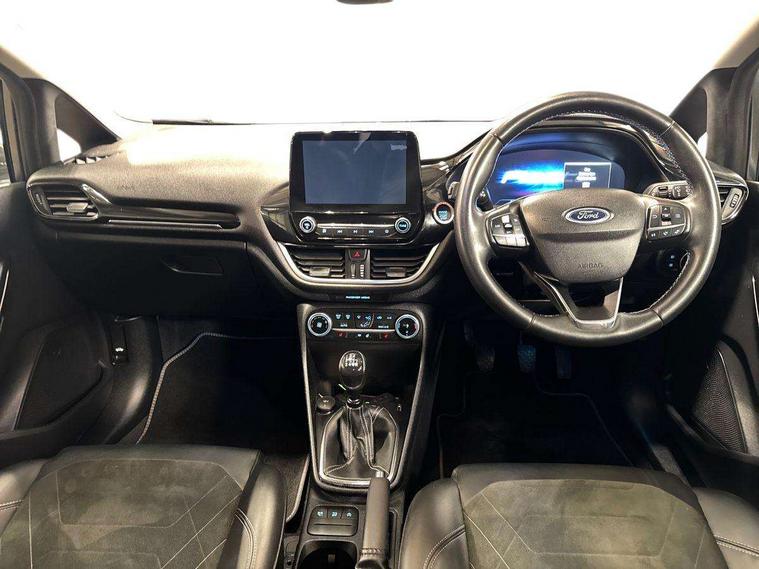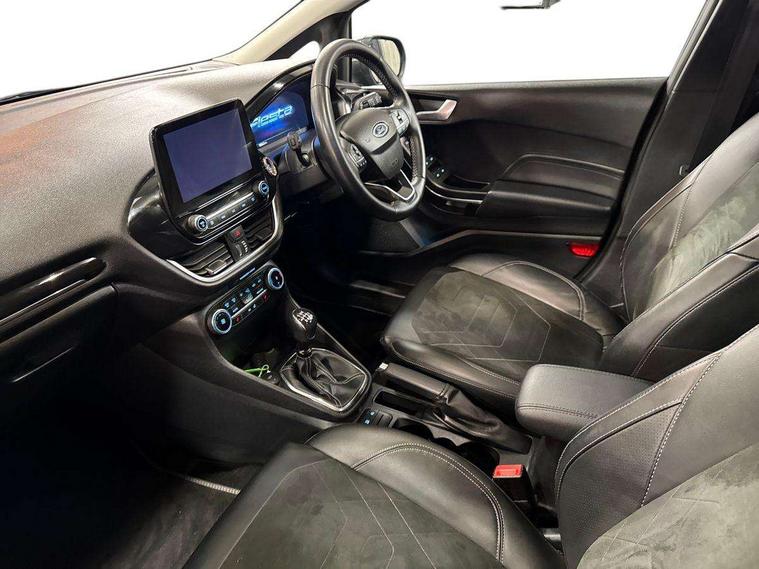 4.2" TFT instrument cluster screen, Bluetooth system, Electric power steering, Ford easy fuel, Rear parking distance sensors, Selectable drive modes (Normal, Sport, Track), Traffic sign recognition, Trip computer, 2 USB ports, Auxiliary input socket, B&O Premium audio system with 8" touchscreen, 10 speakers, 360 degree sound system, Ford SYNC 3 navigation system and Ford pass connect, DAB Digital radio, Steering wheel mounted controls, Auto high beam, Body colour bumpers, Body colour door handles, Body colour rear spoiler, Body coloured electrically operated and heated door mirrors with side indicators, Chrome beltline trim, Chrome front grille, Chrome lower window surround, Cornering front fog lights, Electric front windows/one touch facility, Electric rear windows, LED Night signature to rear lights, Power foldable door mirrors with puddle lights, Quickclear heated windscreen, Rain sensing wipers and auto dimming rear view mirror, Rear privacy glass, Rear wiper, 3 spoke leather trimmed steering wheel with audio control, 60/40 split folding rear seat, Adjustable head restraints, Boot carpet, Centre console with opening armrest, 2x cupholders, 12v and USB, Chrome inner door handles, Drivers and Passenger lumbar support, EATC - Electronic Auto Temperature control, Footwell illumination, Front floor mats in velour, Front map reading lights, Front seat and rear pockets, Height adjustable passenger seat, Illuminated glovebox, Leather gaiter, LED ambient lighting, Load area light, Luxury woven headliner, Manual 4-way driver seat adjust, Overhead console with sunglasses holder, Pollen filter, Rake/reach adjustable steering wheel, Sensico partial premium upholstery, Sensico wrapped steering wheel, NCAP Pack - Fiesta, 3 point seatbelts on all rear seats, ABS+EBA, Curtain airbags, Driver and passenger airbags, Drivers knee airbag, Electronic stability control with hill start assist, Front passenger airbag deactivation, Front side airbags, Seatbelt warning, Two tone horn, Tyre pressure monitoring system, Ford keyfree system with Keyless entry and keyless start, MyKey system, Remote central locking & engine immobiliser, Thatcham Cat.1 alarm, 17" 8 spoke alloy wheels,