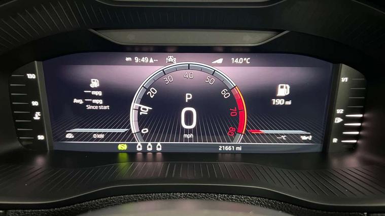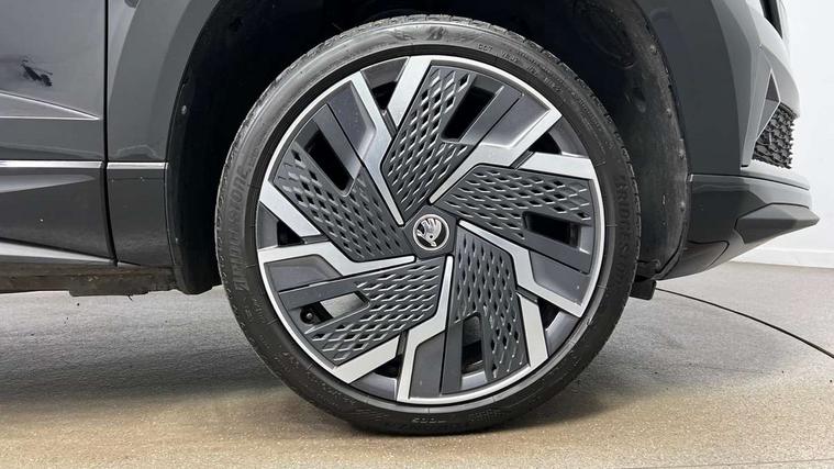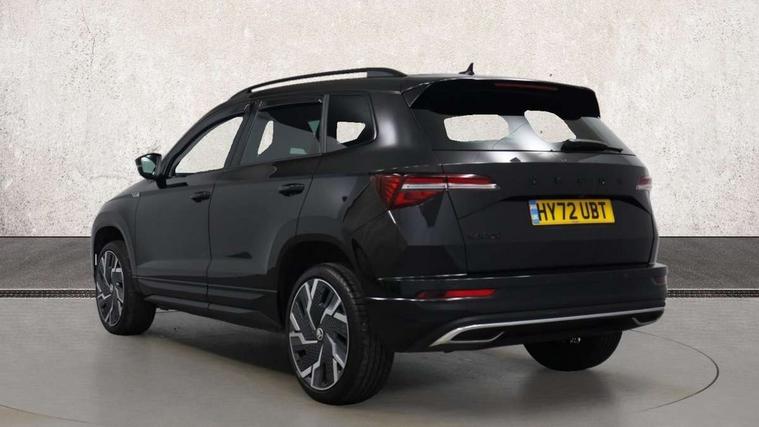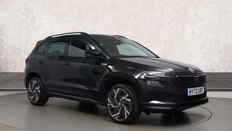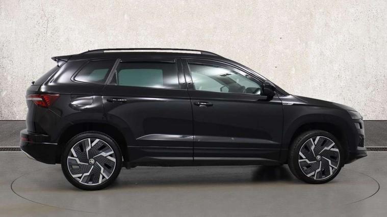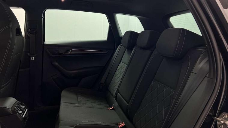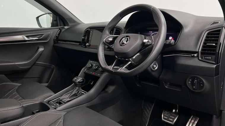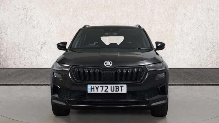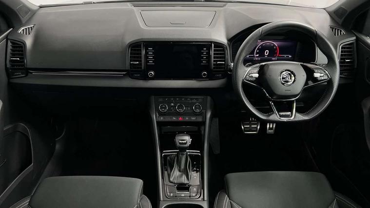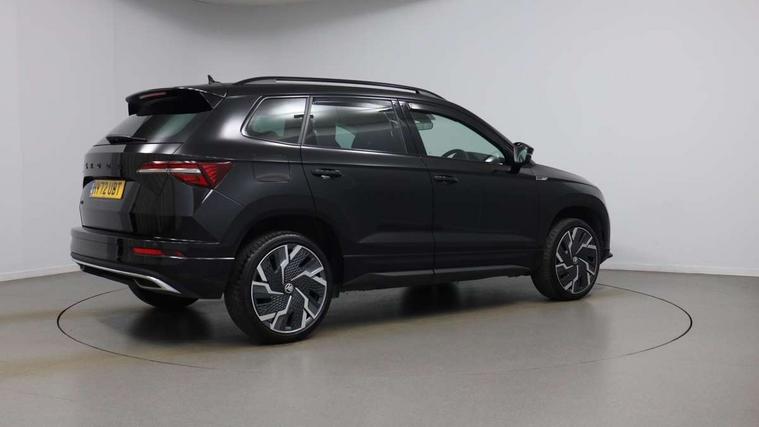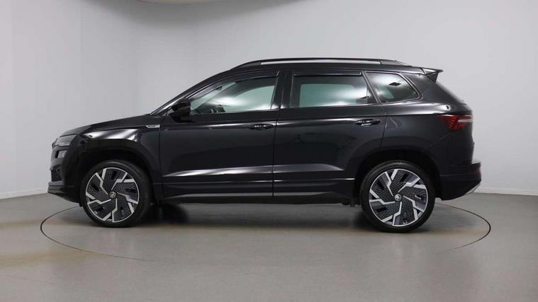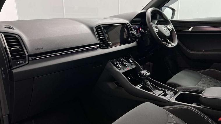 8" Digital display, Care connect, Driver fatigue sensor, Emergency services call system, Outside temperature gauge, Service interval indicator, SmartLink wireless for Apple and wired for Android, Start/stop system with regenerative braking, USB C Port x 2 in front centre console, Virtual pedal with electrically operated boot door, 8 speakers, DAB radio with Bluetooth, USB connection, Acoustic glass, Aero front windscreen wipers with intermittent function, Auto dimming rear view mirror with light and rain sensors, Black door mirrors, Black electric window control buttons, Black radiator grille, Black roof rails, Body colour door handles, Dynamic headlight range control with cornering light function, Electric front and rear windows with child proof lock, Front door steps with SportLine logo, Heated rear windscreen, LED daytime running lights, LED rear lights with high functionality welcome effect and dynamic indicators, Light assistant (coming/leaving home/tunnel light), Panoramic sliding sunroof, Plastic scuff plates, Privacy glass, Protective door side sills in body colour, Rear diffuser, Rear side wing doors, Rear spoiler, Rear window wiper with washer system and intermittent control, Safety reflectors on front doors, Skoda lettering on tailgate in black, Sportline badge on front fender, Sportline decorative inserts with badging, Sports front and rear bumpers, 1.5 litre bottle holders in driver and front passenger door panels, 12V socket in boot, 12v socket in front centre armrest with storage compartment and rear air vents, 2 Folding hooks and nets in boot, 3 rear height adjustable headrests, 3 seat bench in 2nd row, 3 spoke leather sports multifunction steering wheel and silver stitching with gear shift paddles, 4 foldable roof handles with rear coat hooks, Black floor carpet, Black roof headlining, Chrome inner door handles, Double sided boot floor, Foldable hooks in the boot, Front head restraints, Height adjustable front three point seats belts with tensioners, Height/reach adjust steering wheel, Ice scraper, Illuminated glovebox, Illuminated luggage compartment, Isofix child seat preparation outer rear, Manual lumbar support for front seats, Pen holder, Pollen filter, Rear boot cover, Rear reading lights, Rear seats fixed folding and divided 60:40, Rubbish bin door, Safety vest holder, Single front passenger seat, Storage box in upper central dashboard closed, Sunvisors with illuminated vanity mirrors, Textile floor mats, Ticket holder, Titan black interior ceiling, Tool kit, Welcome animation with sportline logo, Light Pack - Karoq, Parking pack - Karoq, Automatic door unlocking in case of crash, Automatic fuel cut off in case of crash, Child locks on rear doors, Driver airbag, Electronic parking brake with auto hold function, Emergency rear braking signal, ESC including ABS, MSR, ASR, EDS, HBA, DSR, RBS, MKB and traction control, Front side airbags, Hill hold control, Knee airbags, Passenger airbag with switch-off function, Pedestrian monitor, Seatbelt reminder signalisation and pretensioner for all seats, Three point seatbelts rear, Two tone horn, Tyre pressure display, Tyre pressure monitor, Alarm with interior monitoring, back up horn and tilt sensor with safe function, Electronic engine immobiliser, Keyless entry and start/stop, Remote central locking with 2 remote folding keys, Black air vent surround, Black centre console, Satin black dashboard, Satin black door trim, 19" Sagitarius anthracite alloy wheels with matt black aero inserts, Anti-theft wheel bolts protection, Matt black aero hub caps, Storage on wheel cover,