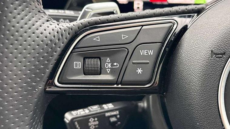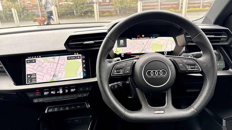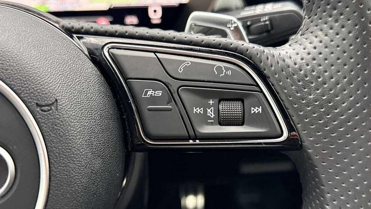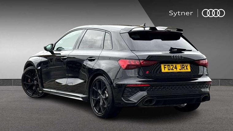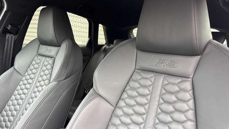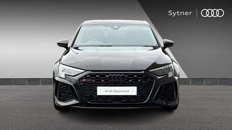 Audi smartphone interface, Audi virtual cockpit with RS specific display 12.3" full colour digital instrument cluster, Automatic start/stop system with recuperation, Bluetooth interface, Collision avoidance assistant, Emergency e-call, Lane departure warning system, Legal emergency call, Manual boot opening, Parking assist with parking system plus, Progressive power assisted steering, Quattro permanent four wheel drive, Rear suspension, DAB Digital radio, 3rd brake light, Acoustic glass windscreen, Audi beam uses LEDs to project the Audi sport logo onto the ground as you exit your RS 3, Audi matrix LED headlights, LED rear lights, dynamic front and rear indicators and headlight cleaning system, Auto dimming rear view mirror, Body colour roof, Carbon exterior door mirror, Carbon fibre engine cover, Carbon roof spoiler, Daytime running lights, Door mirrors - electrically adjustable, heated, folding and auto dimming on both sides, Headlight washers, Light and rain sensors, Privacy glass - dark tinted rear and rear side windows from B-pillar backwards, Rear side wing doors, Rear window wiper and washer system, RS exterior features in gloss black, RS sports exhaust system, Side skirt in carbon inlay, 3 seat bench in 2nd row, 40/20/40 split folding rear seat bench, Black cloth headlining, Dual zone electronic climate control, Front and rear headrests, Front centre armrest, Front sports seats RS embossed logo, Front/rear floor mats, Heated front seats, Honeycomb stitching and RS embossing, Illuminated door sill trims inlays in aluminium with RS 3 logo, Illuminated vanity mirror, Manually adjustable front seats, RS emblems, Single front passenger seat, Stainless steel pedals and front footrest in black, Tool kit, Aluminium interior elements pack - RS3, Ambient lighting pack - RS3, MMI navigation plus with MMI touch - RS3, RS bodystyling - RS3, Storage Pack - RS3, 3x3 point rear seat belts, ABS/EBD, ASR, Audi pre sense front, Driver/Front Passenger airbags, EDL, ESC - Electronic Stability Control + traction control, Front passenger airbag deactivation, Front side airbags with head airbags and interaction airbag, Hill hold assist, Seat belt reminder with passenger presence detection in rear, Tyre pressure loss indicator, Warning triangle and first aid kit, Anti theft alarm, Anti-theft wheel bolts, Electronically operated child lock, Remote control central locking, Carbon inlays, accent surfaces in the dashboard and centre console in platinum grey silk effect paint finish, Full decorative carbon trim, 19" 5 Y spoke matt black alloy wheels, Tyre repair kit,